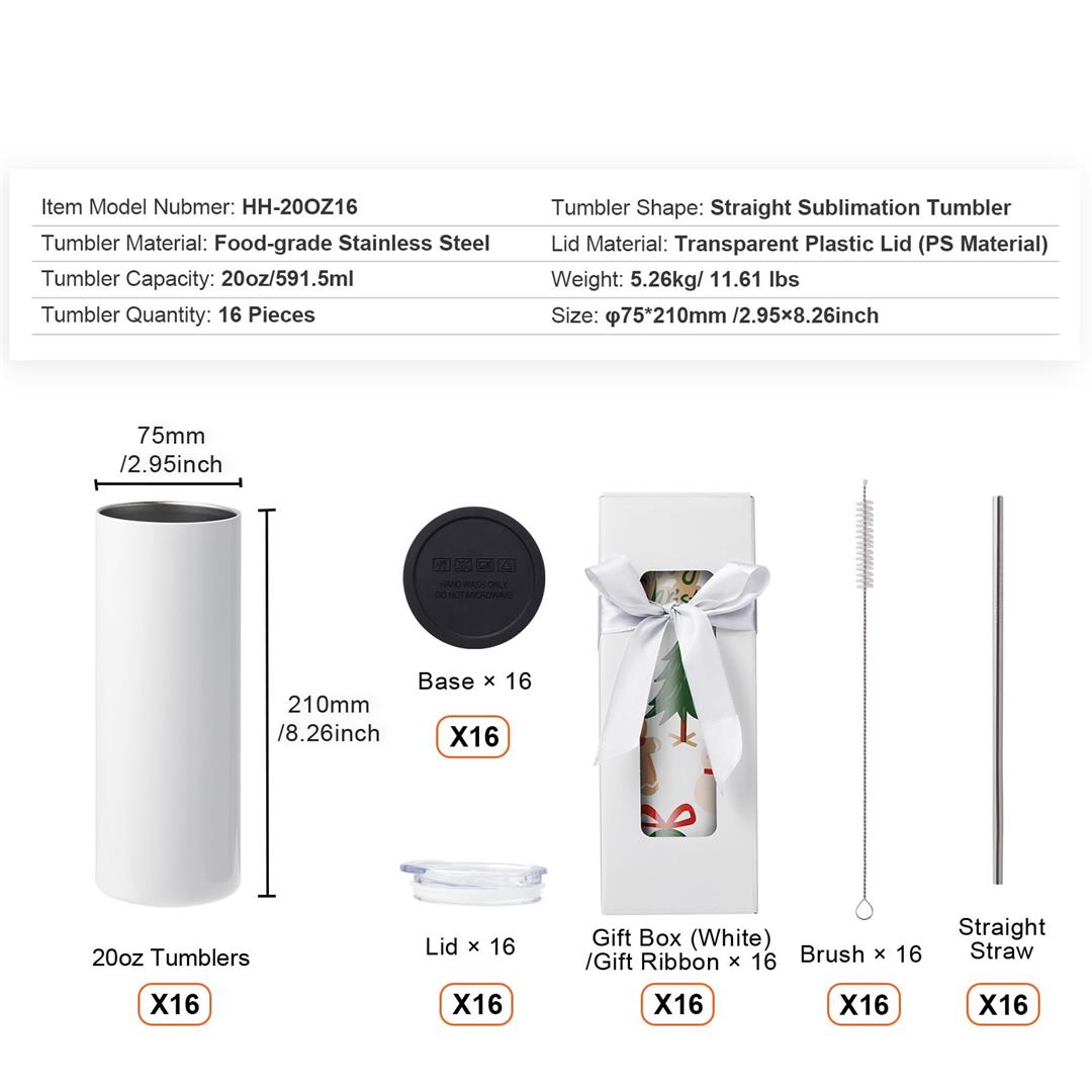 Product Description Discover the Possibilities with KFFKFF Premium Sublimation Tumblers! Introducing our exceptional sublimation tumbler set crafted from FDA-approved food-grade stainless steel. With its innovative heat sublimation coating, you can now showcase your own personalized designs. Savor your favorite beverages while unleashing your creativity through unique artworks. This sublimation tumbler set also comes with a variety of accessories, making it an ideal gift option. High-Quality Construction Crafted from premium food-grade stainless steel, our KFFKFF blank sublimation tumblers are built to last. With 8 hours of insulation for hot drinks and 12 hours for cold beverages, these tumblers are designed to keep your drinks at the perfect temperature. The heat sublimation coating adds a touch of creativity, making each tumbler a one-of-a-kind piece of art. Leak-Proof Design Our KFFKFF sublimation cups feature excellent sealing to ensure zero leakage risk. Equipped with a sealed silicone ring, a straw seal, and a user-friendly PS material cup cover, these tumblers are perfect for on-the-go use. Whether you’re commuting to work or heading out for a hike, our tumblers will keep you dry and refreshed. Effortless Customization Creating your unique sublimation tumbler is a breeze with our KFFKFF tumblers. With just four simple steps, you can personalize your tumbler to your heart’s content. Place it in the oven or sublimation machine, and in no time, your customized tumbler is ready to go. Complete Set of Accessories We’ve thought of everything with our KFFKFF sublimation tumblers bulk. Each set includes straight straws, brushes, lids, bases, shrink wraps, gift boxes, and gift ribbons, providing you with all the accessories you need. Whether you’re unleashing your creativity or searching for the perfect gift, our comprehensive set has got you covered. Meaningful Gift Celebrate special occasions with our KFFKFF tumblers for sublimation. Whether it’s New Year’s, birthdays, anniversaries, or business events, these tumblers are the perfect way to express your sentiments. They’re not just a gift, but also a cherished memory. Generous Capacity Enjoy your favorite beverages in our spacious 20-ounce KFFKFF sublimation tumbler. With its large capacity design, this tumbler can accommodate both hot and cold drinks with ease. Sip on your morning coffee or indulge in a refreshing iced tea, our tumbler can handle it all. Specifications Item Model Number: HH-20OZ16 Tumbler Material: Food-grade Stainless Steel Tumbler Capacity: 20 oz/591.5 ml Tumbler Quantity: 16 Pieces Tumbler Shape: Straight Sublimation Tumbler Lid Material: Transparent Plastic Lid (PS Material) Weight: 5.26kg/ 11.61 lbs Package Content 16 x Sublimation Tumblers 16 x Straight Straw 16 x Brush 16 x Lid 16 x Base 16 x Shrink Wrap 16 x Gift Box 16 x Gift Ribbon