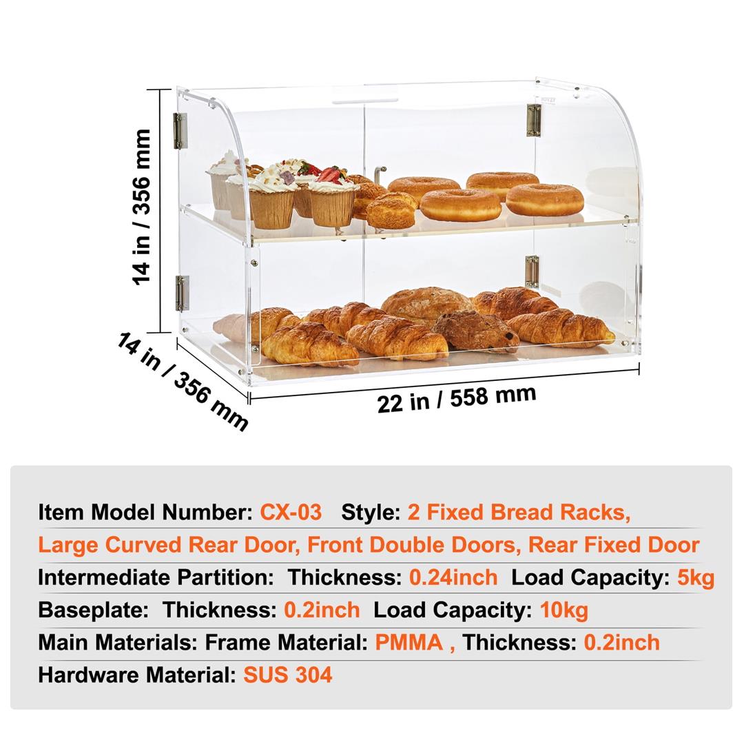 Product Description Bakery Display Case with 2 Shelves The KFFKFF bakery display case is a stylish and functional counter display cabinet designed to showcase your delicious baked goods. Crafted with precision, this display case is made from high-quality clear acrylic material, ensuring optimum visibility of your products from all angles. The thickened fixed partition inside provides convenient storage and organization for your pastries, cakes, and other treats. The magnetic suction rear double-opening door adds a touch of elegance and allows for easy access to your delectable creations. Whether you own a bakery, cafe, or restaurant, this versatile display case is perfect for showcasing your baked goods in various settings. We have also upgraded the packaging to ensure that your display case arrives in perfect condition, ready to enhance your product charm and increase impulse sales. Invest in the KFFKFF bakery display case and elevate your bakery to new heights of success. KFFKFF Clear Acrylic Display Case Experience the elegance and functionality of the KFFKFF Clear Acrylic Display Case. Crafted from transparent acrylic, this display case offers a light transmittance comparable to glass, allowing for a clear and comprehensive presentation of your baked goods. Customers will be enticed by the enticing display, making it easier for them to select their favorite desserts and increasing their desire to make a purchase. The lightweight acrylic material not only ensures easy mobility but also minimizes transportation costs, making it a practical choice for your business. Enhanced Load-bearing Capacity Upgrade your display capabilities with the KFFKFF Clear Acrylic Display Case’s thickened fixed partition. With a thickness of 6mm, this partition can support a maximum load of 5kg, providing better load-bearing capacity. Showcase a greater variety of goods and enjoy the benefits of a sturdy and stable internal structure that ensures a longer product lifespan. Convenient Double-opening Door The KFFKFF Clear Acrylic Display Case features a magnetic suction rear double-opening door for added convenience. Equipped with sturdy double hinges and top and bottom magnetic suction devices, this door makes it easier to align and close the door panel. By preserving the freshness and deliciousness of the food inside the display cabinet, it ensures that your baked goods remain enticing to customers. Store clerks will also appreciate the convenience of replenishing new items from the counter. Versatile Usage The KFFKFF Clear Acrylic Display Case is not limited to bakeries and coffee shops. It can be used in various settings such as snack bars, convenience stores, restaurants, and food markets. Whether you need a snack display case or a candy display case, this versatile product is suitable for a variety of environments. Expand your display options and attract customers in any setting. Specifications Item Model Number: CX-03 Frame Material: PMMA Frame Thickness: 5mm Package Content 1 x Pastry Display Case 2 x Trays 1 x Series of Installation Accessories