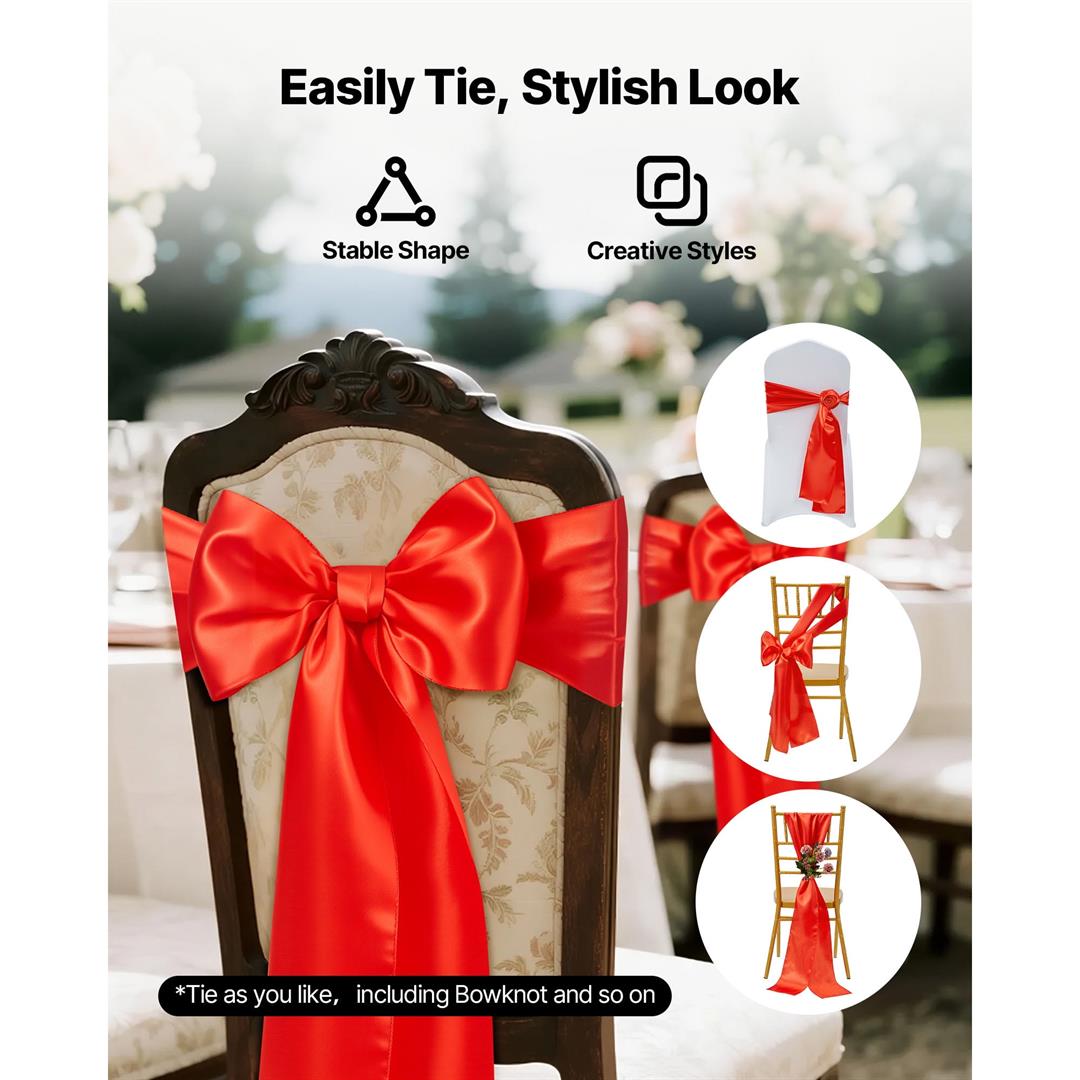 Product Description Effortless Sophistication Made from sleek 33gsm satin, these chair sashes feature a smooth texture, resist wrinkles, and are simple to shape into stylish bows. Designed with reinforced edges and measuring 275×17 cm, they offer a versatile fit for weddings, celebrations, and other events. Perfect for large gatherings, they are available in convenient bulk packs. Expertly Designed with Attention to Detail Crafted with meticulous stitching, this product offers lasting durability and a polished appearance, making it suitable for various occasions. 275x17cm Compatible with Various Models Crafted to seamlessly accommodate a variety of banquet, folding, and Chiavari chairs, offering a sophisticated and tailored appearance. Set of 100 Generous Quantity Perfect for weddings, celebrations, or events, this bulk pack guarantees a uniform and cohesive look for all seating arrangements. Express Your Unique Style Whether you prefer timeless bows, stylish side knots, or sophisticated center knots adorned with brooches, our chair bows are designed to help you craft customized arrangements for any event. Sophistication Tailored for Any Event These chair sashes are perfect for adding an elegant touch to outdoor weddings, indoor receptions, birthday celebrations, and holiday dinnerscreating a sophisticated atmosphere for any occasion. Comprehensive and Convenient Set Measuring 275×17 cm, this versatile size is designed to accommodate most banquet and Chiavari chairs. Available in a cost-effective pack of 100, its a practical option for weddings and other large gatherings. Specifications Item Model Number: SC-100-03 Color: Red Quantity Per Box: 100PCS/Box Net Weight: 7.72lb / 3.5 kg Fits Chair Dimensions(WxDxH): 7 x 108 inch / 170 x 2750 mm Package Content 100 x Chair Sash Bows 1 x User Manual