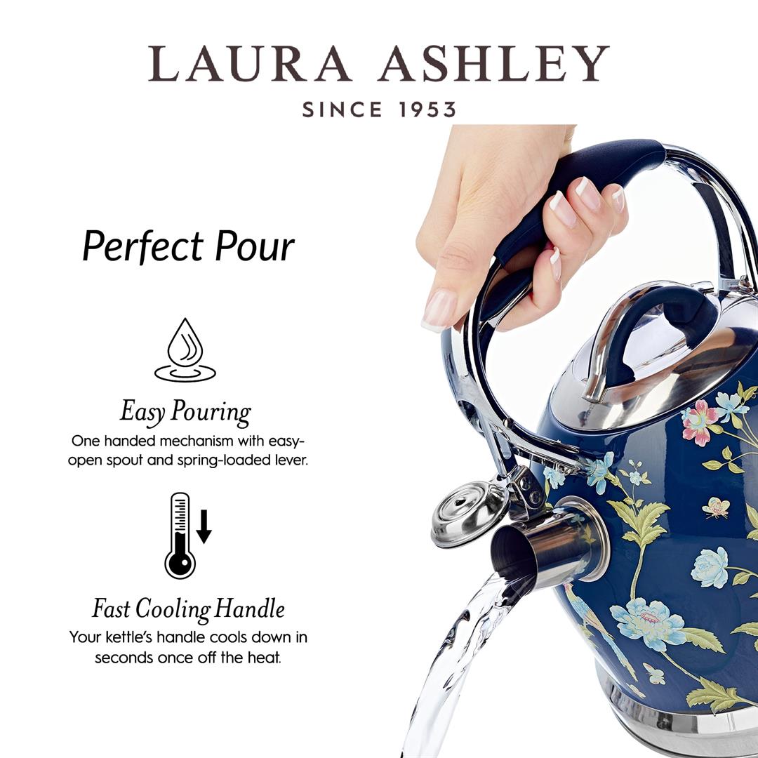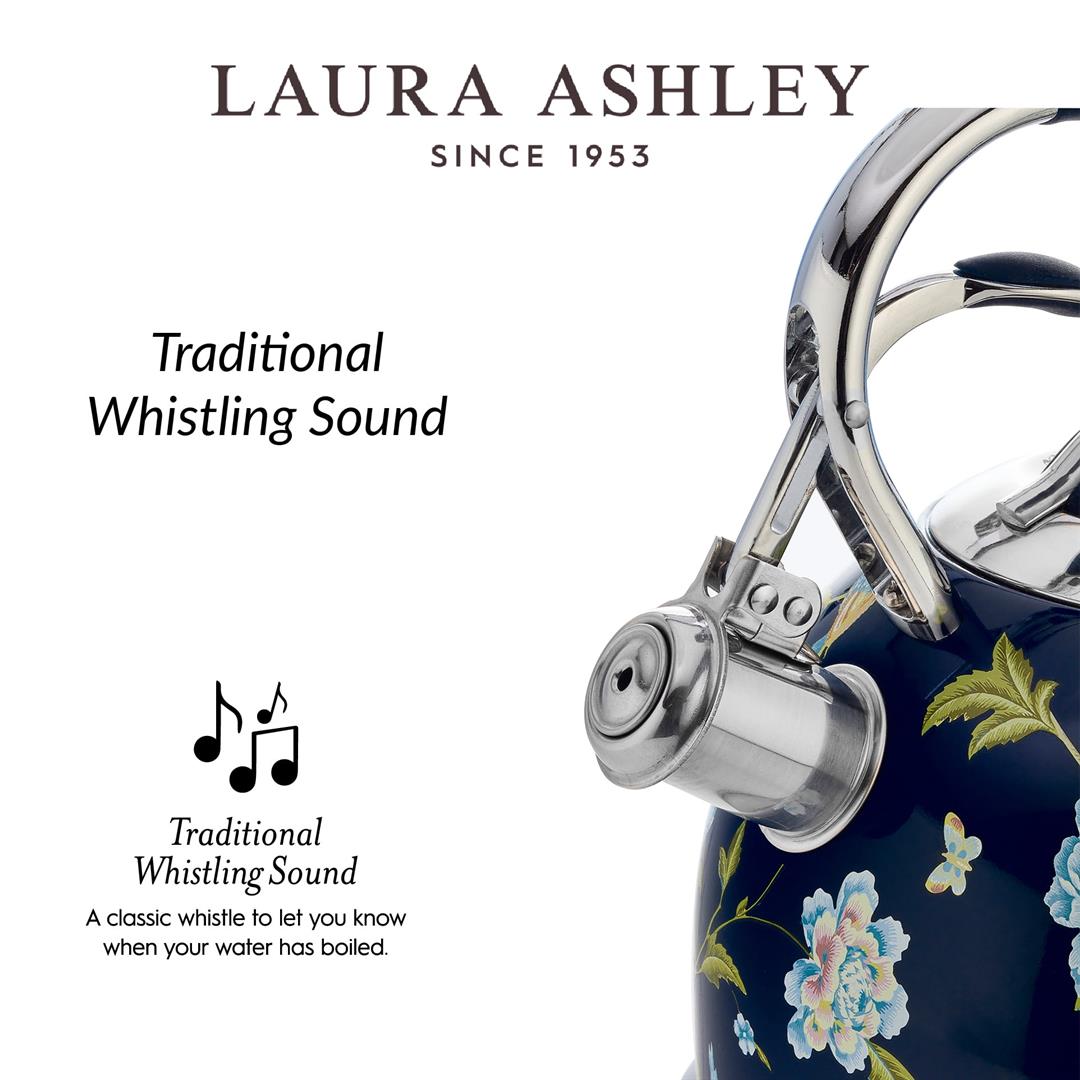Laura Ashley Induction Stovetop Kettle, Stainless Steel Navy, 8.46 x 8.46 x 10.23 inches Large capacity to meet the drinking water needs of the whole family Loud and clear whistle device to alert when water is boiling Comfortable handle designed to prevent burns Durable stainless steel construction for safety and longevity Large opening for easy water filling and cleaning User-friendly design for easy pouring Elegant mirror finish adds beauty to your kitchen decor Ten Cup Capacity: Boil up to 10 cups with the 3-litre capacity Fast Cooling Handle: The kettles handle cools down in seconds once off the heat Traditional Whistling Sound: A soft and classic sound that is loud enough to remind you that your water has boiled Easy Pouring: One-handed mechanism with an easy-open spout and spring-loaded lever 5-Layer Encapsulated Base: Efficient thermal conductivity reduces boiling time and heats evenly every time Food Grade Safe: Made of food-grade stainless steel inside and out Multi-Stove Compatibility: Suitable for traditional gas, induction, electric, ceramic, and halogen hobs Hand Applied Designer Print: Stunning individually handmade Laura Ashley Elveden Navy designer print finish