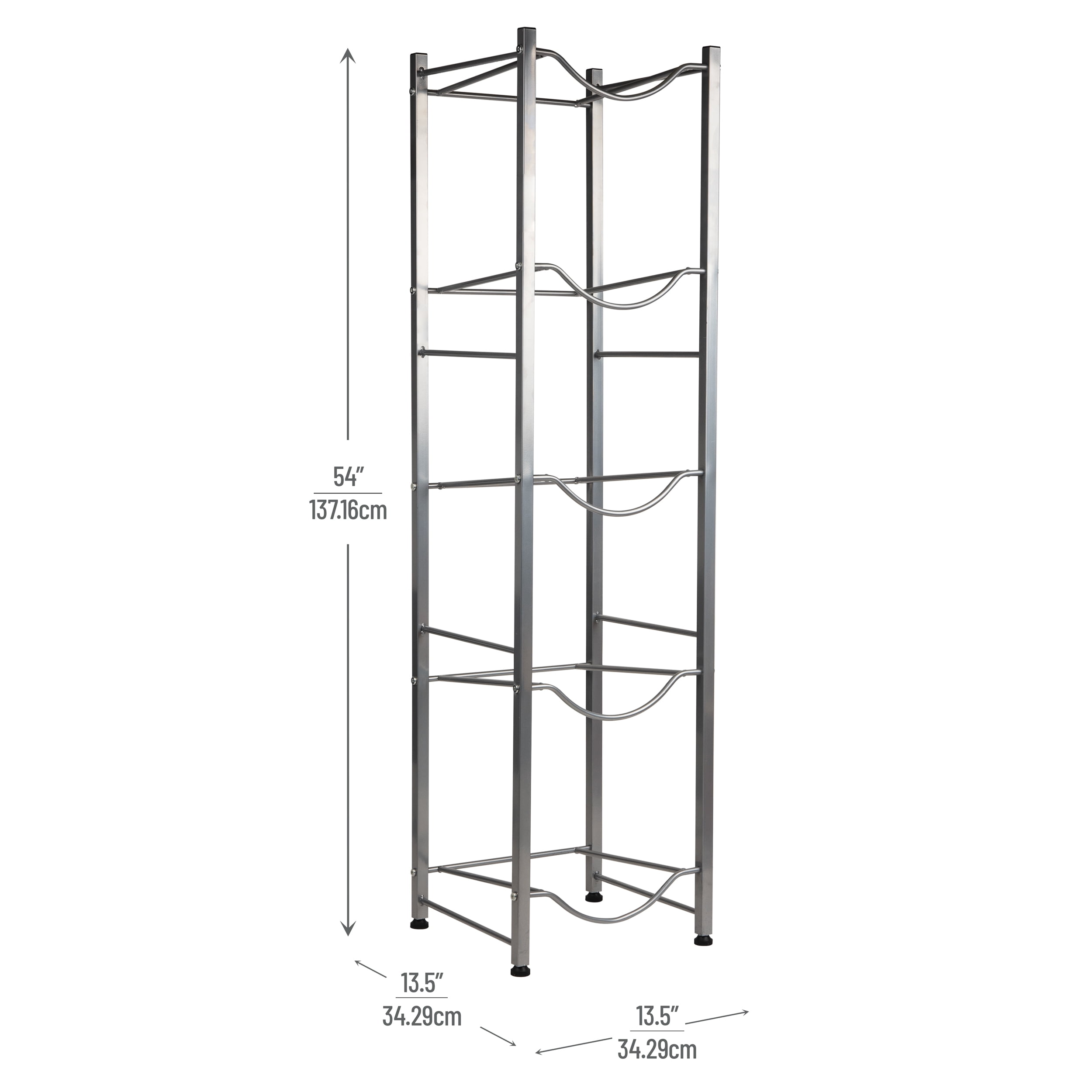 Functional design: 5-tier water jug stand with secure circular rod cradles Hydration convenience: Keep water jugs near your dispenser for easy access Tidy space saver: Sturdy metal stand keeps water jugs organized and portable Durable and easy to clean: Sturdy metal construction for daily use, easy to clean with mild soap Dimensions: This gray stand measures 13.5 long x 13.5 wide x 54 inches tall (34.3 x 34.3 x 137.2H cm) and weighs 9.9 lbs (4.49 kg)