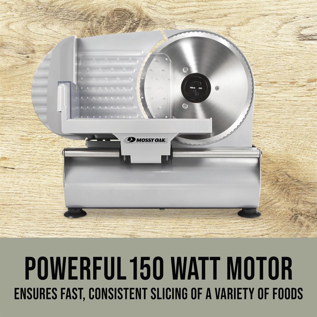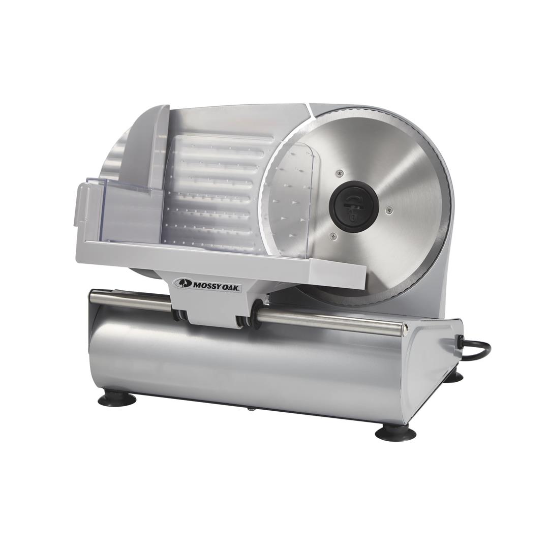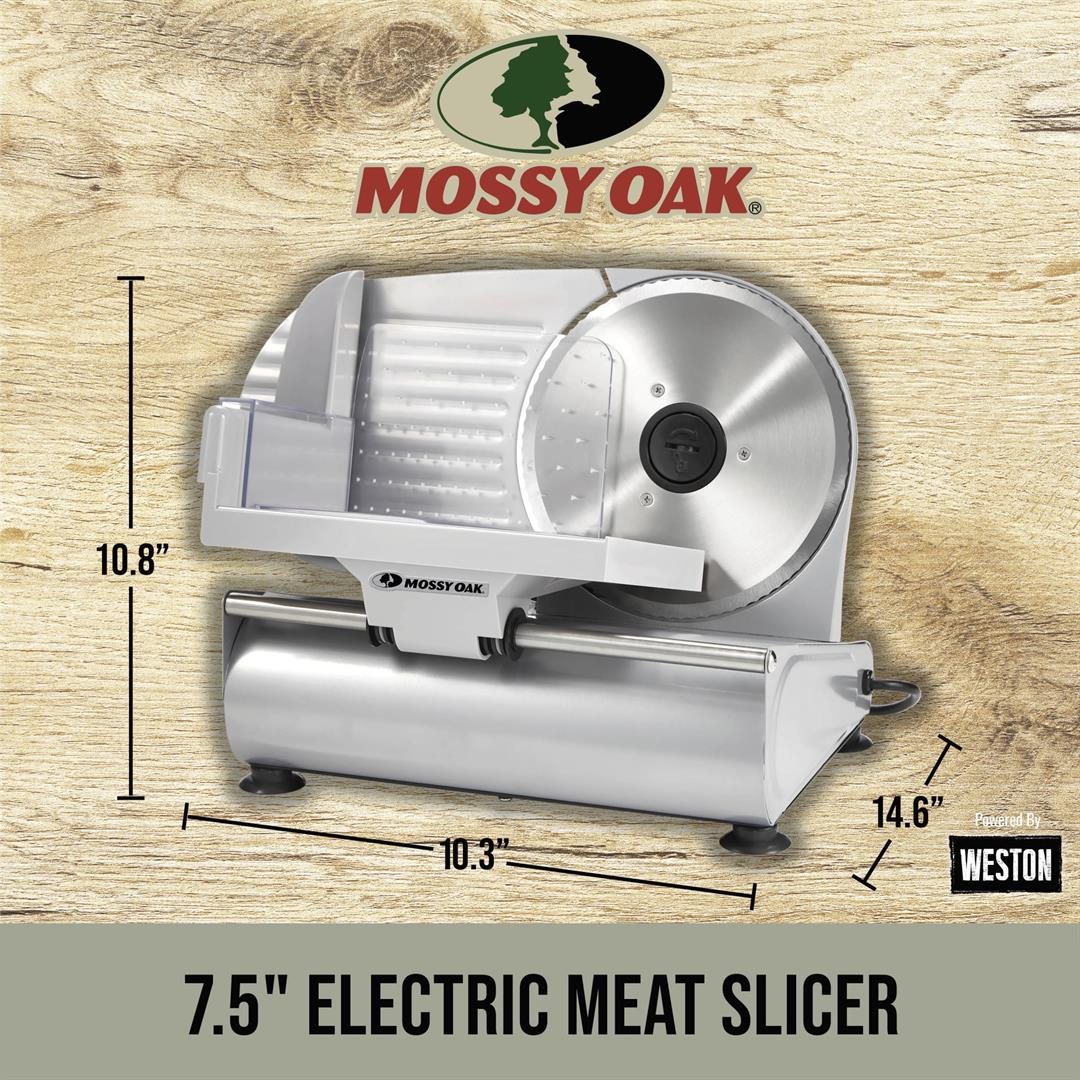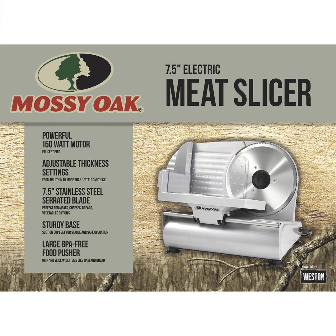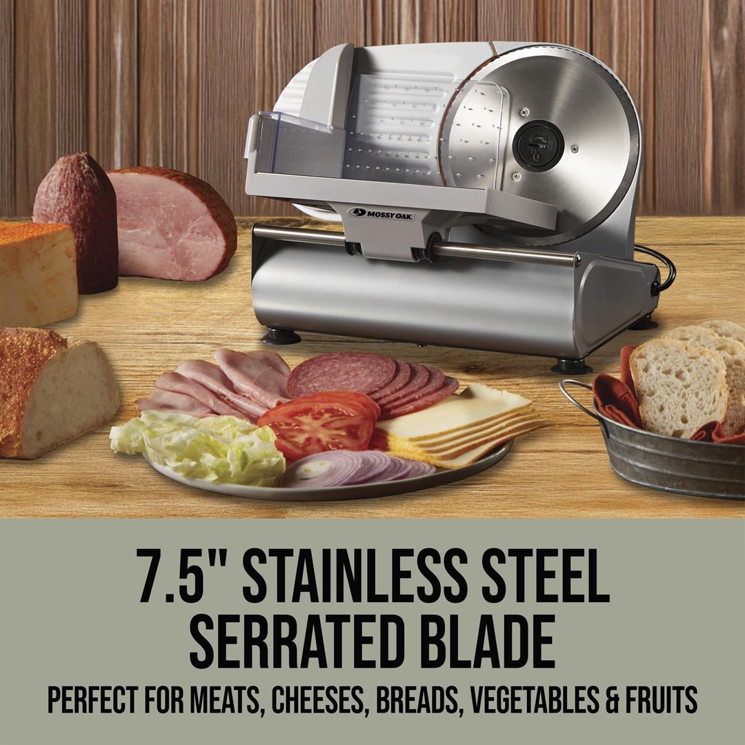Mossy Oak 7.5 inch Stainless Steel Meat Slicer, Model 61-0770-MO Versatile slicing large 7.5″ serrated blade efficiently slices a variety of foods including meats, cheeses, breads, vegetables and fruits Slice wide items like ham and loaves of bread with large ABS BPA free food pusher Fast slicing with powerful 150 watt motor Easily adjust slicing thickness from deli thin to more than .5 inches (1.3 cm) Easy slicing with smooth-gliding carriage with stainless steel food tray and sturdy base with suction feet