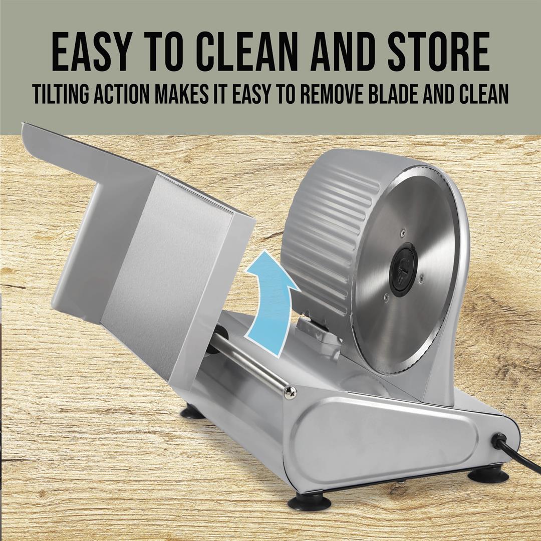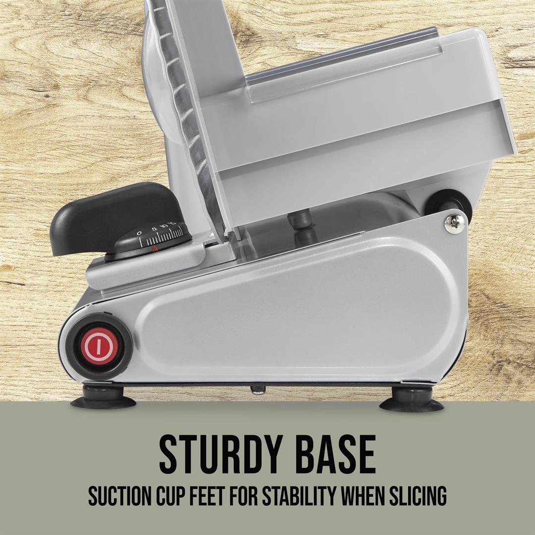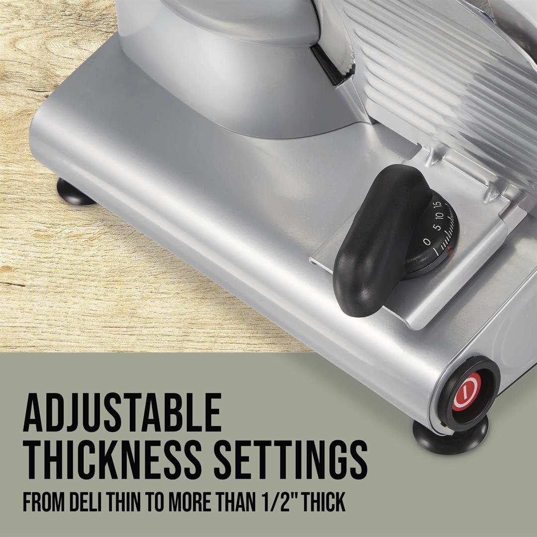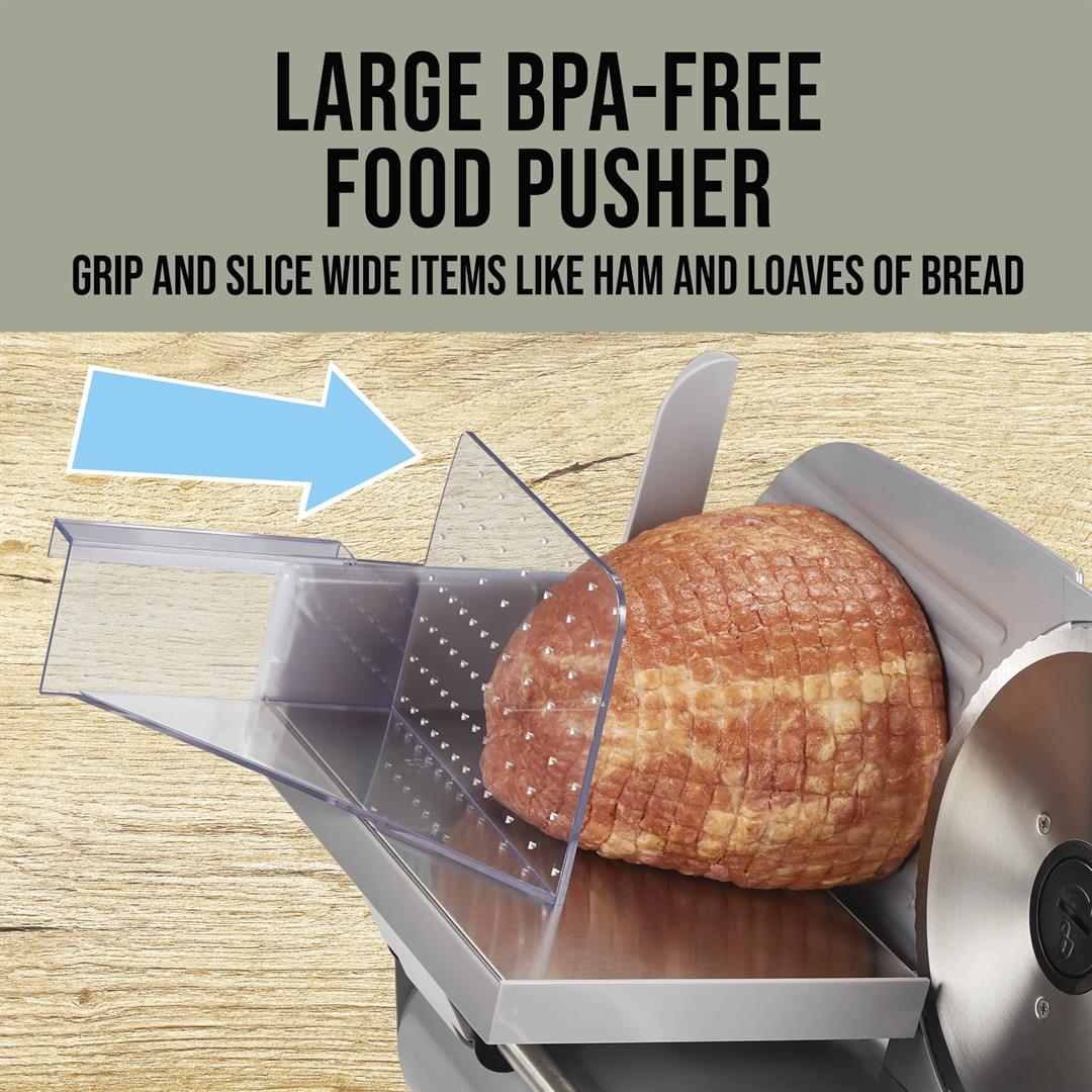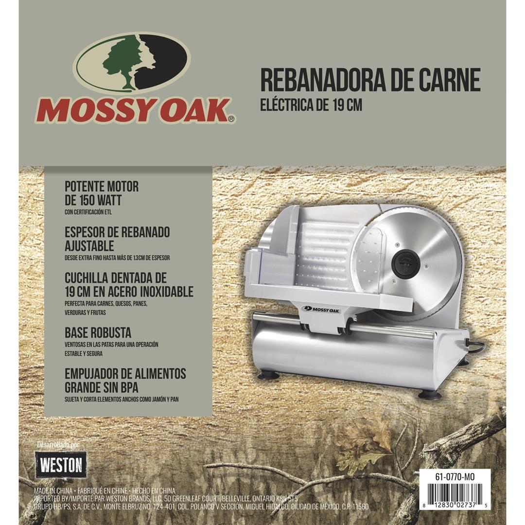 Mossy Oak 7.5 inch Stainless Steel Meat Slicer, Model 61-0770-MO Versatile slicing large 7.5″ serrated blade efficiently slices a variety of foods including meats, cheeses, breads, vegetables and fruits Slice wide items like ham and loaves of bread with large ABS BPA free food pusher Fast slicing with powerful 150 watt motor Easily adjust slicing thickness from deli thin to more than .5 inches (1.3 cm) Easy slicing with smooth-gliding carriage with stainless steel food tray and sturdy base with suction feet