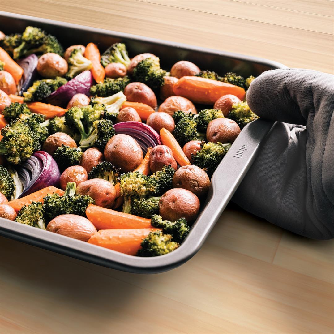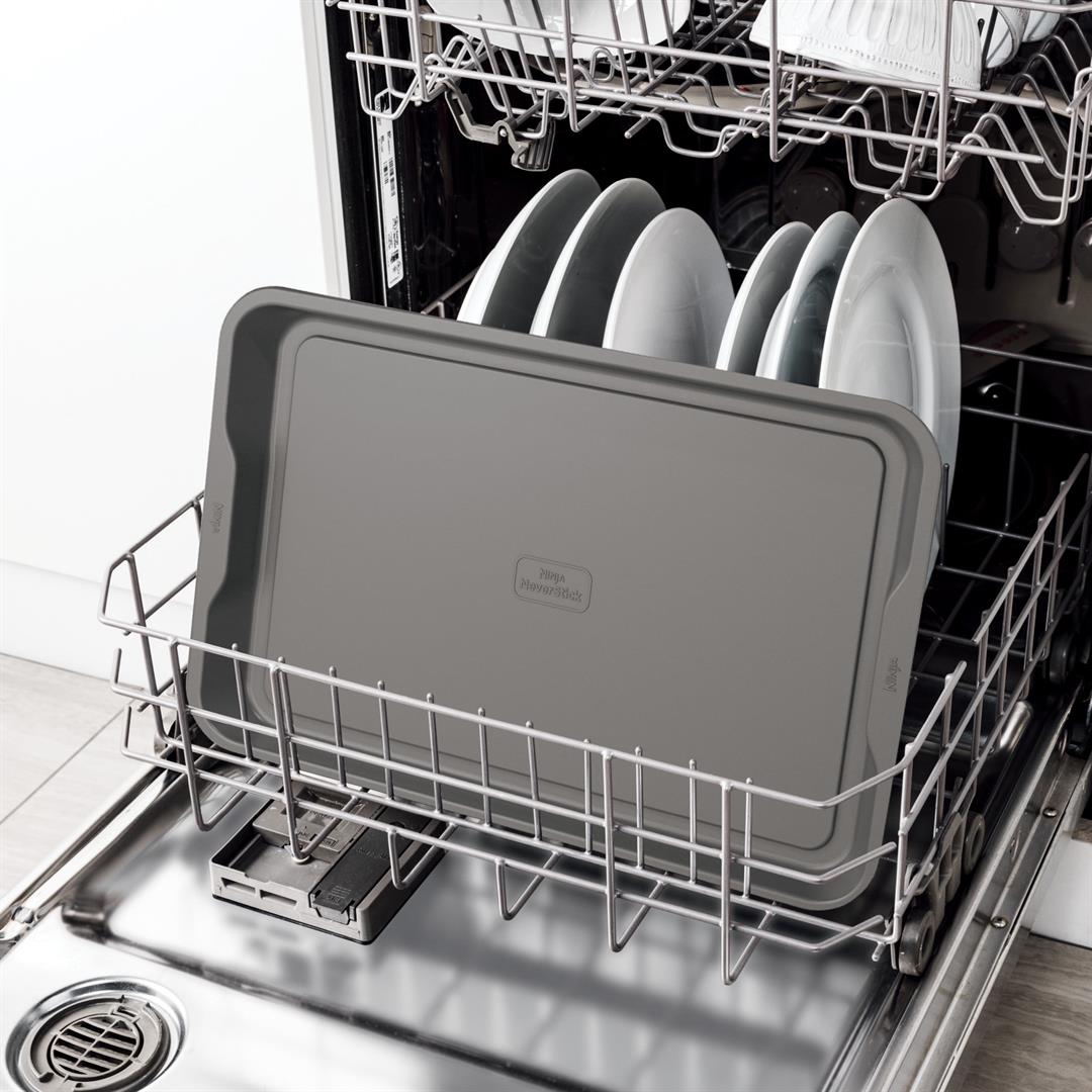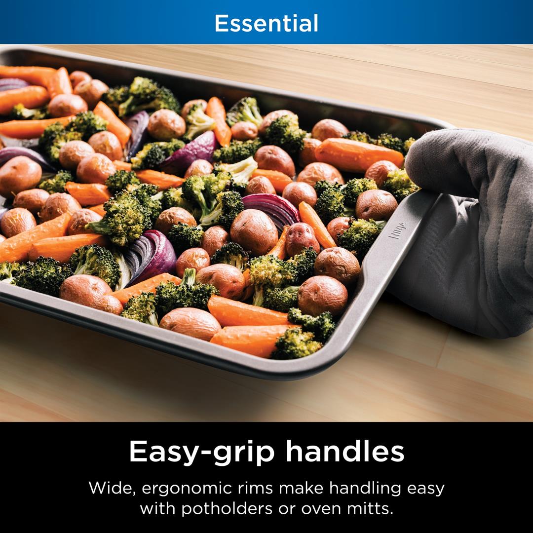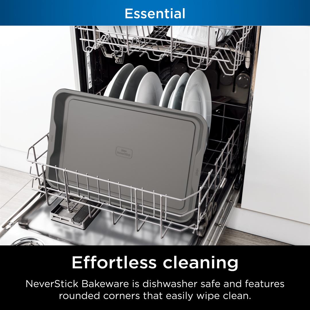 NEVERSTICK BAKEWARE: Engineered to consistently release food so it easily glides off the pan. EFFORTLESS CLEANING: NeverStick Bakeware is dishwasher safe and features rounded corners that easily wipe clean. PERFECT RESULTS: Uniformly distributes heat for professional results and even browning on sweet treats and savory dishes. OVEN SAFE TO 500F: Thick construction is high-heat friendly and resists warping in the oven. 10 YEAR GUARANTEE: Durable NeverStick coating delivers long lasting performance and is fully backed by the Ninja 10 Year Guarantee.* *When used as directed. HEAVY-DUTY ALUMINIZED STEEL: Minimize staining and rusting with heavy duty 0.6mm aluminized steel EASY-GRIP HANDLES: Wide, ergonomic rims are easy to handle with potholders or oven mitts. THOUGHTFUL DESIGN: Deep walls eliminate spills, resist warping, and protect baked goods.