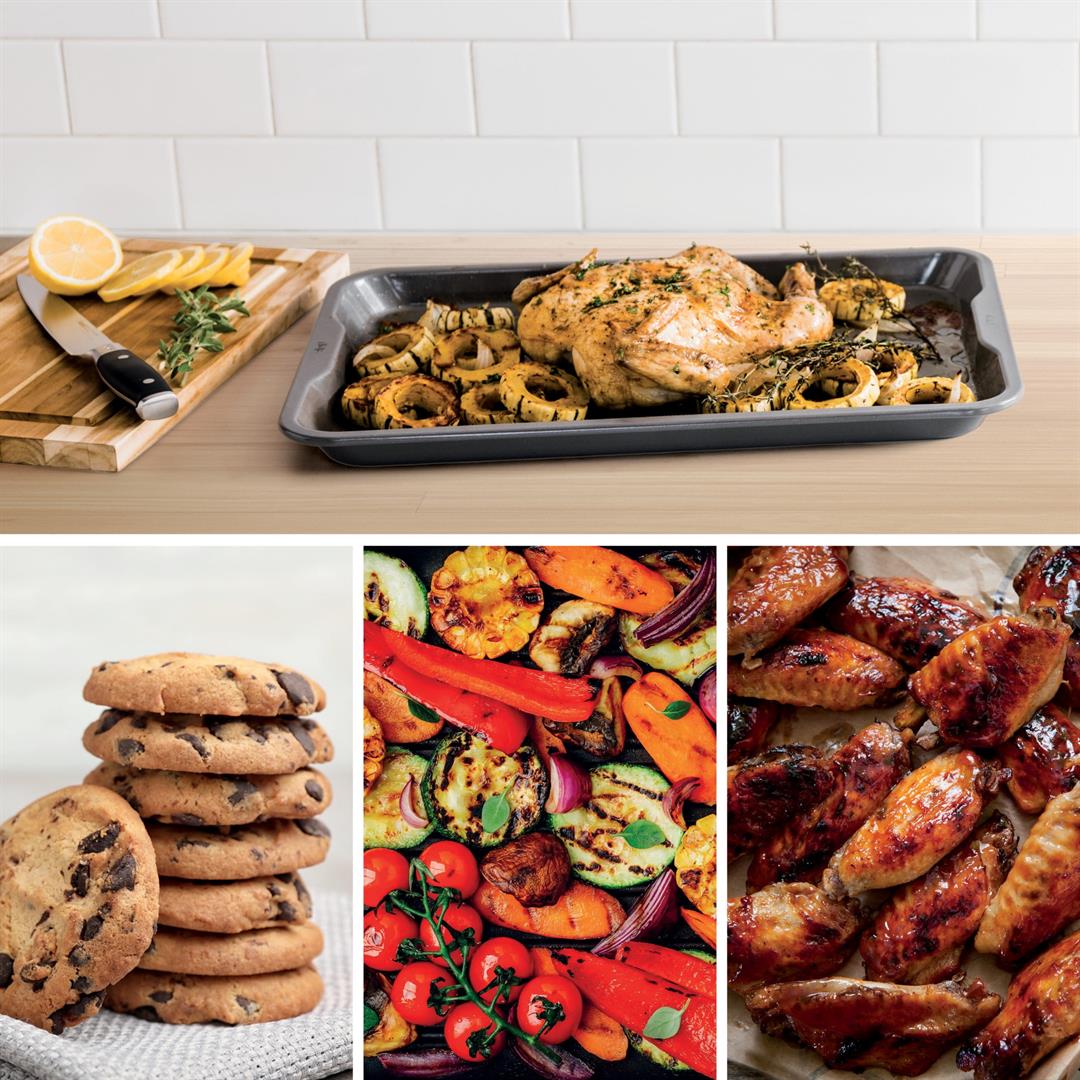 Introducing the Ninja NeverStick 3-Piece Baking Sheet Set, the essential bakeware that easily releases food and wipes clean. Heavy duty 0.6mm aluminized steel minimizes rusting, resists warping, and is oven safe up to 500F. The NeverStick coating easily wipes clean, is dishwasher safe, and delivers perfect results every time.