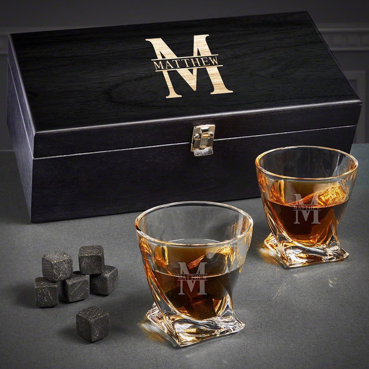 Custom set of whiskey gifts elevate your whiskey experience Includes two twist glasses, nine whiskey stones, black paper filling, and a black gift box Glasses and box are engraved with an initial and name Amazing birthday or holiday gifts for husbands, boyfriends, or brothers Each twist glass measures 3.5″ x 3.5″ and holds 10.25 oz, box measures 13.5″ x 6.5″ x 5″