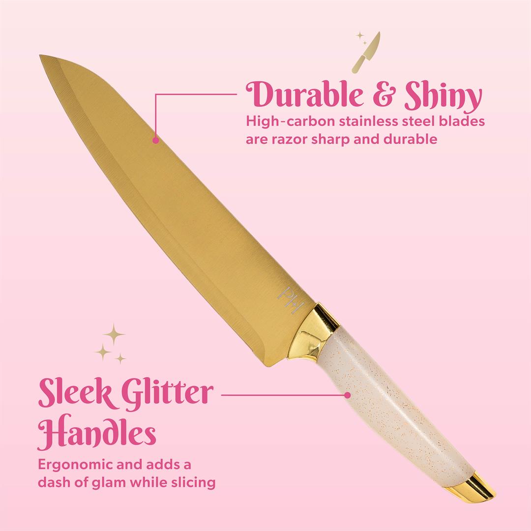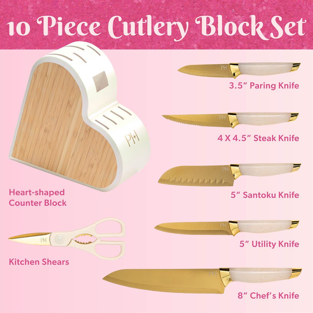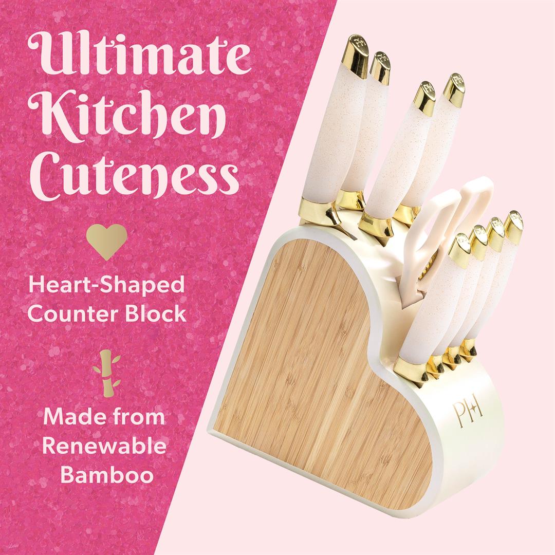 10-PIECE HEART SHAPED KNIFE BLOCK SET INCLUDES: An 8-inch Chef’s knife, 5-inch Santoku knife, 3.5-inch paring knife, 5-inch utility knife, and 4.5-inch steak knives (4 total), kitchen shears and a heart-shaped knife block BEAUTIFUL AND DURABLE: Each knife is constructed with a high-carbon stainless steel blade to provide durability. SO SMOOTH: The sleek handle on each knife also provides a dash of glam while slicing and dicing. SO CUTE, LOVES IT: The heart-shaped knife block has an individual slot for the shears and each knife, optimizing storage space in small kitchens and keeping your knives safe and accessible. BOSS BABE STYLE: This bamboo knife block is made from renewable bamboo. It’s a choice that empowers beauty and brains in true boss babe fashion. STAY BEAUTIFUL: Hand wash only for best results. #BeAnIcon: Post your photos with #BeAnIcon for a chance to be shared on Paris’ social media!
