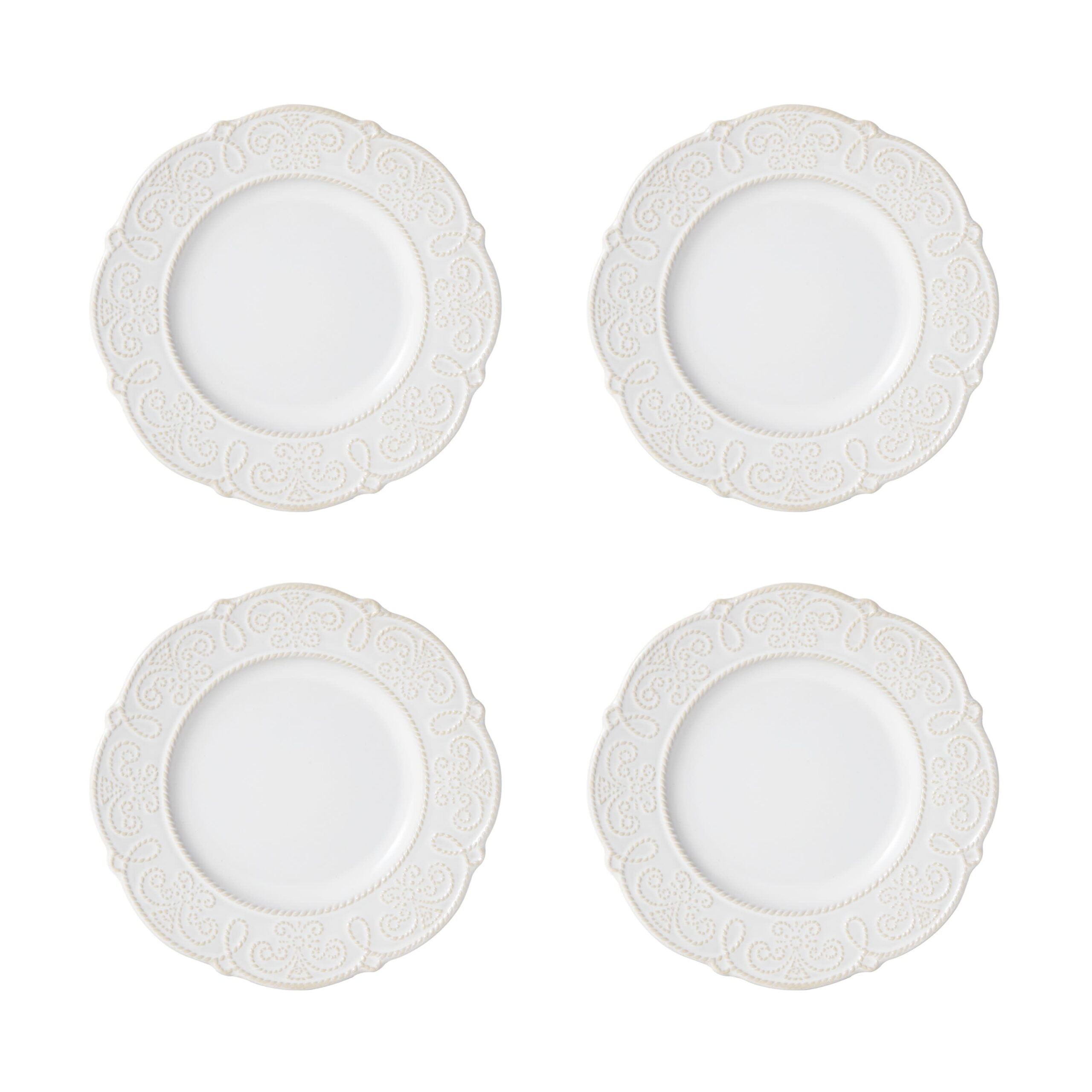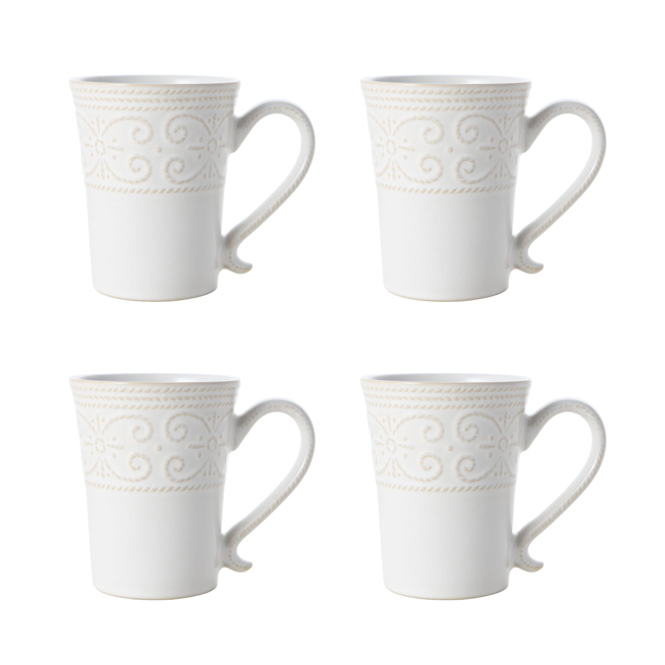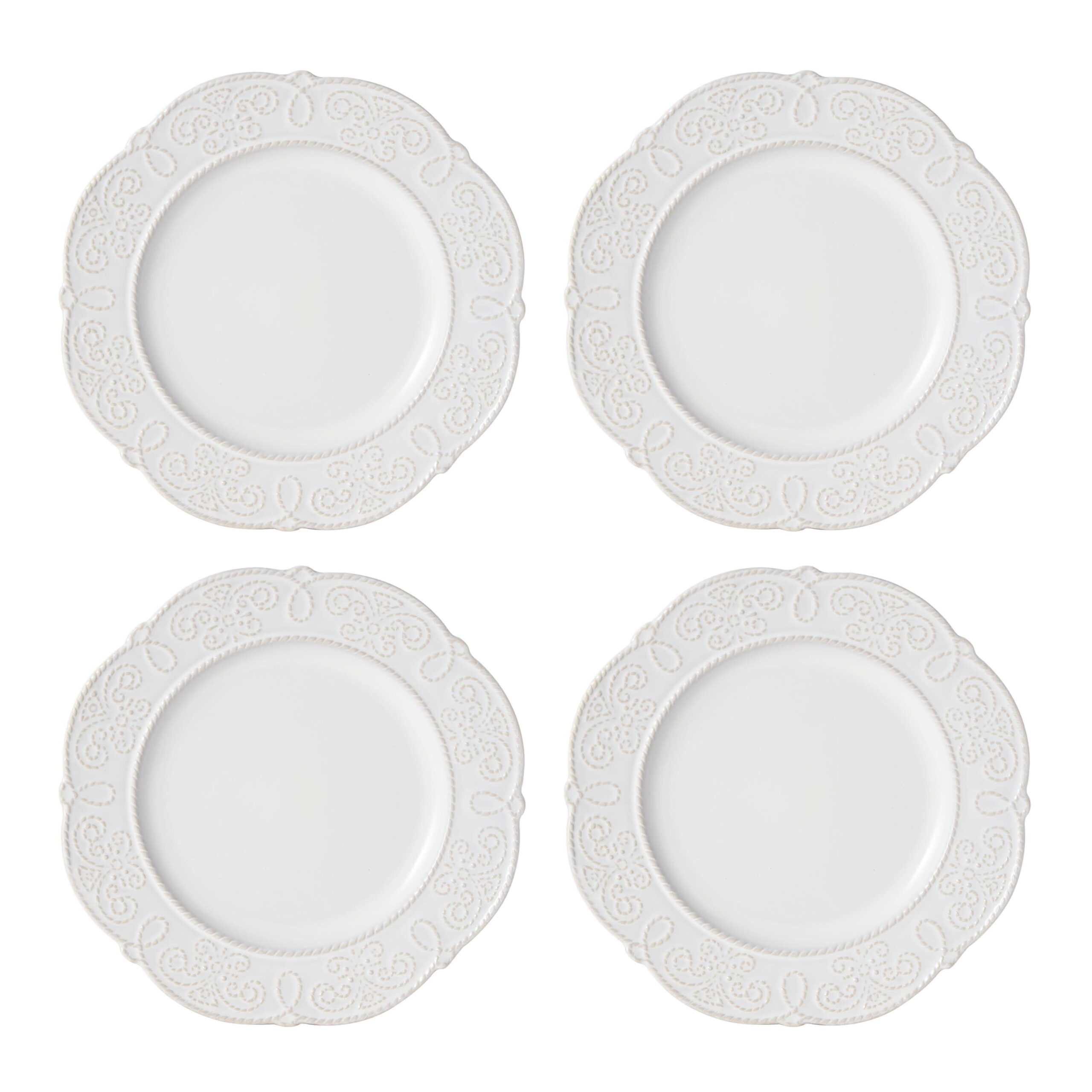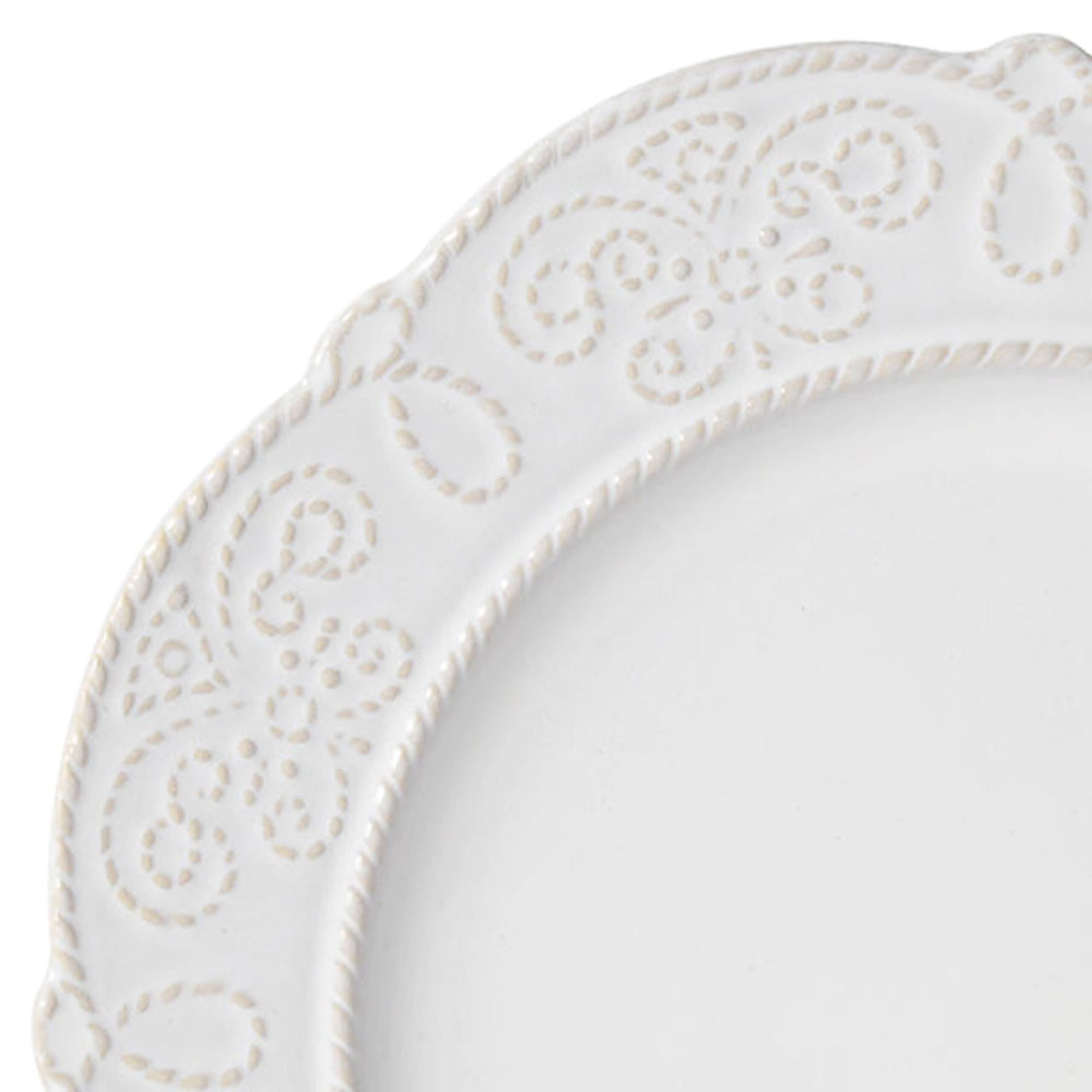 Classic style has a place at the table with this Pfaltzgraff 16-Piece Abby White Dinnerware Set. Made of high-quality stoneware for strength and durability, this stunning collection in warm white features a scalloped edge design and a flourish of scrolls encircling each piece, bringing a traditional look to any dining occasion. 16-piece set, service for 4, includes 4 each of: 10-1/2 inch dinner plate, 8-1/2 inch salad plate, 6-inch cereal bowl, and 12-ounce mug. Microwave and dishwasher safe.
