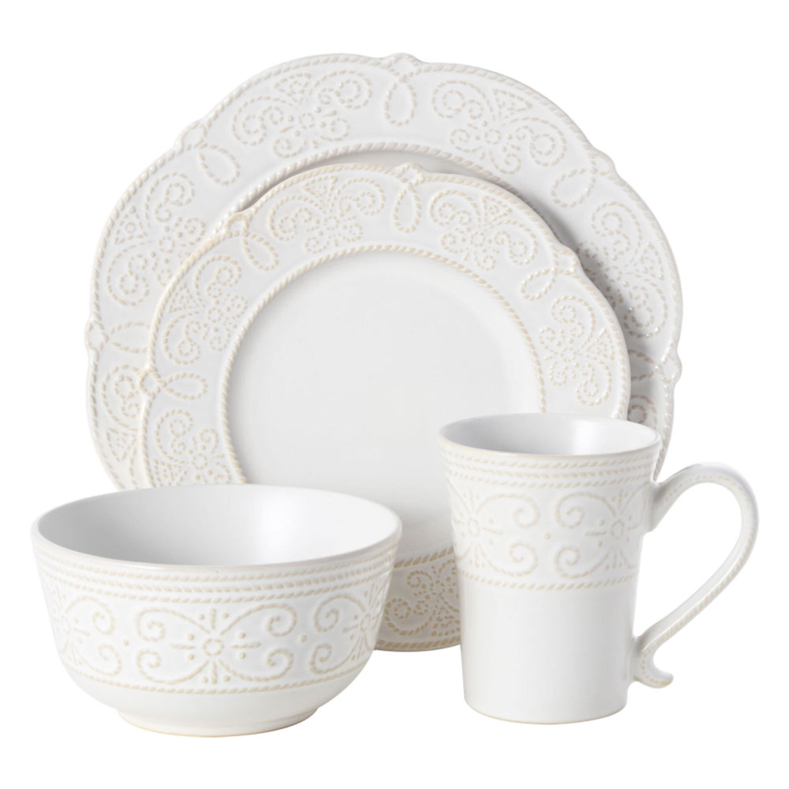TABLE FOR 4: 16-piece set, service for 4, includes 4 each of: 10-1/2 inch dinner plate, 8-1/2 inch salad plate, 6-inch cereal bowl, and 12-ounce mug CLASSIC STYLE: scalloped edges and a scroll pattern encircle each piece in the collection WARM AND INVITING: the traditional style and warm white color create a welcoming tabletop display BEAUTIFULLY CRAFTED: made of high-quality stoneware for strength and durability EASY CLEANING & REHEATING: dishwasher safe for fast, simple cleanup, and microwave safe for quick reheating For over 200 years the Pfaltzgraff brand has been associated with the highest quality ceramic products available for the home. The company grew from a modest-size pottery shop that produced simple earthenware, salt-glazed stoneware crocks and even flower pots into one of the best known designers and marketers of dinnerware, drinkware, ceramic accessories, giftware, flatware and other products. Pfaltzgraff has a long-standing tradition of excellence in craftsmanship, quality and service. Today, like never before and like nowhere else, this tradition extends to the finest, widest variety of home products available in the best home brands. This commitment to being responsive to its customers, and to adapting its products and policies to their ever-changing needs, has enabled Pfaltzgraff to prosper for almost two centuries. Pfaltzgraff Abby 16-Piece Dinnerware Set Round White: 5267392