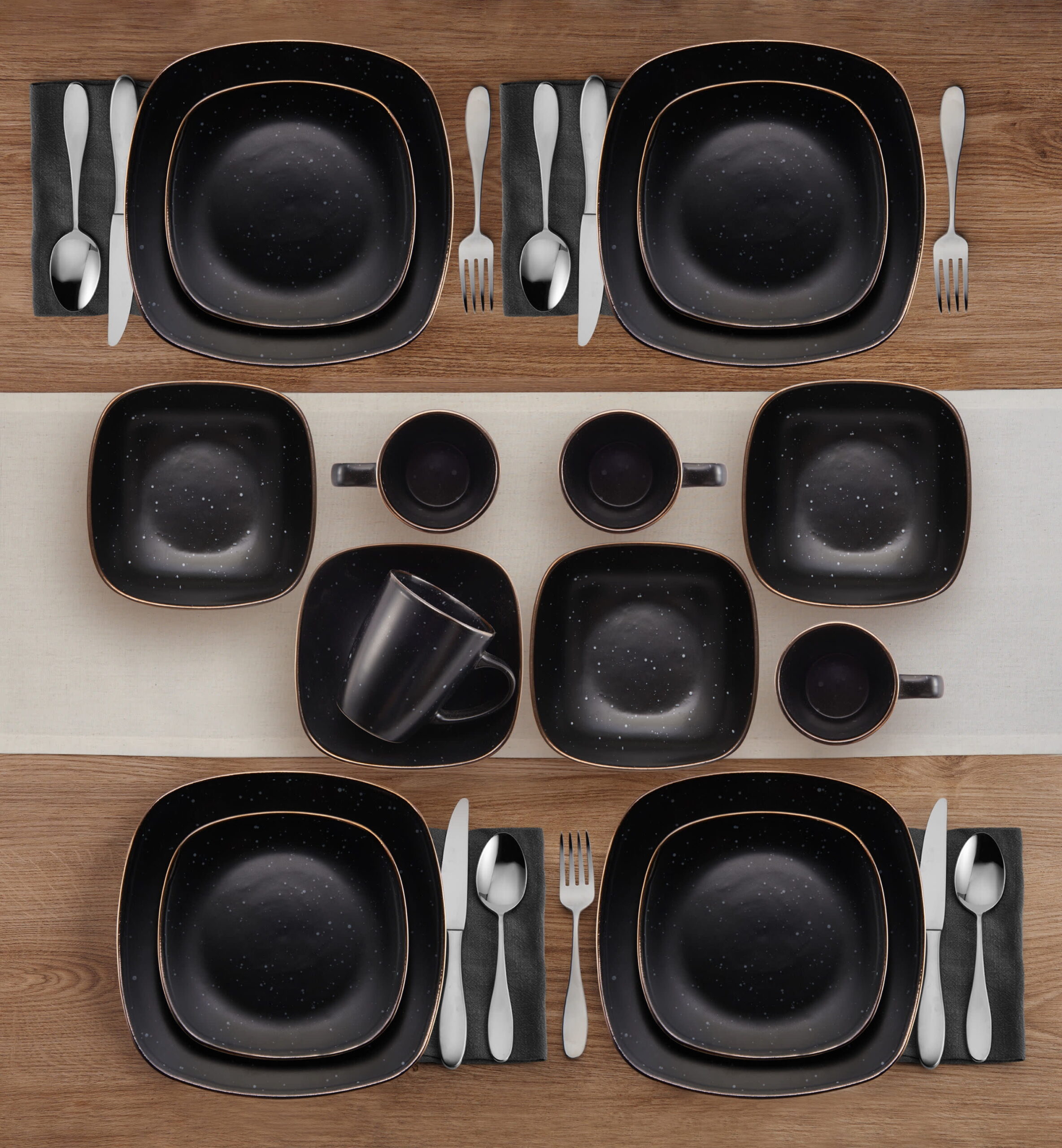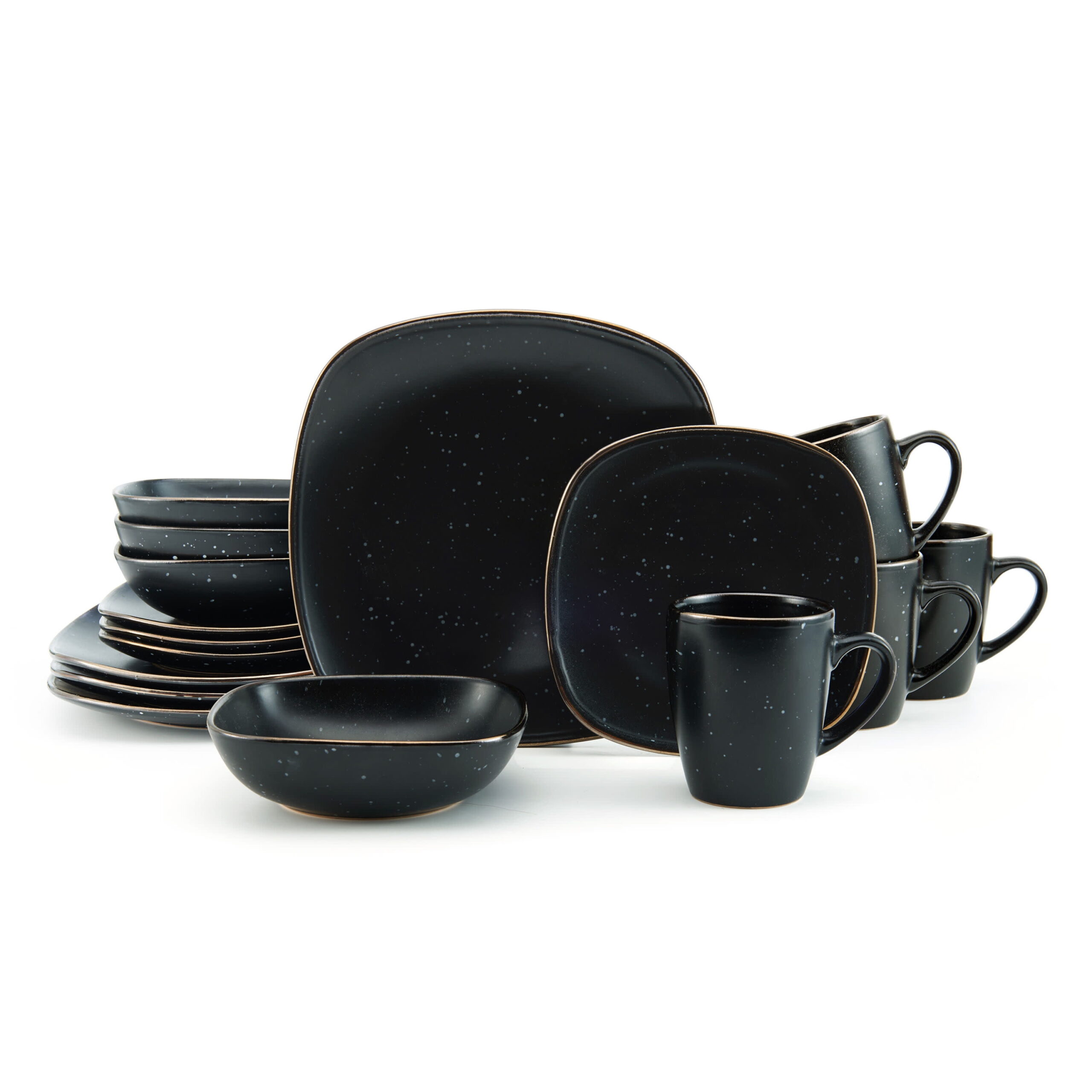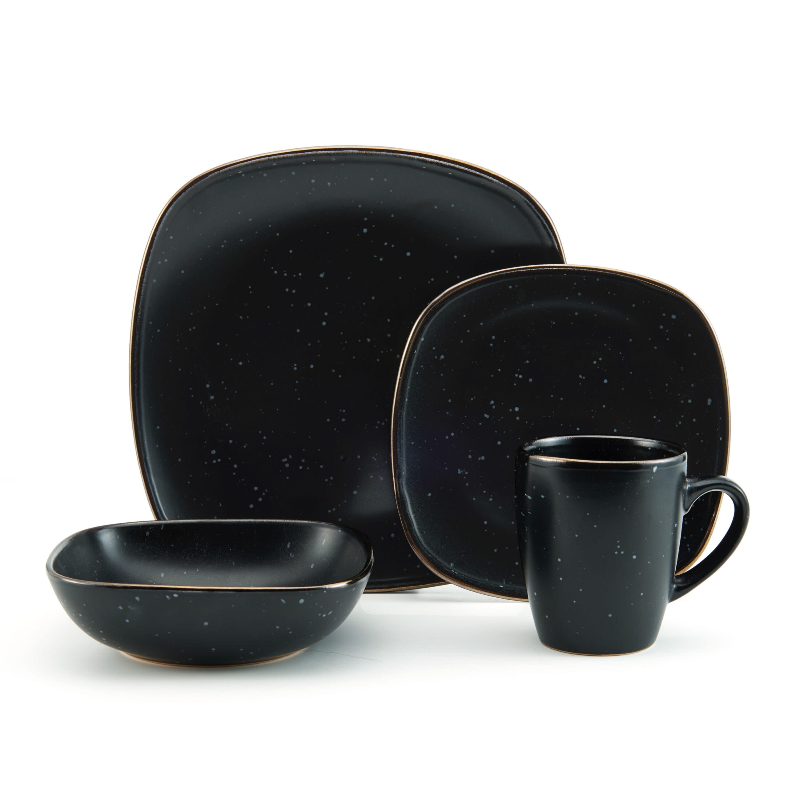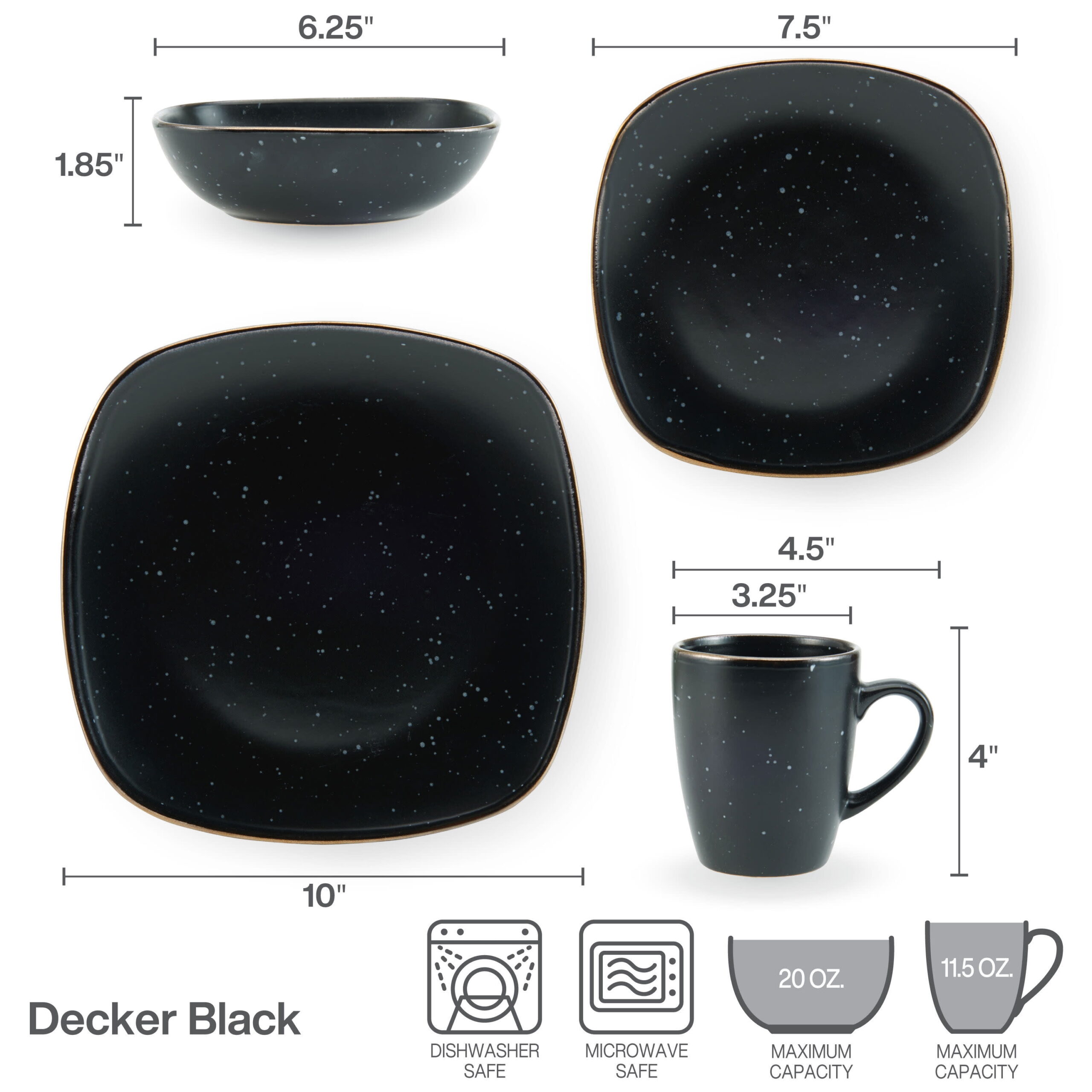 Give your tabletop display a modern makeover with this Decker Black 16-Piece Dinnerware Set by Pfaltzgraff. Crafted of high-quality stoneware, this contemporary collection features square-shaped pieces with gently curved corners. The deep black bodies are adorned with a mesmerizing speckle effect, and highlighted with metallic rims. 16-piece set, service for 4, includes 4 each of: 10-inch dinner plate, 7-3/4 inch salad plate, 20-fluid ounce bowl measuring 1-3/4 inches tall with a 6-1/2 inch diameter, and 13-fluid ounce mug measuring 4-1/4 inches tall. Microwave and dishwasher safe.
