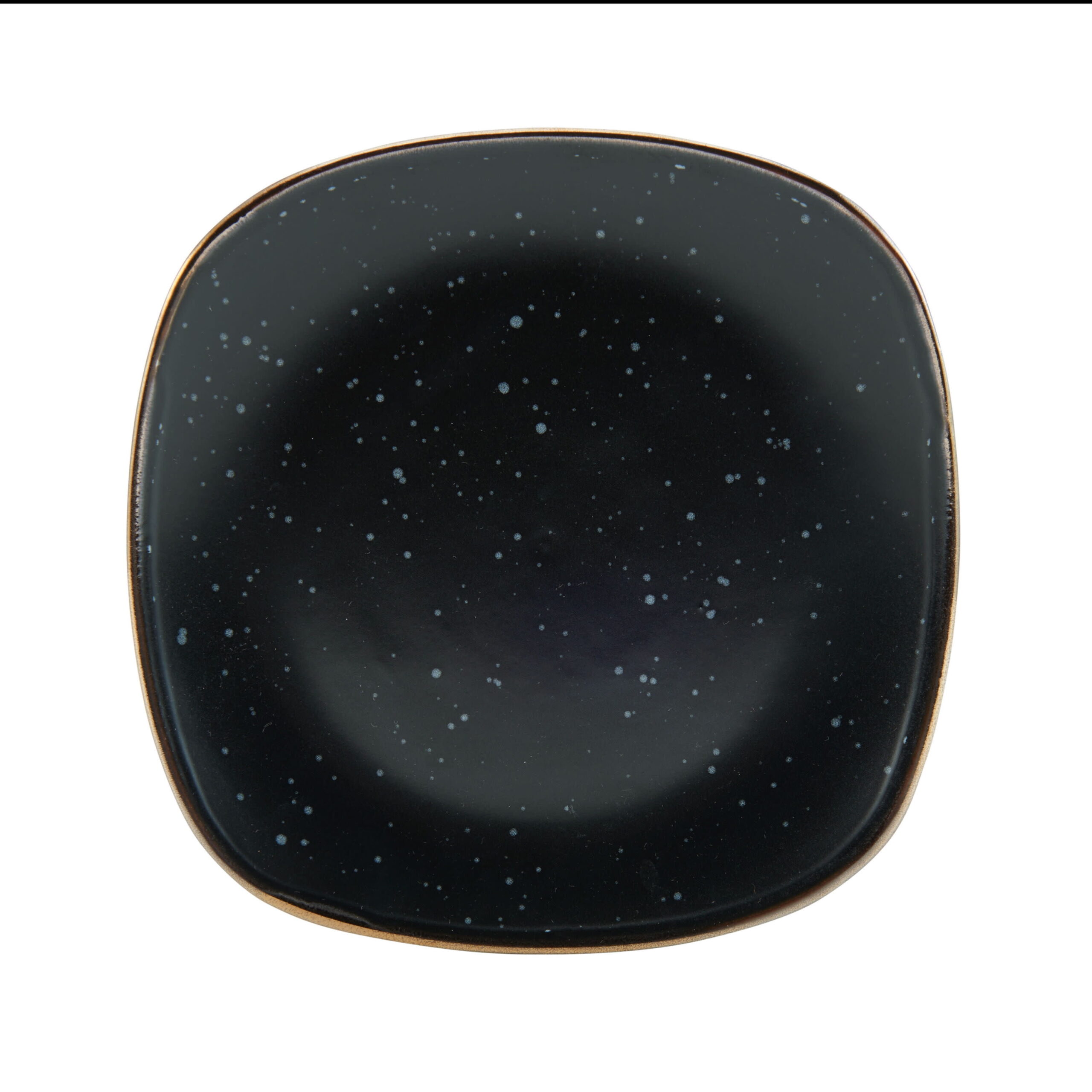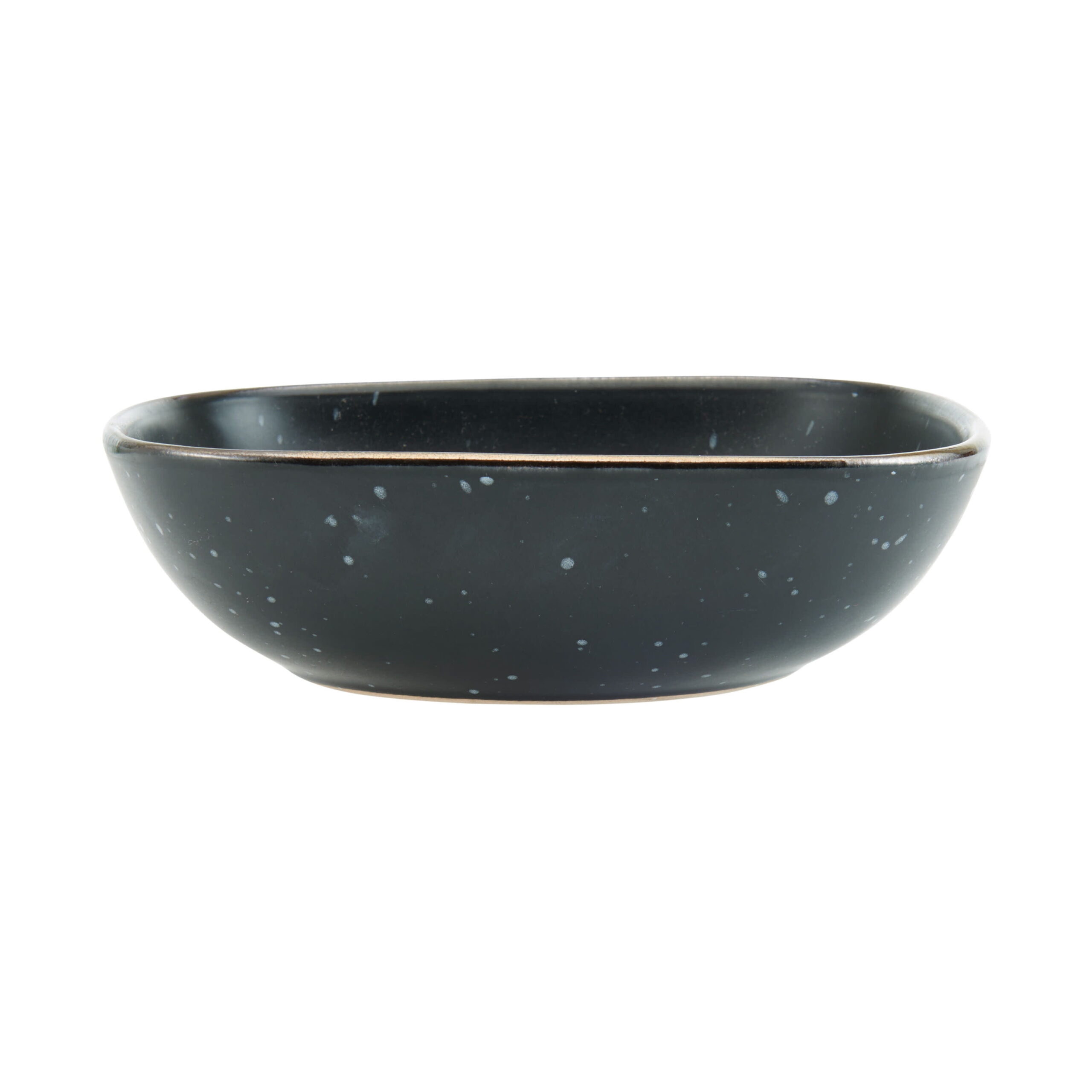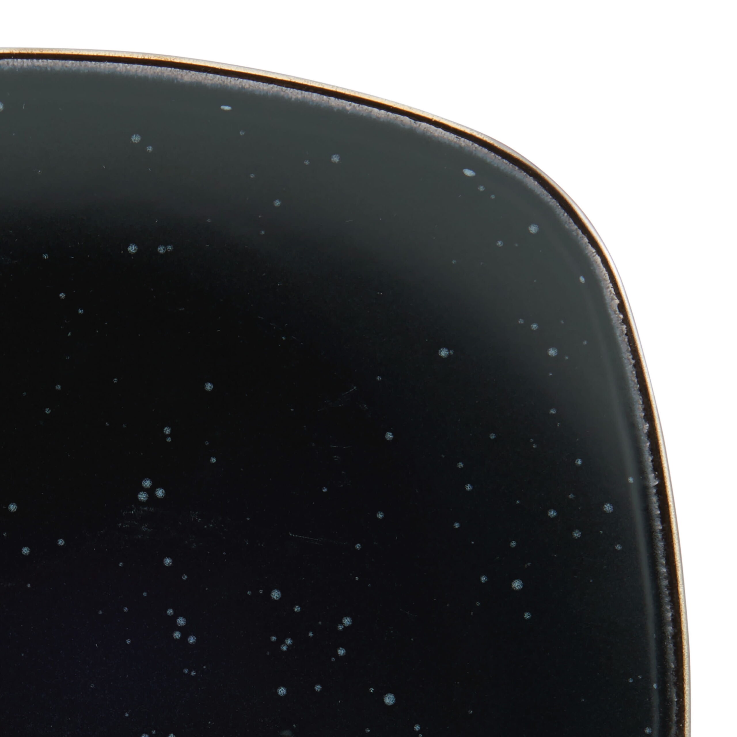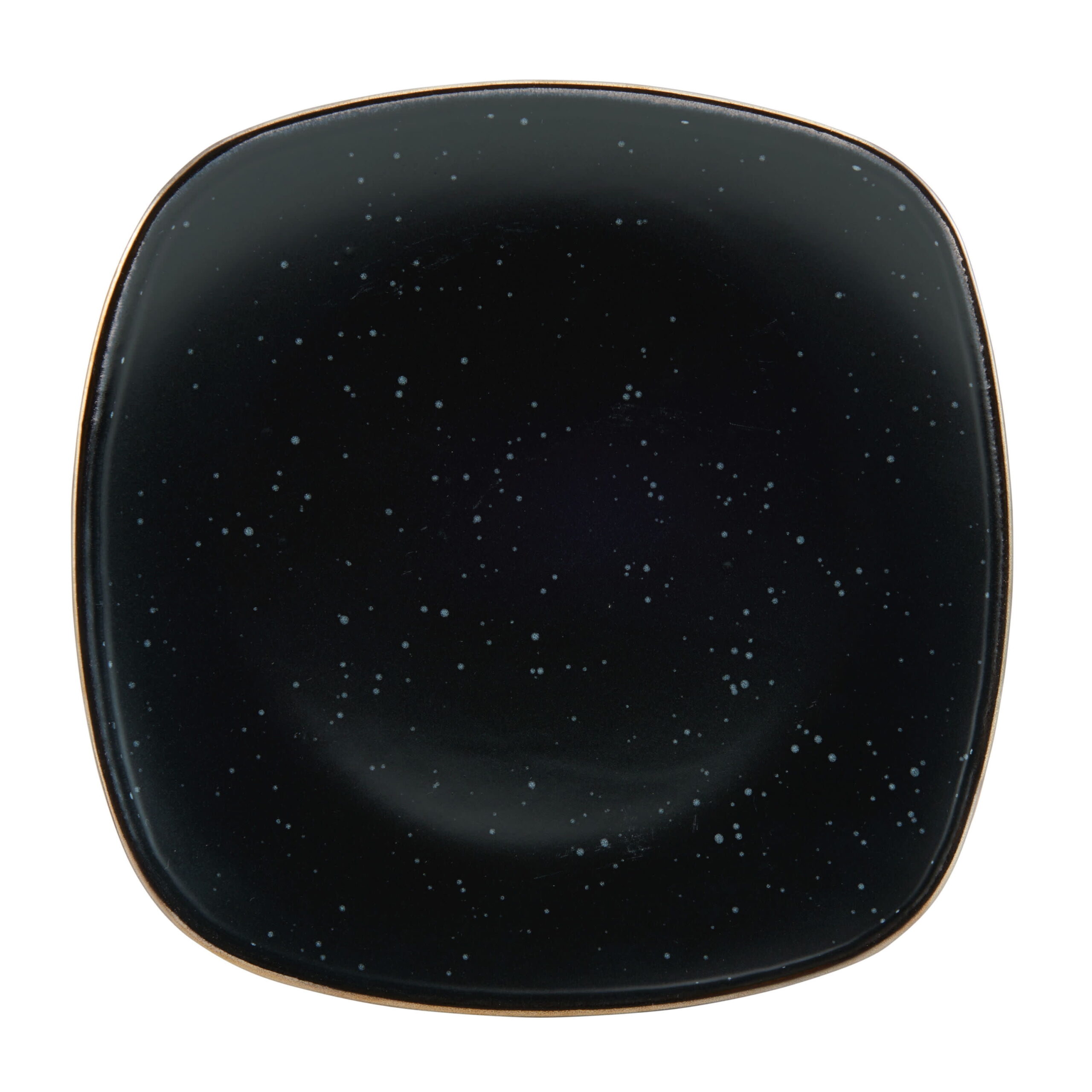 Give your tabletop display a modern makeover with this Decker Black 16-Piece Dinnerware Set by Pfaltzgraff. Crafted of high-quality stoneware, this contemporary collection features square-shaped pieces with gently curved corners. The deep black bodies are adorned with a mesmerizing speckle effect, and highlighted with metallic rims. 16-piece set, service for 4, includes 4 each of: 10-inch dinner plate, 7-3/4 inch salad plate, 20-fluid ounce bowl measuring 1-3/4 inches tall with a 6-1/2 inch diameter, and 13-fluid ounce mug measuring 4-1/4 inches tall. Microwave and dishwasher safe.