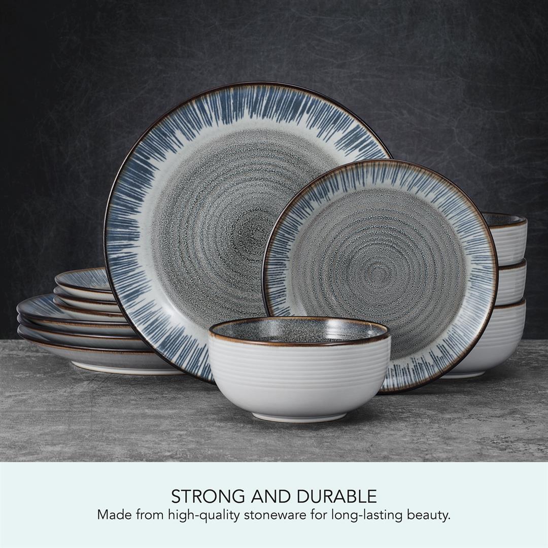 CONTEMPORARY AND INVITING: ideal for everyday use, Jamie dinnerware brings alluring color to your tabletop STUNNING FINISH: simple shapes are escalated to stylish elegance by a grey center and a thick blue and brown border STRONG AND DURABLE: made from high-quality stoneware for long-lasting beauty 12-PIECE SET: includes 4 each of: 11-1/4 inch dinner plate, 8-1/2 inch salad plate, and 3-inch high all-purpose bowl with a 6-1/4 inch diameter with a capacity of 29 ounces EASY CLEANING AND REHEATING: Dishwasher safe for fast, simple cleanup, and microwave safe for quick reheating