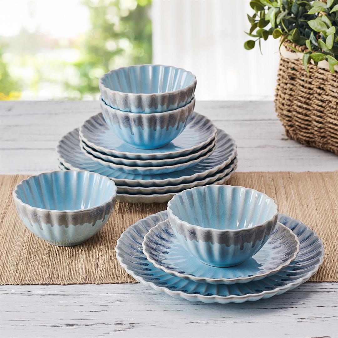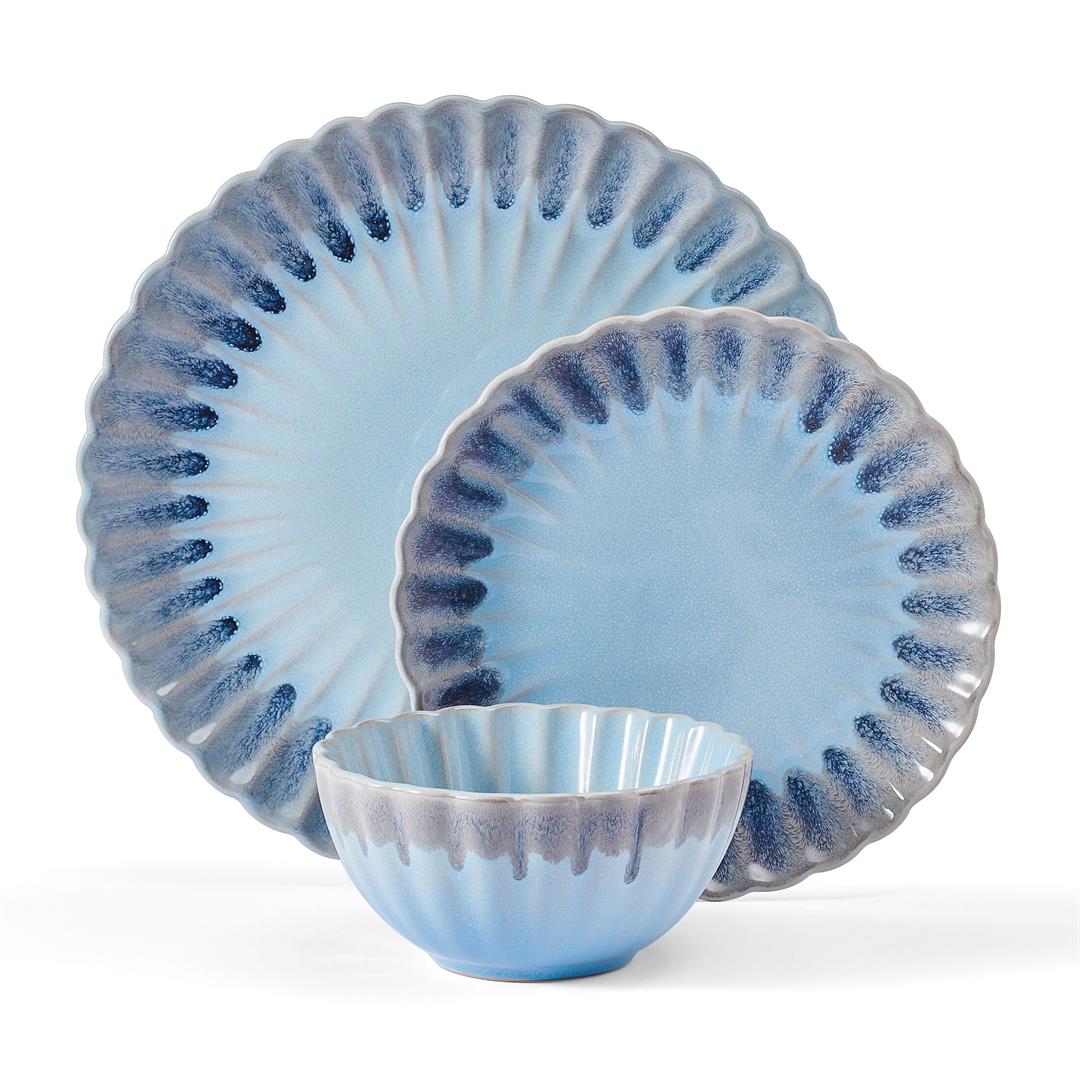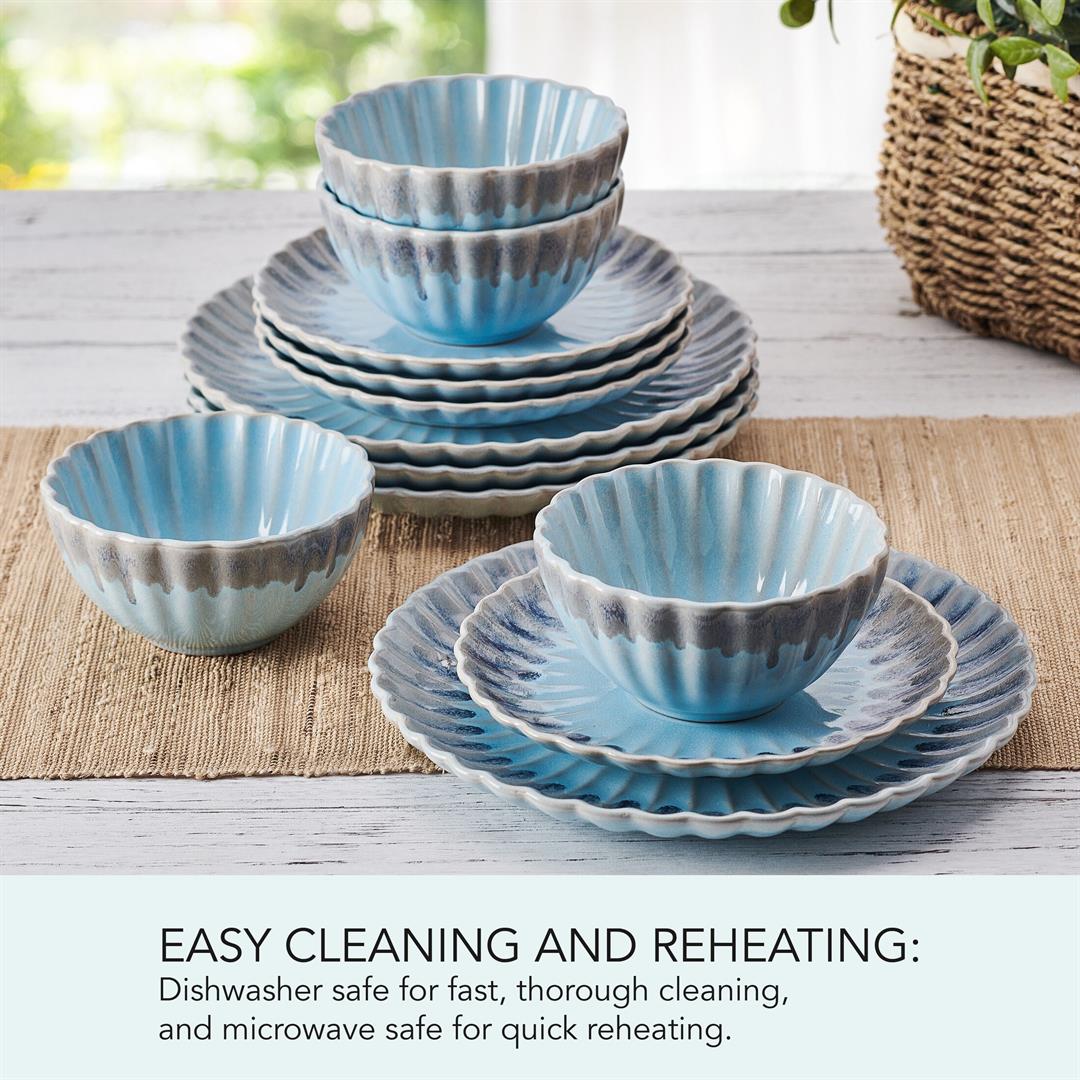 Defy expectations with this Lucinda 12-Piece Dinnerware Set by Pfaltzgraff. Beautifully crafted of high-quality stoneware for strength and durability, this stunning collection creates a mesmerizing tablescape with a scalloped design and color fade from blue to gray that brings to mind the natural visual elements of a seashell. This unique dinnerware is perfect adding modern allure to your everyday dining or light entertaining table setting. 12-piece set, service for 4, includes 4 each of: 10-inch dinner plate, 8-inch salad plate, and 2-3/4 inches high by 5-1/2 inch diameter all-purpose bowl with a 17-fluid ounce capacity. Microwave and dishwasher safe.