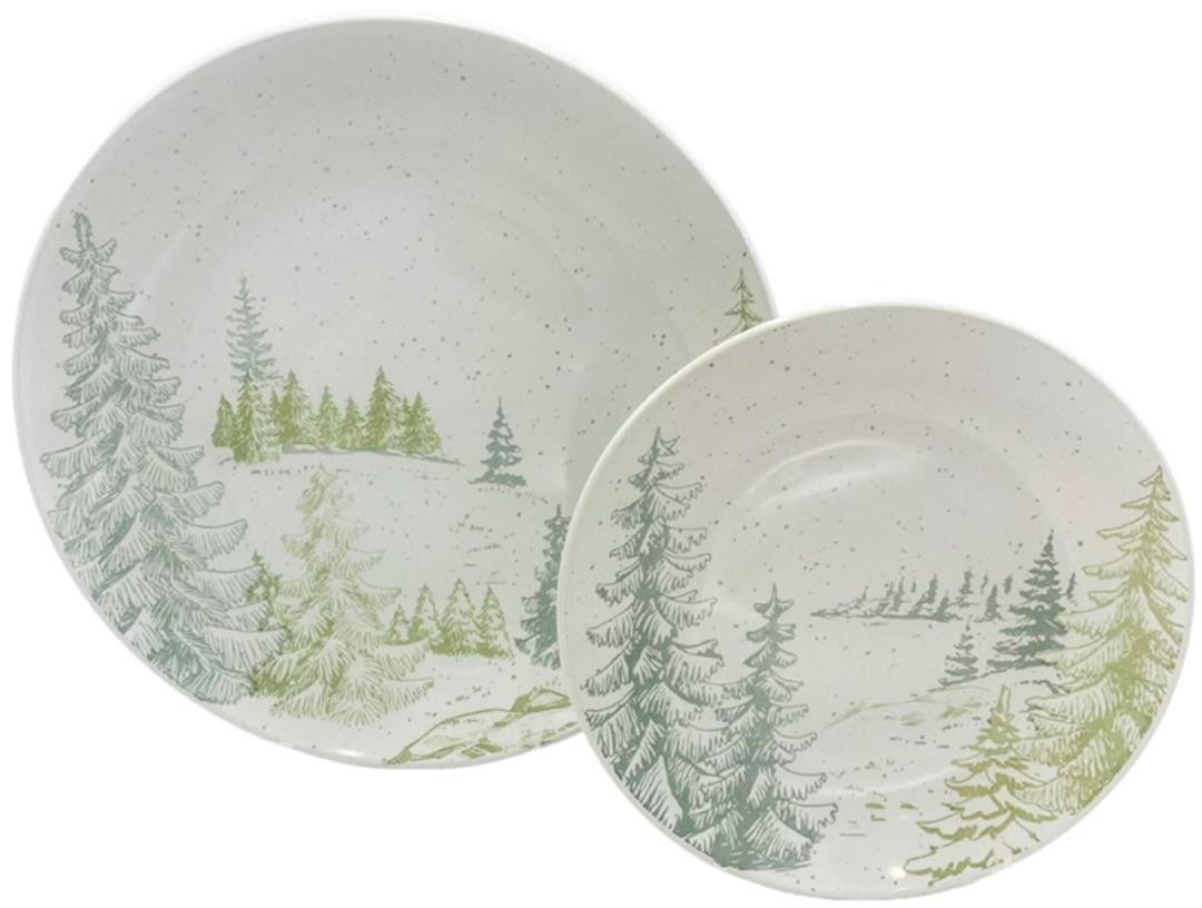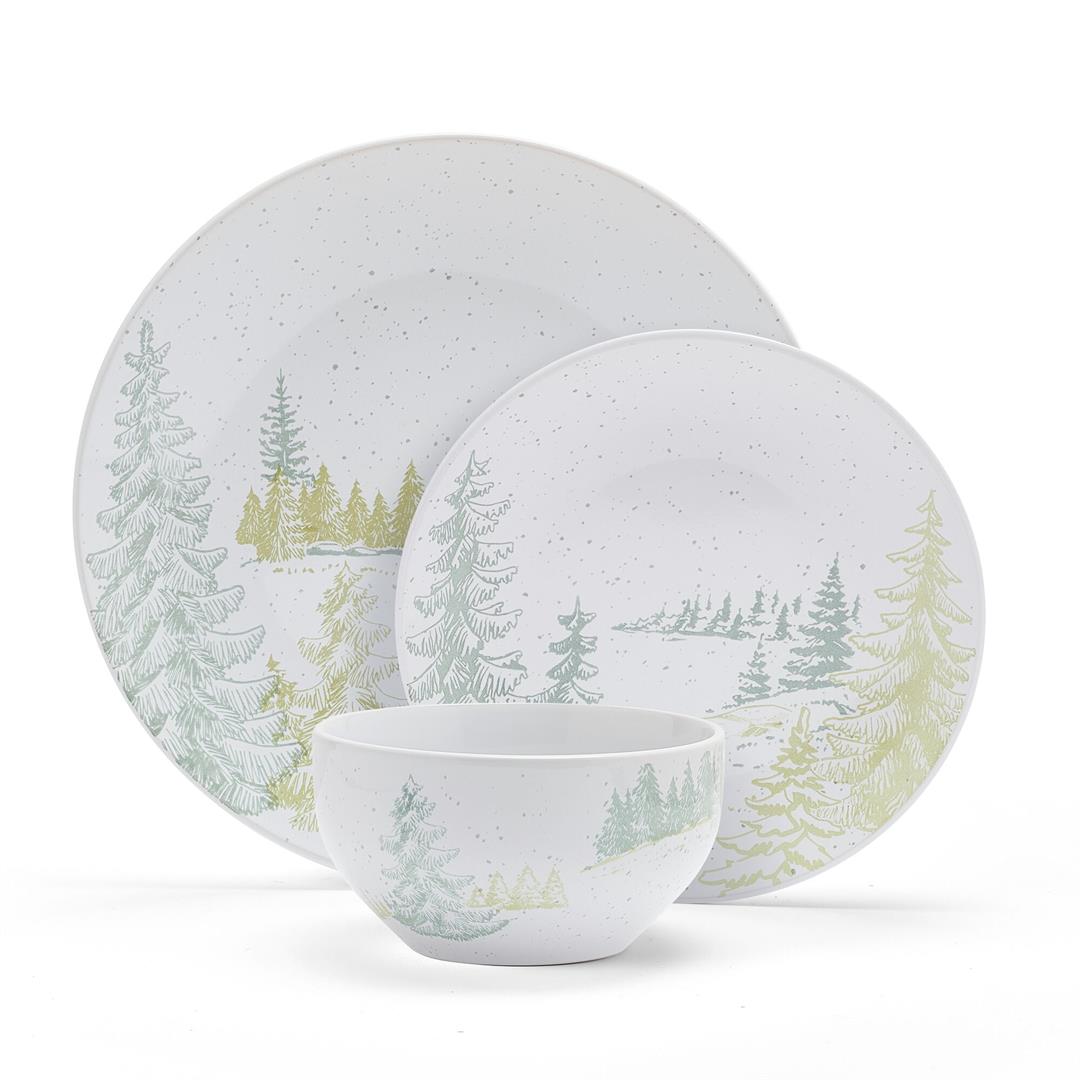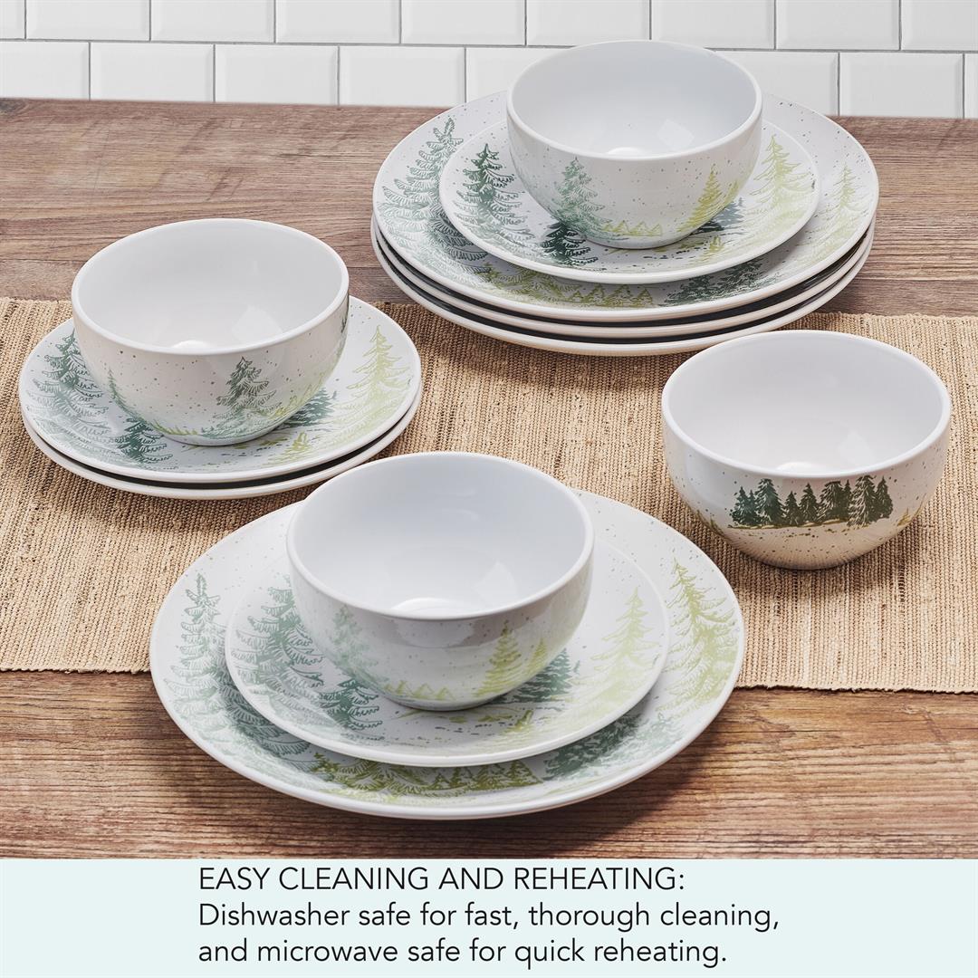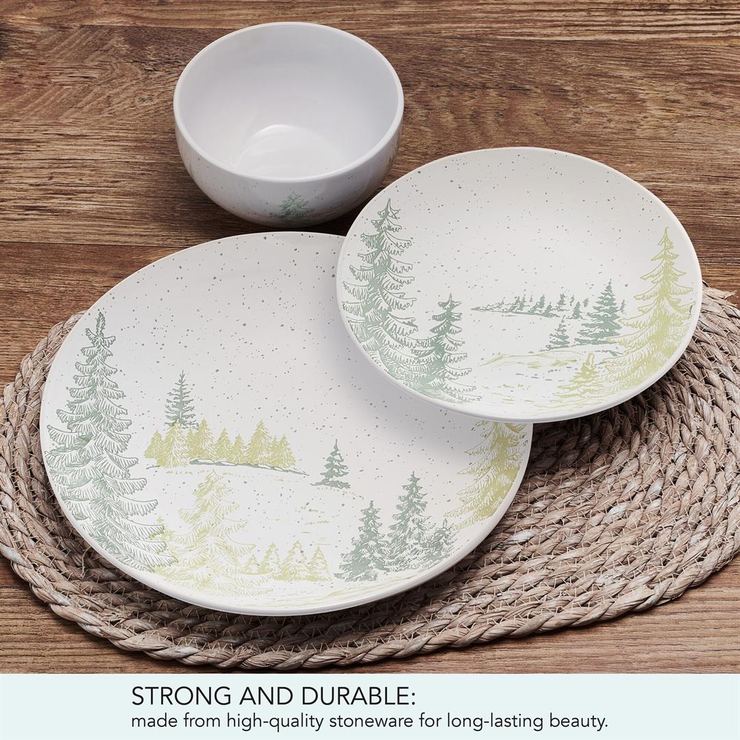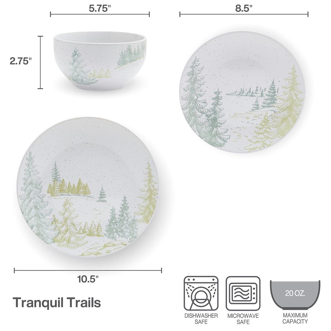 RUSTIC STYLE: Tranquil Trails evokes a rustic and cozy atmosphere, featuring earthy tones and nature-inspired motifs that transport diners to a cozy cabin retreat. STUNNING FINISH: due to the nature of the speckle glaze, no two pieces are exactly alike and will exhibit unique variations in color and pattern, therefore product may slightly differ from image shown BEAUTIFULLY CRAFTED: made of high-quality stoneware 12-PIECE SET: includes 4 each of: 10-1/2 inch dinner plate, 8-inch salad plate, and 2.75-inch high by 5.25-inch diameter all-purpose bowl with a 20-fluid ounce capacity EASY CLEANING AND REHEATING: dishwasher safe for fast, thorough cleaning, and microwave safe for quick reheating BEAUTIFULLY CRAFTED: made of high-quality stoneware 12-PIECE SET: includes 4 each of: 10-1/2 inch dinner plate, 8-inch salad plate, and 2.75-inch high by 5.25-inch diameter all-purpose bowl with a 20-fluid ounce capacity EASY CLEANING AND REHEATING: dishwasher safe for fast, thorough cleaning, and microwave safe for quick reheating