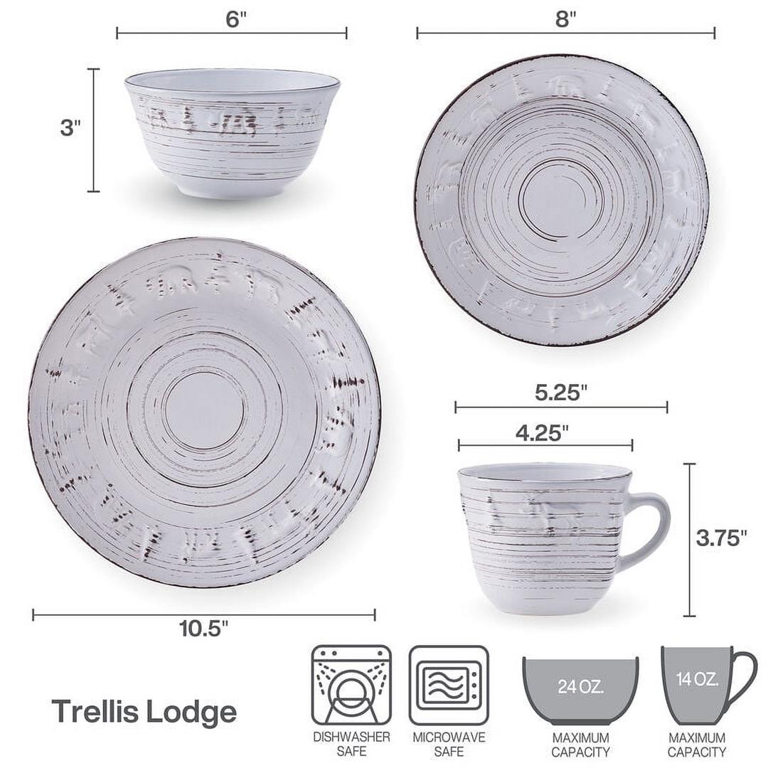 Escape to the country every time you sit down for a meal with this Trellis Lodge White 16-Piece Dinnerware Set by Pfaltzgraff. Dark striations swirling around each piece give this collection the weathered look of rustic elements in a summer garden, and subtle, embossed pine trees and animal designs around the rims complete the look. Crafted of high-quality stoneware for strength and durability. 16 piece set, service for 4, includes: 4 each of 10-1/2 inch dinner plate, 8-inch salad plate, 6-inch wide 3-inch height all-purpose wide bowl with a 24-fluid ounce capacity, and 4-1/4 inch wide and 3-3/4″ height with a 14 fluid ounce capacity mug. Microwave and dishwasher safe. .
