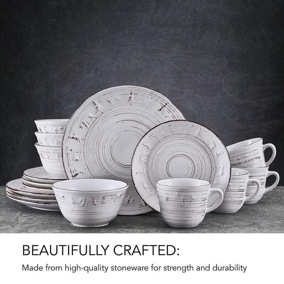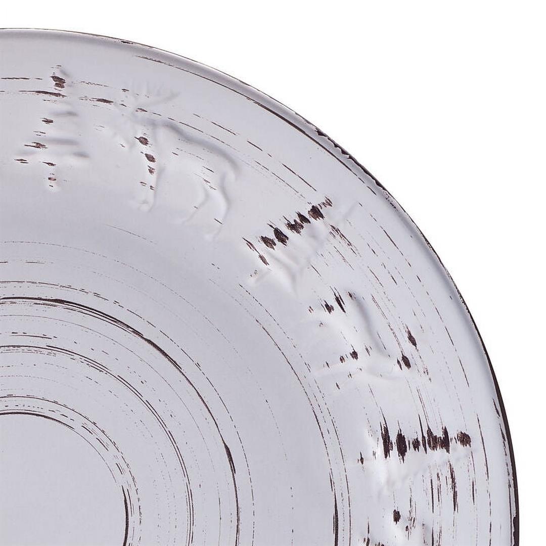 ANTIQUED FINISH: dark striations swirling around each piece give this collection the weathered look of rustic elements in a summer garden LODGE STYLE: each piece is adorned with subtle, embossed pine trees and animal designs around the rims BEAUTIFULLY CRAFTED: Made from high-quality stoneware for strength and durability 16-PIECE SET: includes 4 each of 10-1/2 inch dinner plate, 8-inch salad plate, 6-inch wide 3-inch height all-purpose wide bowl with a 24-fluid ounce capacity, and 4-1/4-inch wide and 3-3/4-inch height with a 14 fluid ounce capacity mug EASY CARE AND QUICK REHEATING: Dishwasher safe for fast, simple cleanup, and microwave safe for quick reheating
