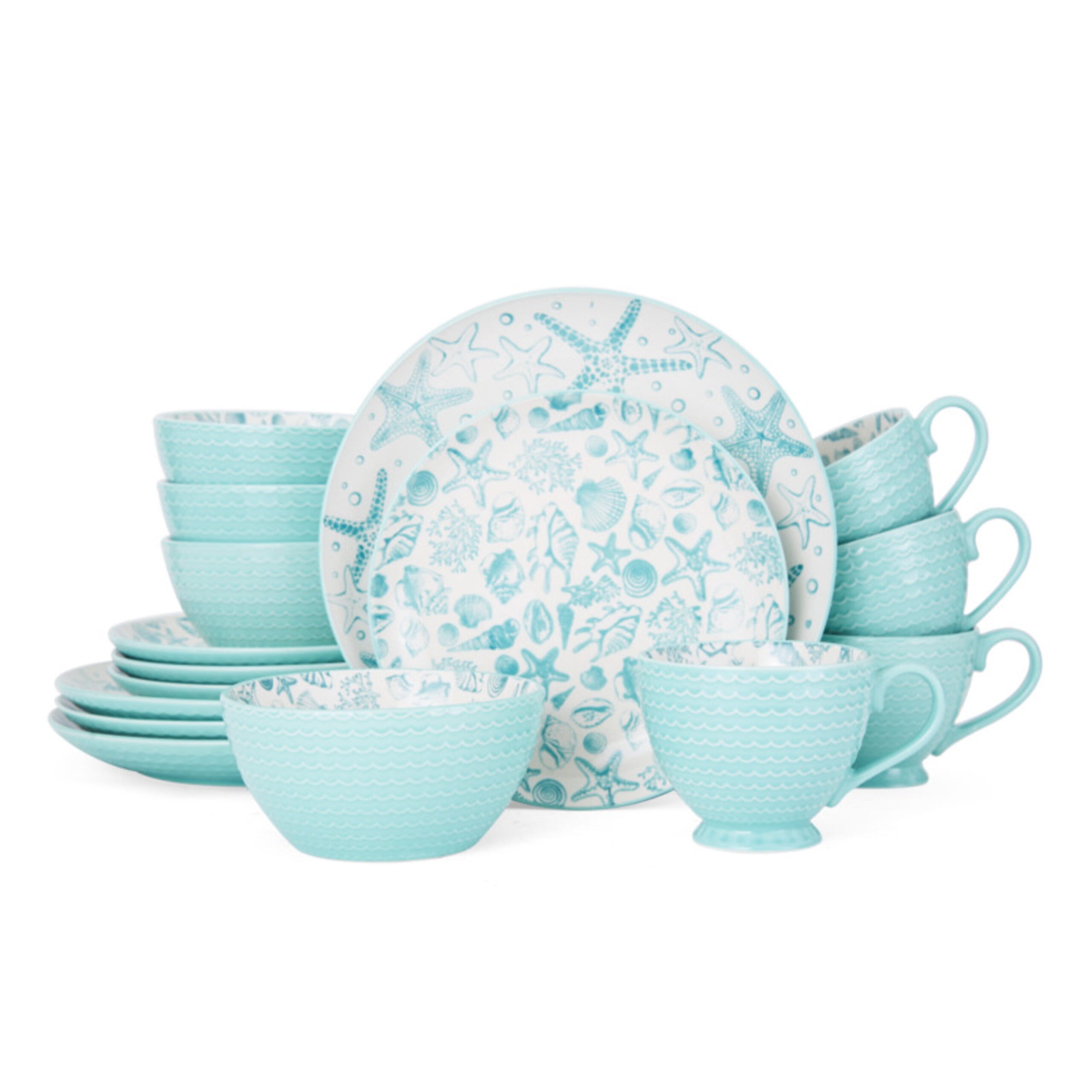 Features A Toss Of Starfish Shells And Other Coastal Icons 16-Piece Dinnerware Set Includes 4 Each Of: 10-1/2 Inch Dinner Plate, 8-Inch Salad Plate, 6-Inch Cereal Bowl, And 12-Ounce Mug Made Of High Quality Stoneware For over 200 years the Pfaltzgraff brand has been associated with the highest quality ceramic products available for the home. The company grew from a modest-size pottery shop that produced simple earthenware, salt-glazed stoneware crocks and even flower pots into one of the best known designers and marketers of dinnerware, drinkware, ceramic accessories, giftware, flatware and other products. Pfaltzgraff has a long-standing tradition of excellence in craftsmanship, quality and service. Today, like never before and like nowhere else, this tradition extends to the finest, widest variety of home products available in the best home brands. This commitment to being responsive to its customers, and to adapting its products and policies to their ever-changing needs, has enabled Pfaltzgraff to prosper for almost two centuries. Pfaltzgraff Venice Teal Stoneware 16-Piece Dinnerware Set: 5217125