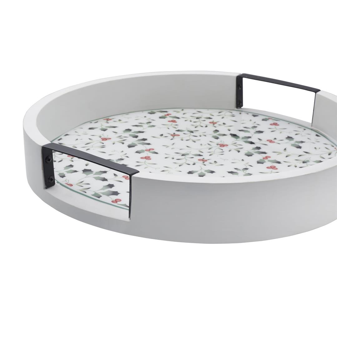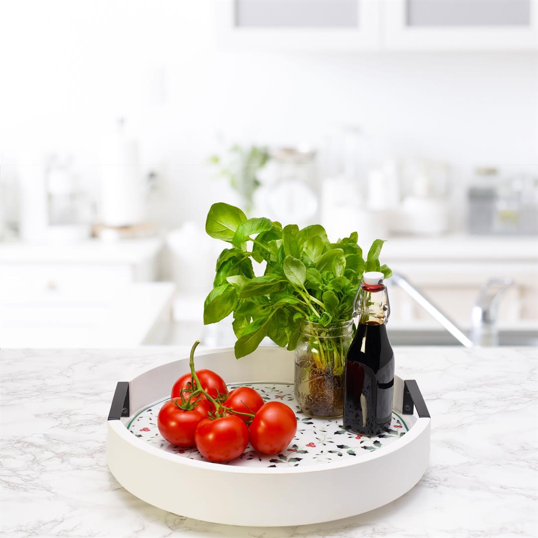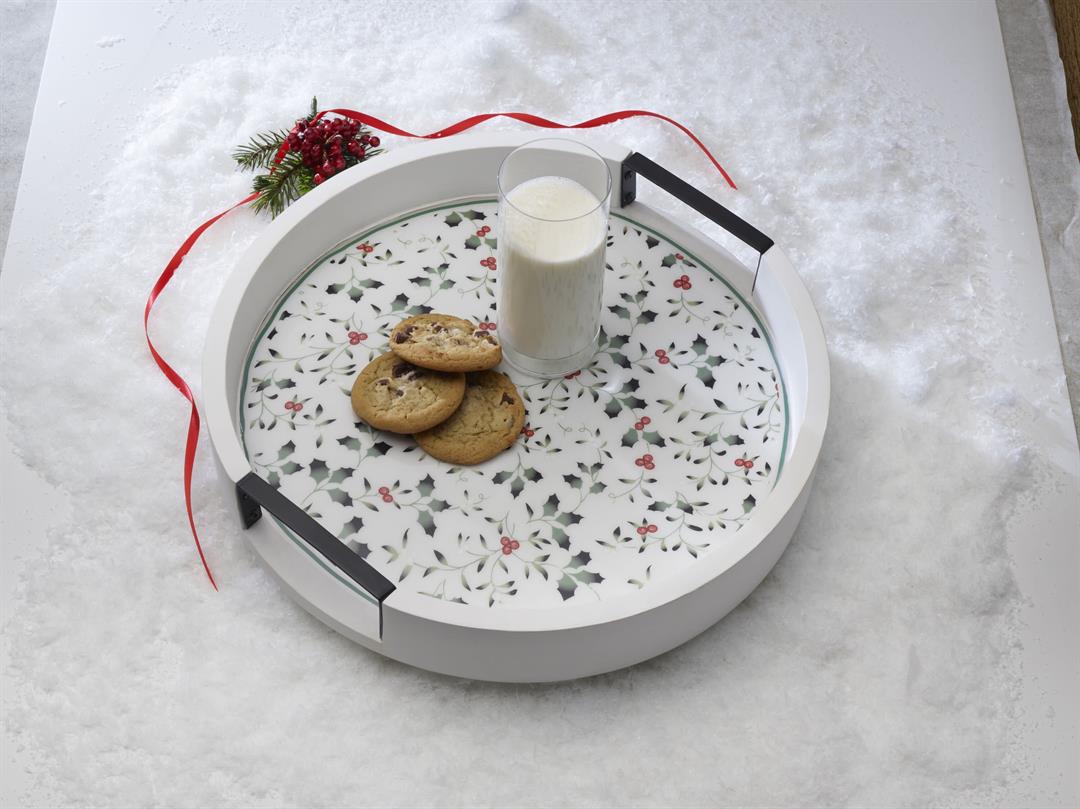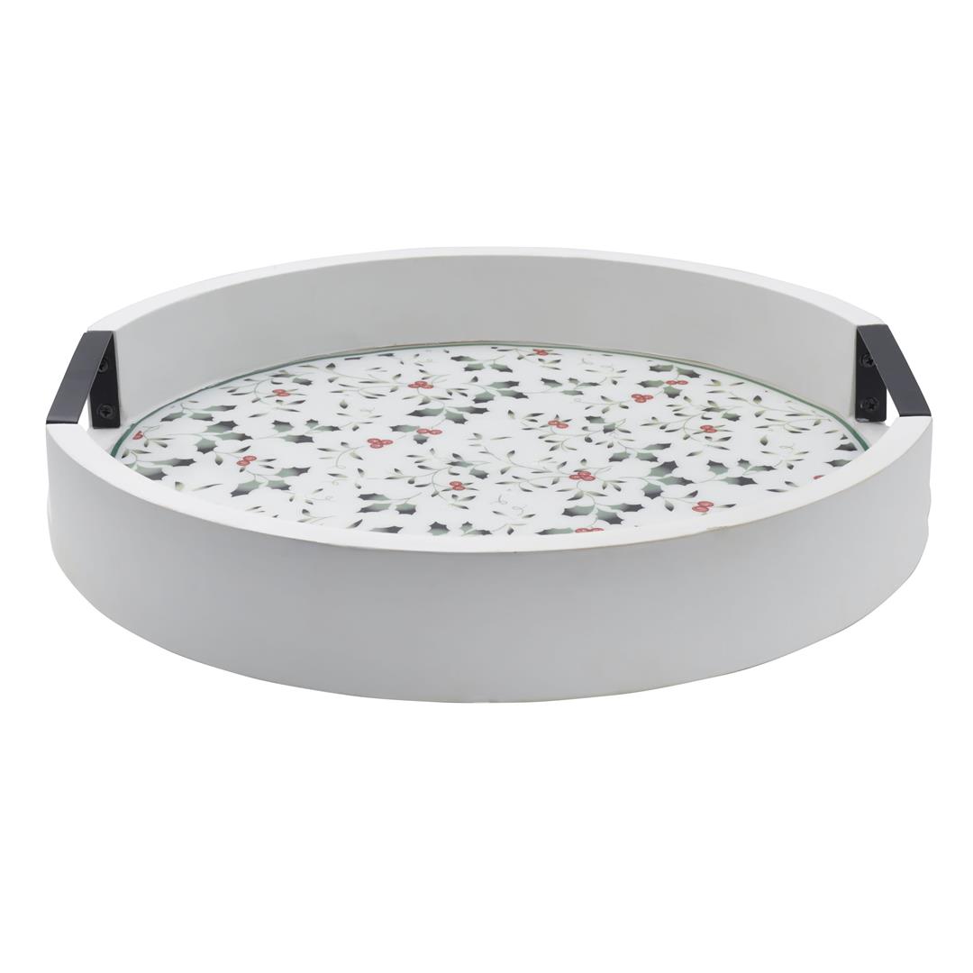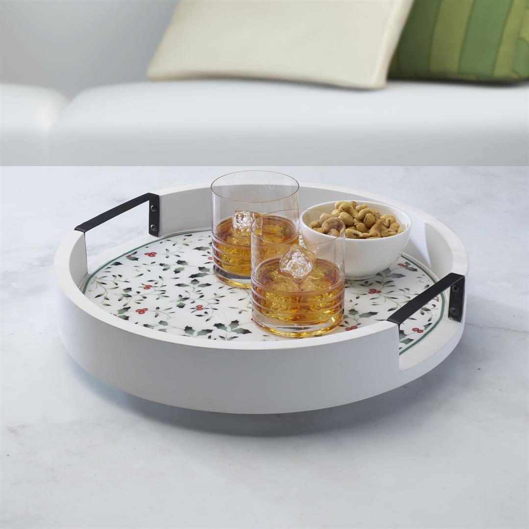 As fall turns to winter, bright holly berries make their appearance. Winterberry dinnerware by Pfaltzgraff is the holiday classic that brings this timeless motif to life in elegantly sculpted dinnerware and serveware, beautiful glassware, and joyous giftware. This festive Winterberry Lazy Susan is handcrafted of whitewash mango wood with iron handle cutouts, and is adorned with the green and red Winterberry pattern to bring seasonal charm to your table. The large surface provides plenty of space for bowls, condiment bottles, and more. The rotating design allows everyone at the table quick, easy access to contents with a simple spin, and the high walls ensure items stay in place. Measures 3 inches tall with a 16-inch diameter. Wipe clean with a soft, damp cloth. .