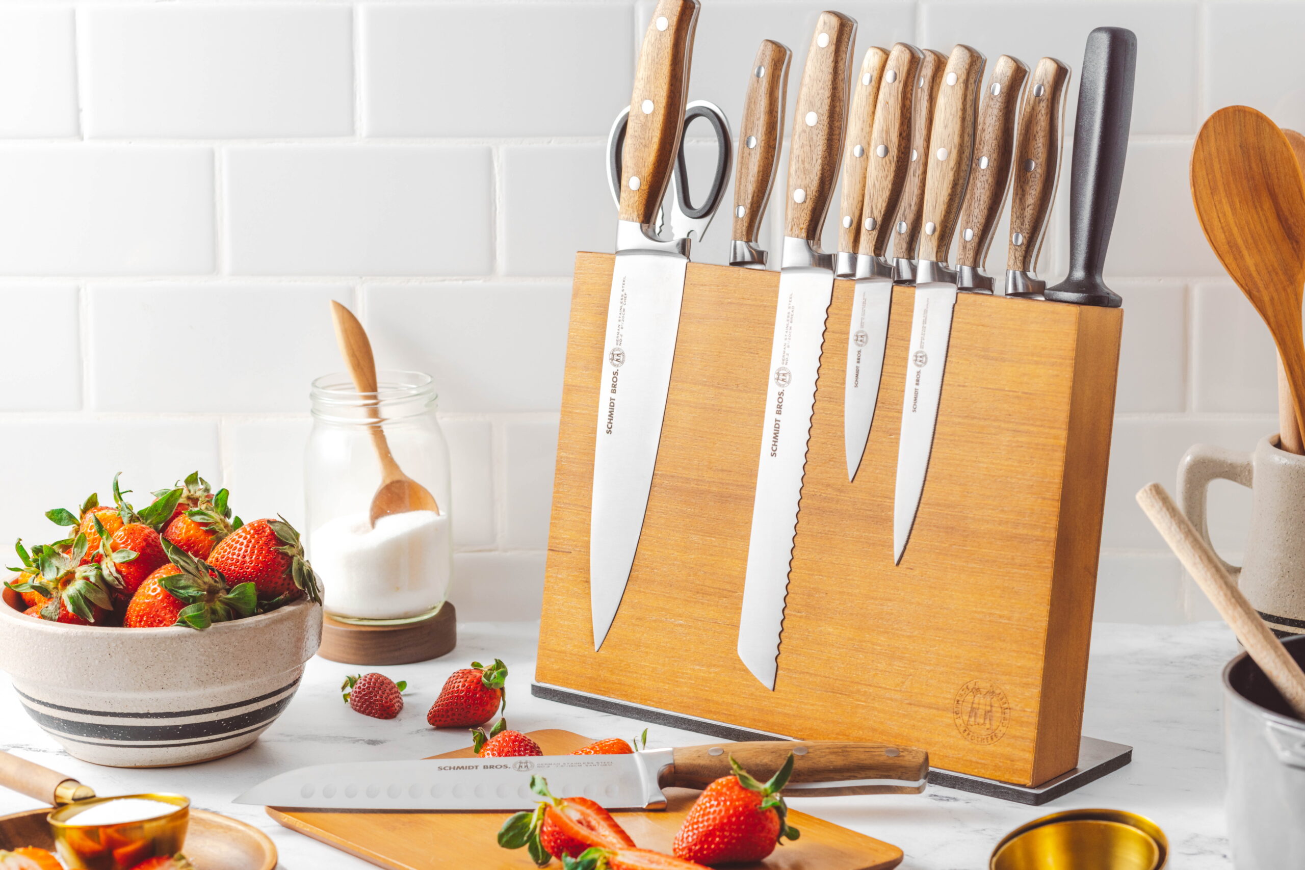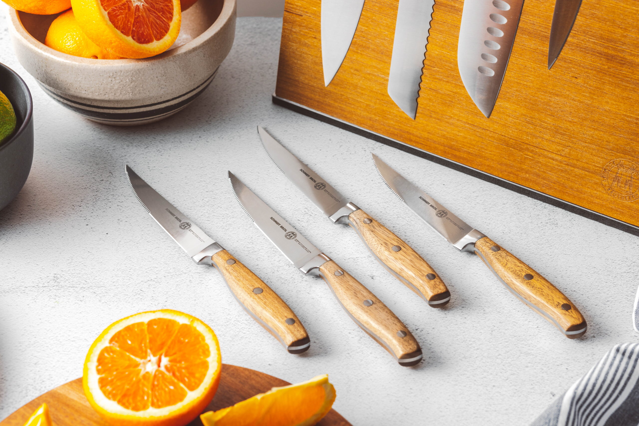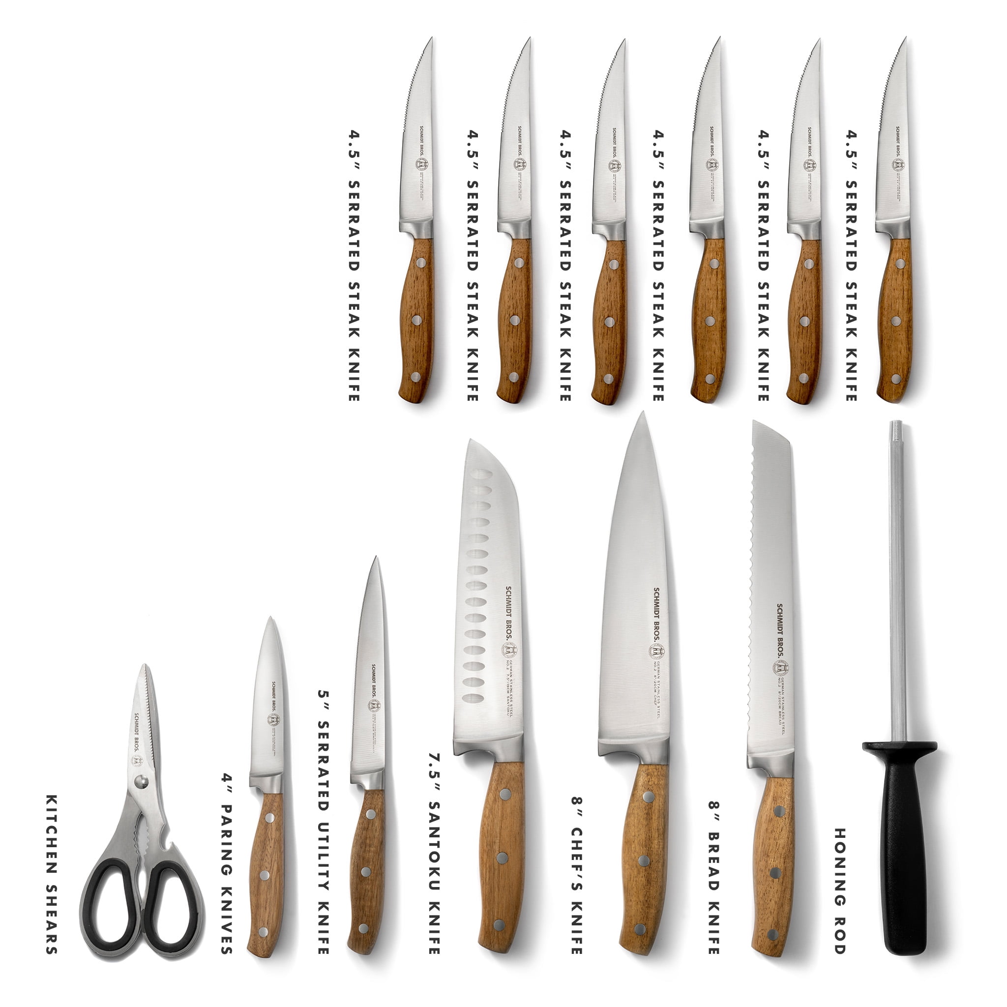 2.0 – 2.5 mm (depending on knife) German Stainless Steel 1.4116 Forged Full Tang HRC 59 +/- Double Bevel Straight Edge (or) Serrated Edge (Depending on Knife) Magnetic Universal Storage Block Kitchen Knife Block Set Includes: 8″ Chef Knife 8″ Bread Knife 7.5″ Santoku Knife 5″ Serrated Utility Knife 4″ Paring Knife 6 x 4.5″ Serrated Steak Knives 1 x Kitchen Shears 1 x Honing Rod 1 x Magnetic Universal Storage Block Make the most of your Schmidt Bros products! By purchasing this set, you are invited to join The Cutting Edge, a FREE, chef-led virtual culinary class, exclusively available for Schmidt Bros. customers.