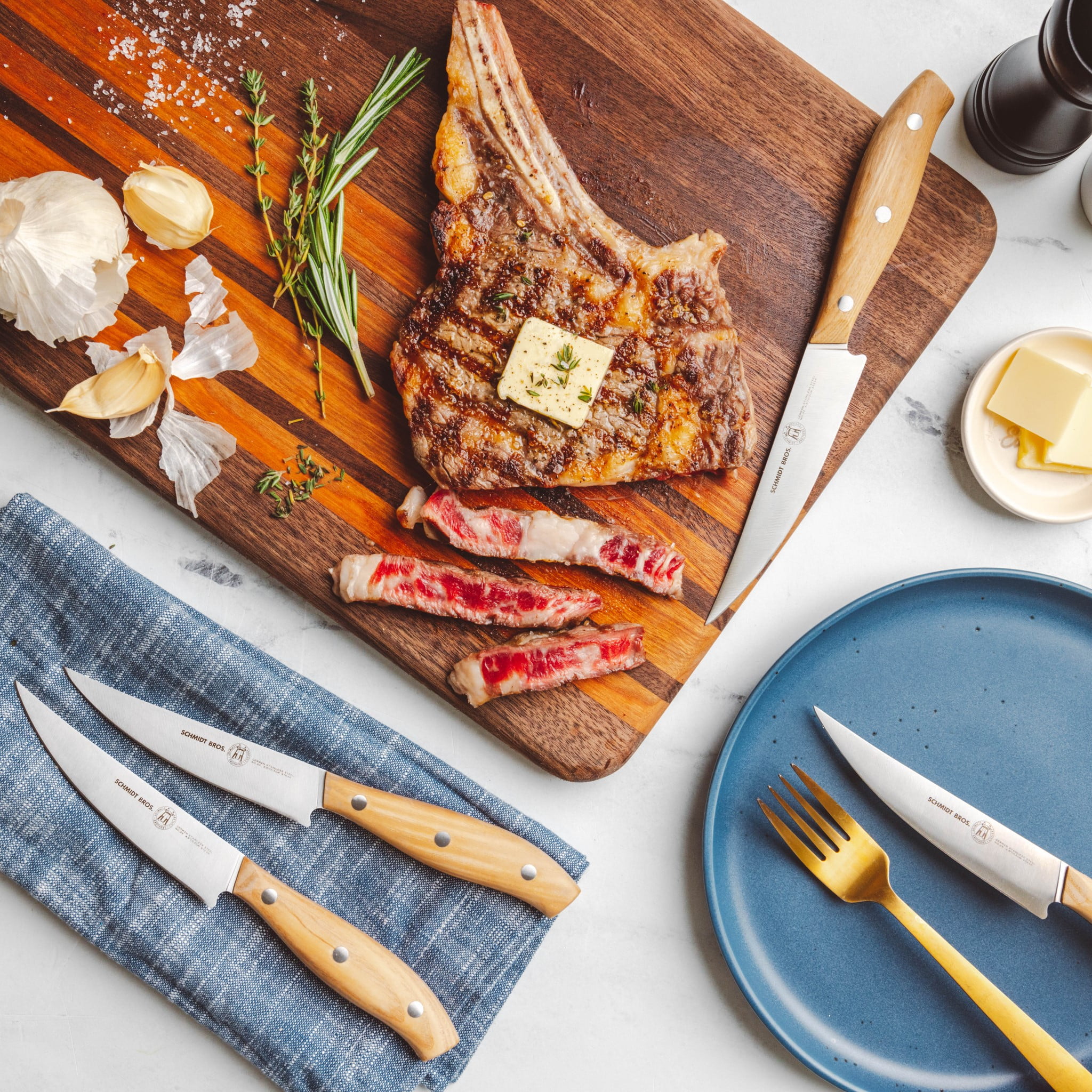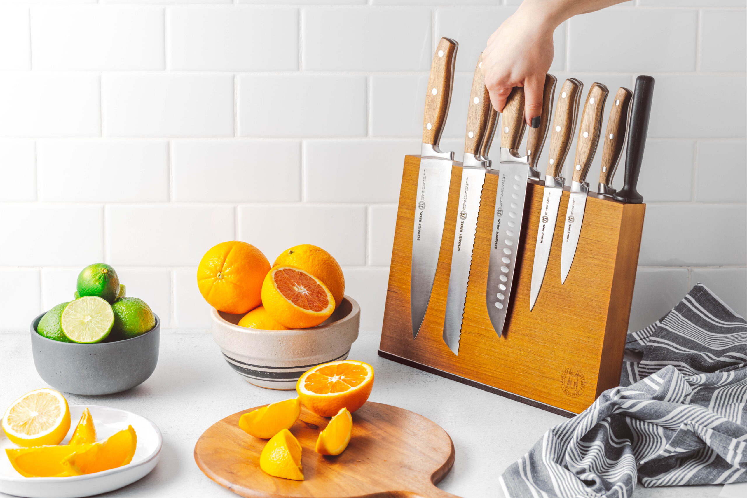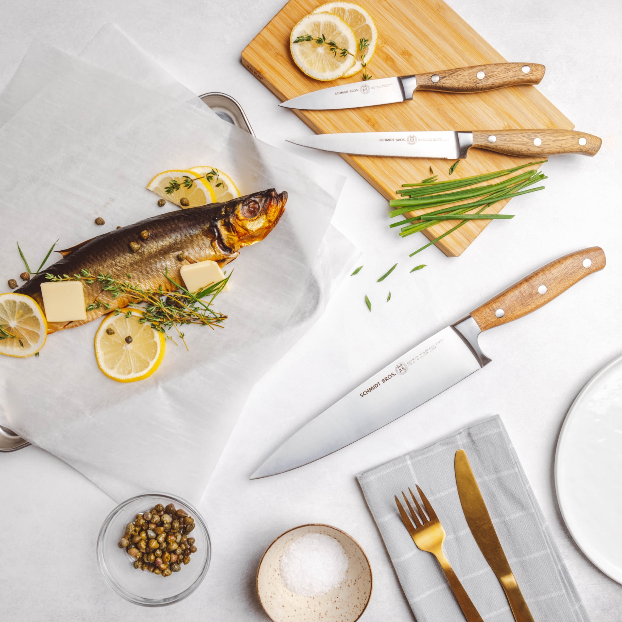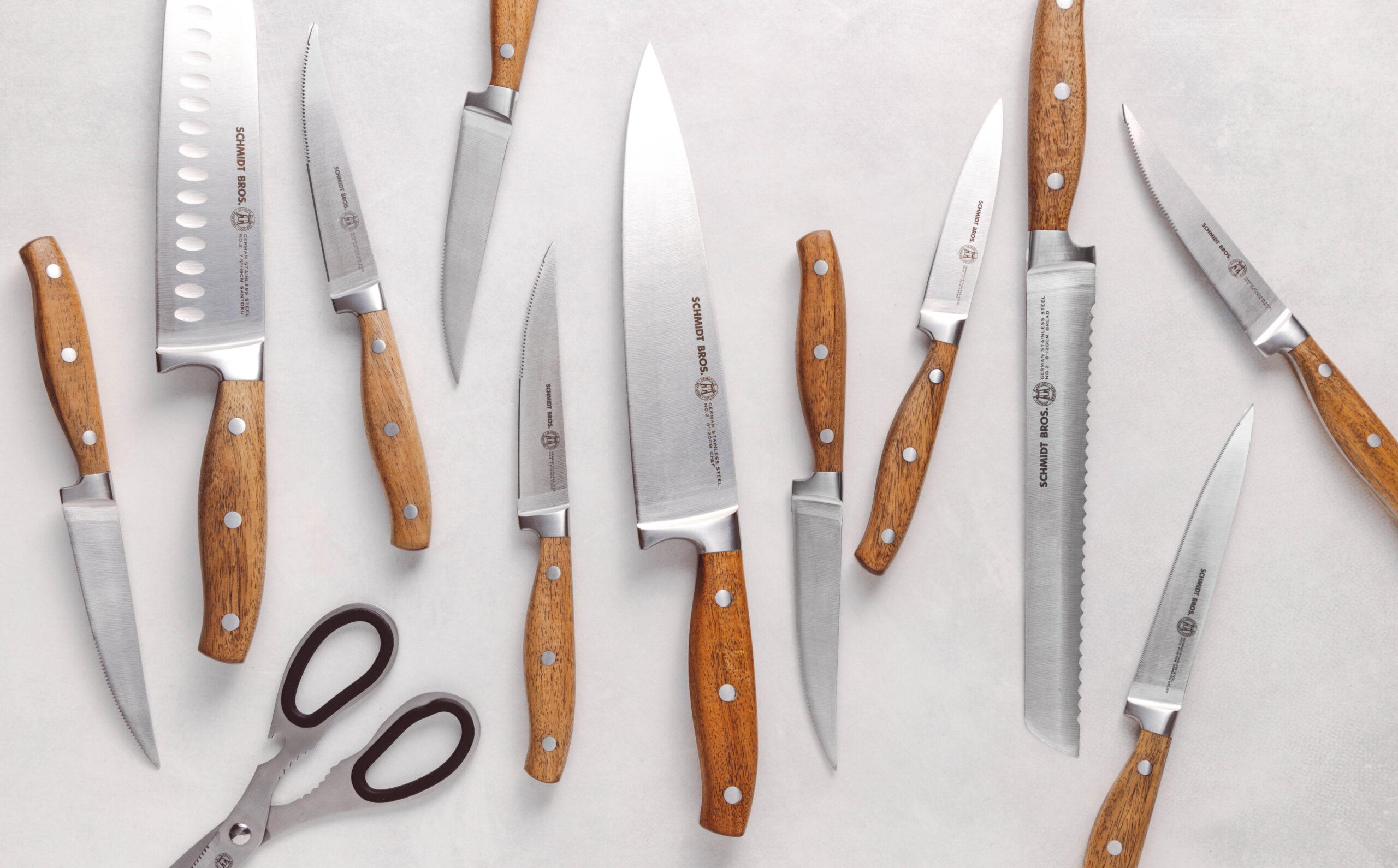 2.0 – 2.5 mm (depending on knife) German Stainless Steel 1.4116 Forged Full Tang HRC 59 +/- Double Bevel Straight Edge (or) Serrated Edge (Depending on Knife) Magnetic Universal Storage Block Kitchen Knife Block Set Includes: 8″ Chef Knife 8″ Bread Knife 7.5″ Santoku Knife 5″ Serrated Utility Knife 4″ Paring Knife 6 x 4.5″ Serrated Steak Knives 1 x Kitchen Shears 1 x Honing Rod 1 x Magnetic Universal Storage Block Make the most of your Schmidt Bros products! By purchasing this set, you are invited to join The Cutting Edge, a FREE, chef-led virtual culinary class, exclusively available for Schmidt Bros. customers.