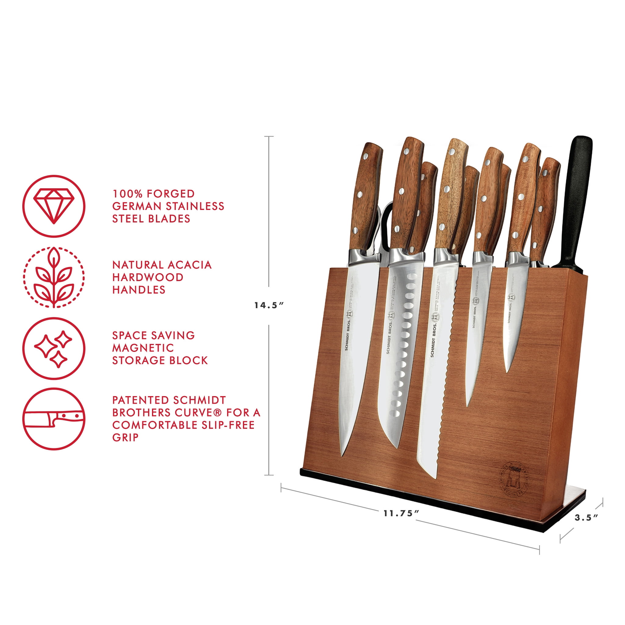 Family roots and memories are forged in the kitchen. Crafted from 100% natural Acacia Wood and fully forged, ultra-sharp German Stainless Steel, this modern twist on a traditional design will surely deliver for generations to come. Engineered for ultimate comfort and performance, our knives include a patented Schmidt Brothers Curve – giving you a comfortable grip, reduced slippage, and ultimate ease of use. Our universal, magnetic storage block will save space on your counter while adding a beautiful conversation piece! The perfect Kitchen Knife Set.