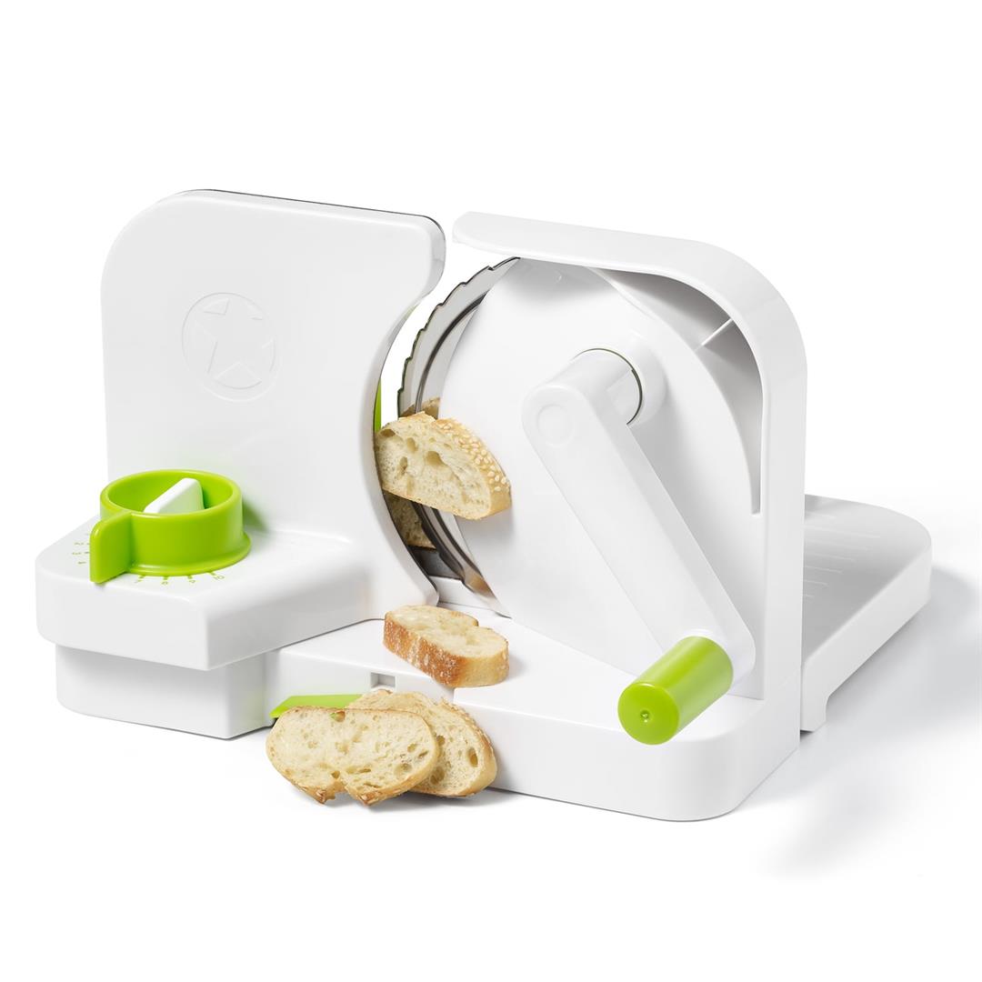 6.5-in. stainless steel serrated rotary blade Cuts ideal slices: adjustable thickness settings from deli thin to 1 in. Great for cutting oversized food Quickly cuts a baguette without a mess Food pusher, sliding food carriage, and thumb guard for safety Sturdy base and extra-large, non-slip suction base for added stability Easy to store: all pieces are nestable for compact and safe storage and it folds for convenient storage All pieces are detachable for cleaning Includes handle, blade-locking screw, sliding food carriage, thumb guard, and food pusher