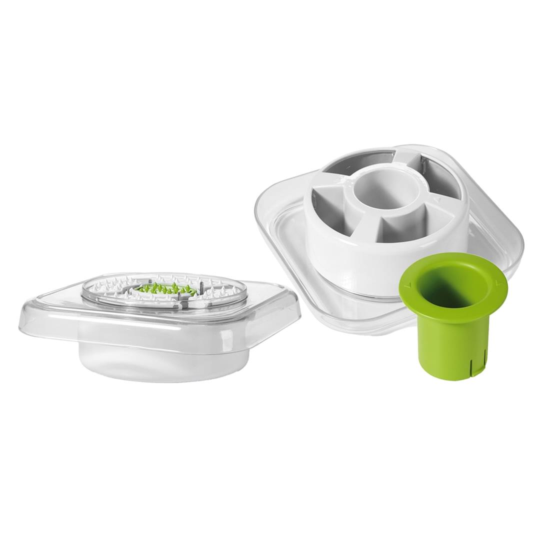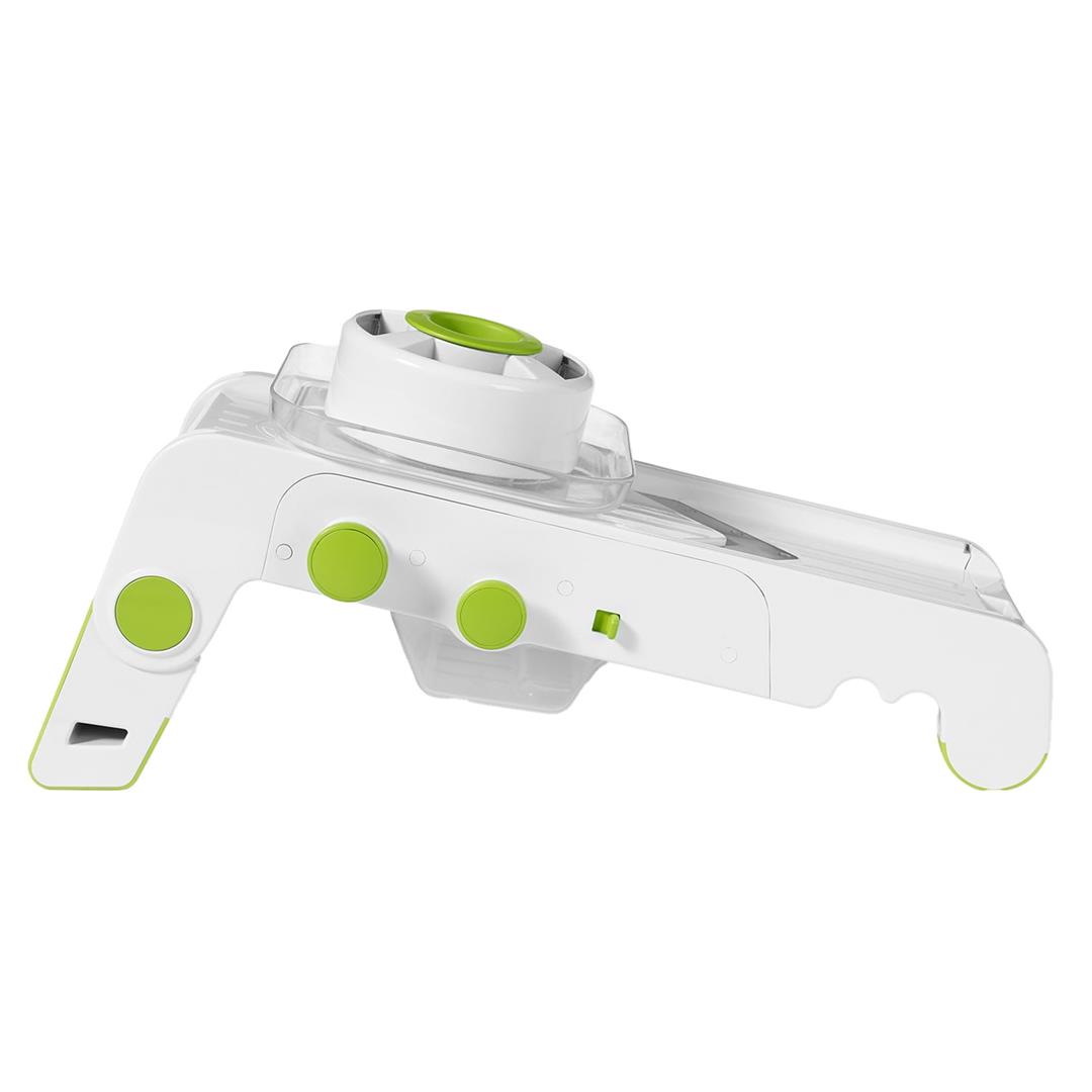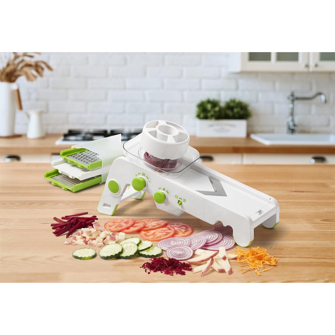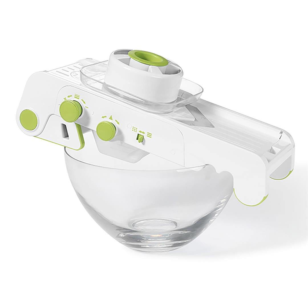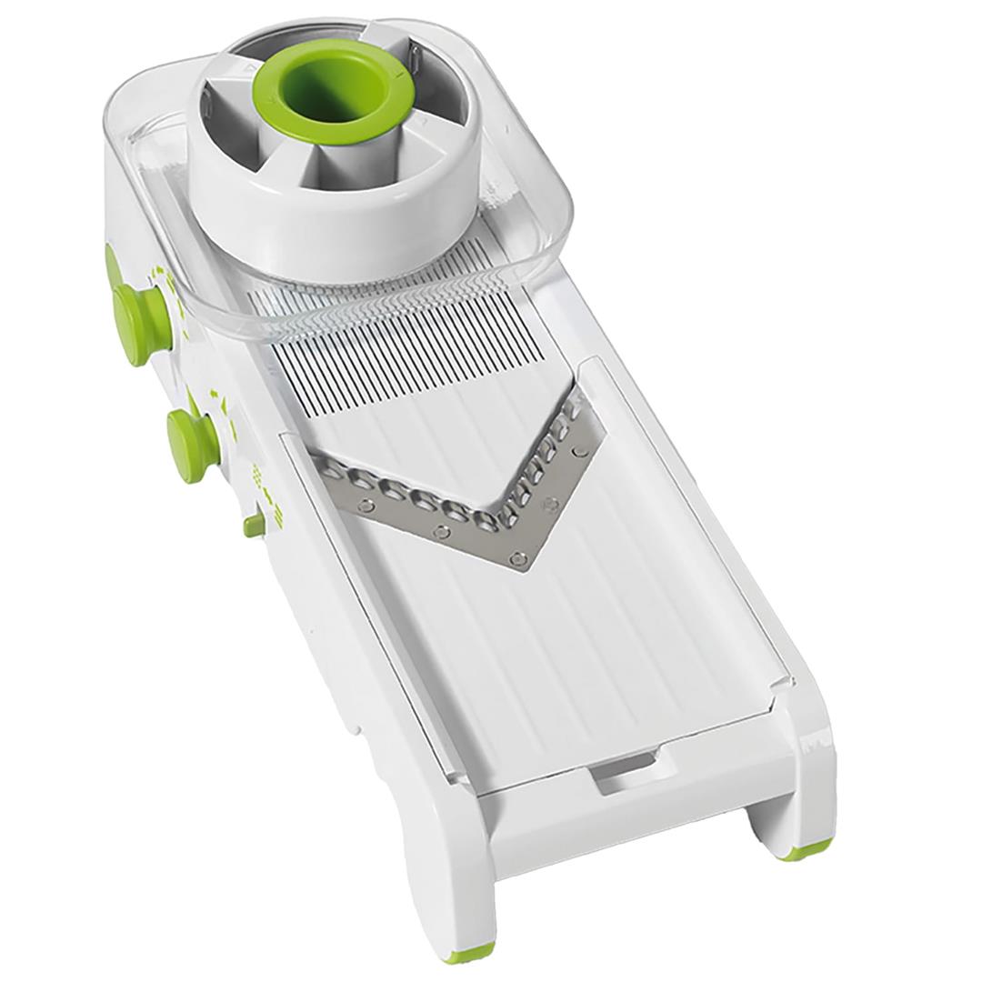 10 different slice thickness settings (0.04 in. to 0.4 in.) 3 sizes of julienne (0.24 in., 0.47 in., and 0.71 in.) 30 varieties of cubes 4 interchangeable blades and graters (slicing V-blade, wavy blade, fine grating blade, and coarse grating blade) Ideal for onions, tomatoes, cucumbers, potatoes, or even for grating cabbage, cheese, or chocolate Exclusive tiltable blades for a resistance-free movement Guard with self-feeding opening for small vegetables Extra-large safety pusher prevents all hand contact with blades Notched on front to fit over any bowl size Non-slip feet for added stability Box for safe storage All pieces are dishwasher safe Includes storage box, hand guard, protective pusher, fine grating blade, coarse grating blade, and wavy blade