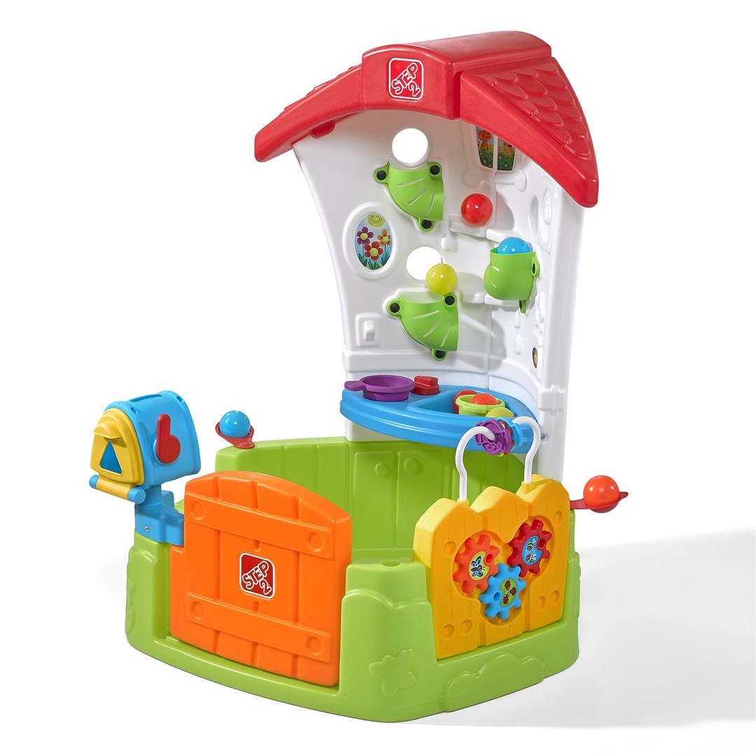 Exterior garden gate features three interlocked gears to help little ones improve their fine motor skills! Easy-open Dutch door also features a pass-thru mailbox with working mailbox flag. Junior-size kitchenette helps encourage pretend play Toss the play balls (included) into the maze tubes on the playhouse wall and watch as they bounce through the maze! Playhouse set features a 10-piece accessory set ? 5 play balls, 3 shape-sorting pieces along with a pot and pan set Garden gate can be removed for additional playtime when the playhouse is not in use.