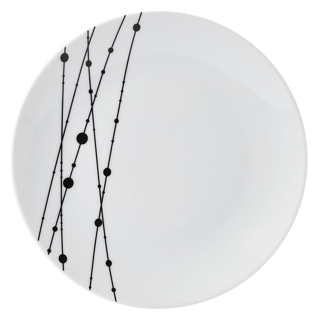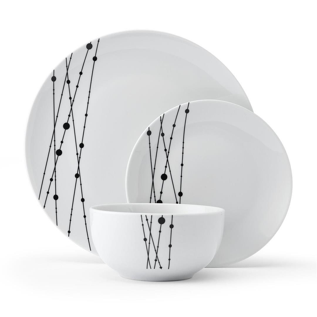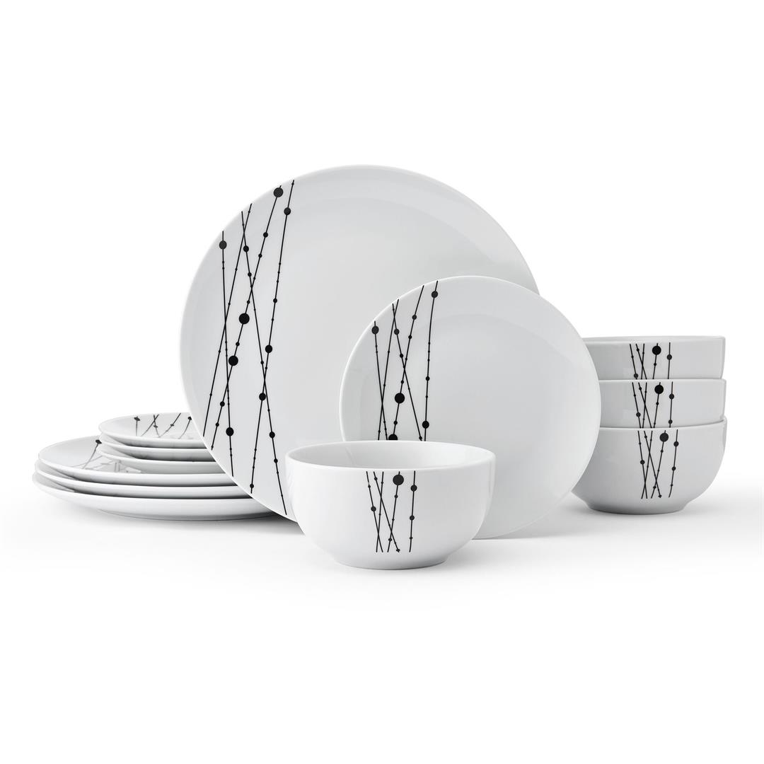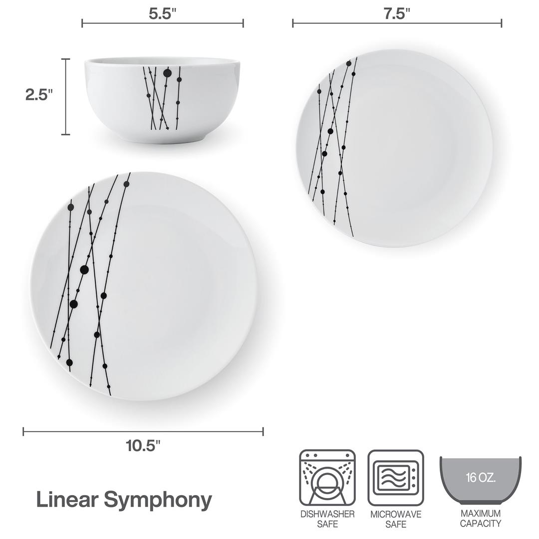 Add a touch of modern elegance to your dining table with this understated yet striking Studio Nova 12-Piece Linear Symphony Dinnerware Set. Made of durable, crisp white porcelain, this collection is adorned with an eye-catching black line and dot design that climbs up one side of each piece, making this a perfect pattern to elevate the presentation of meals. 12-piece set, service for 4, includes 4 each of: 10-1/2 inch dinner plate, 7-1/2 inch salad plate, and all-purpose bowl measuring 2-1/2 inch high by 5-1/2 inch diameter with a 16-fluid ounce capacity. Microwave and dishwasher safe.