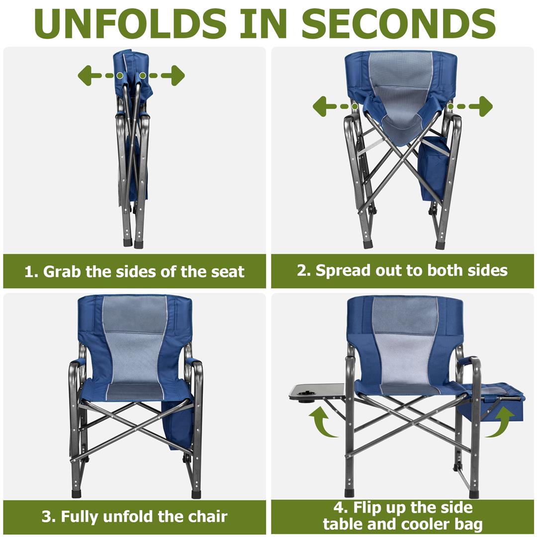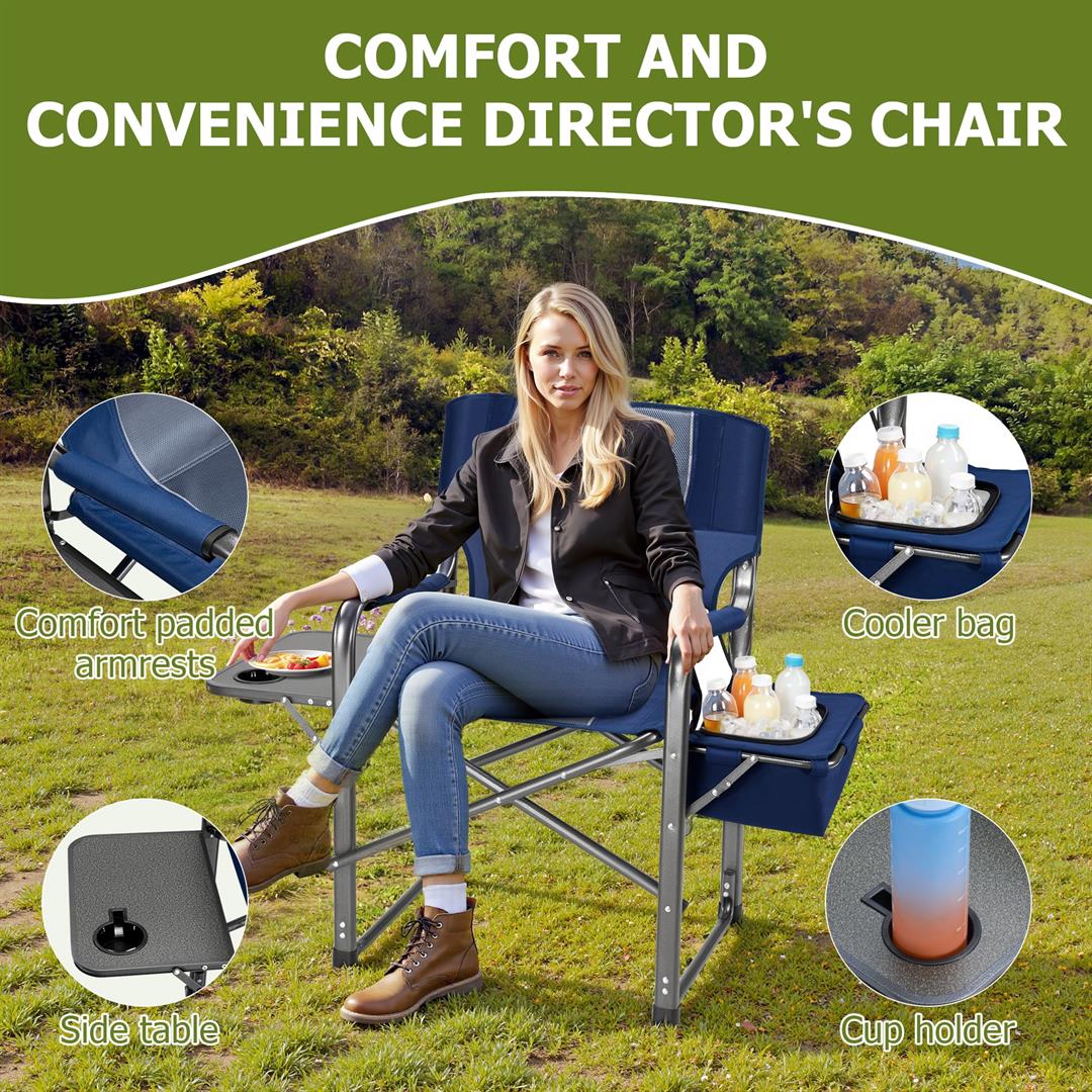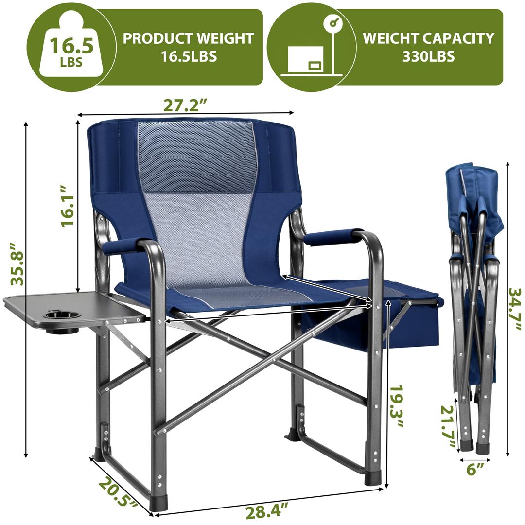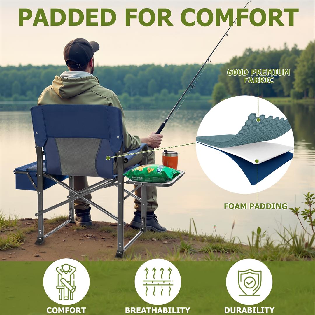 Side Table and Cooling Bag: Stay cool with the folding camping chair, featuring a multifunctional cooling compartment. It includes a spacious cooler bag and a deep cup holder to keep drinks chilled, perfect for outdoor relaxation or hosting guests. Durability: These heavy-duty camping chairs are built to last, supporting up to 300 pounds with a robust steel frame. The thickly padded seats and breathable mesh backrests provide exceptional comfort, ensuring you can enjoy extended periods of relaxation during outdoor activities. Portable Foldable Design: Folds down to half its original size for compact storage and transport. Equipped with a convenient handle strap, its effortless to carry to picnics, tailgates, or beach outings-no difficulty assembly required! User-Friendly Construction: Crafted with rust-resistant steel and reinforced joints, this chair withstands rugged outdoor use. The breathable mesh fabric prevents sagging, while the simple folding mechanism allows for quick setup and takedown when you’re on the go. Heavy-Duty Capacity: Designed for larger individuals, this chair boasts an extra-wide steel frame and a high-strength triangle bracket structure that securely supports up to 300 lbs. Built to last, it combines industrial-grade durability with reliable stability for worry-free use.