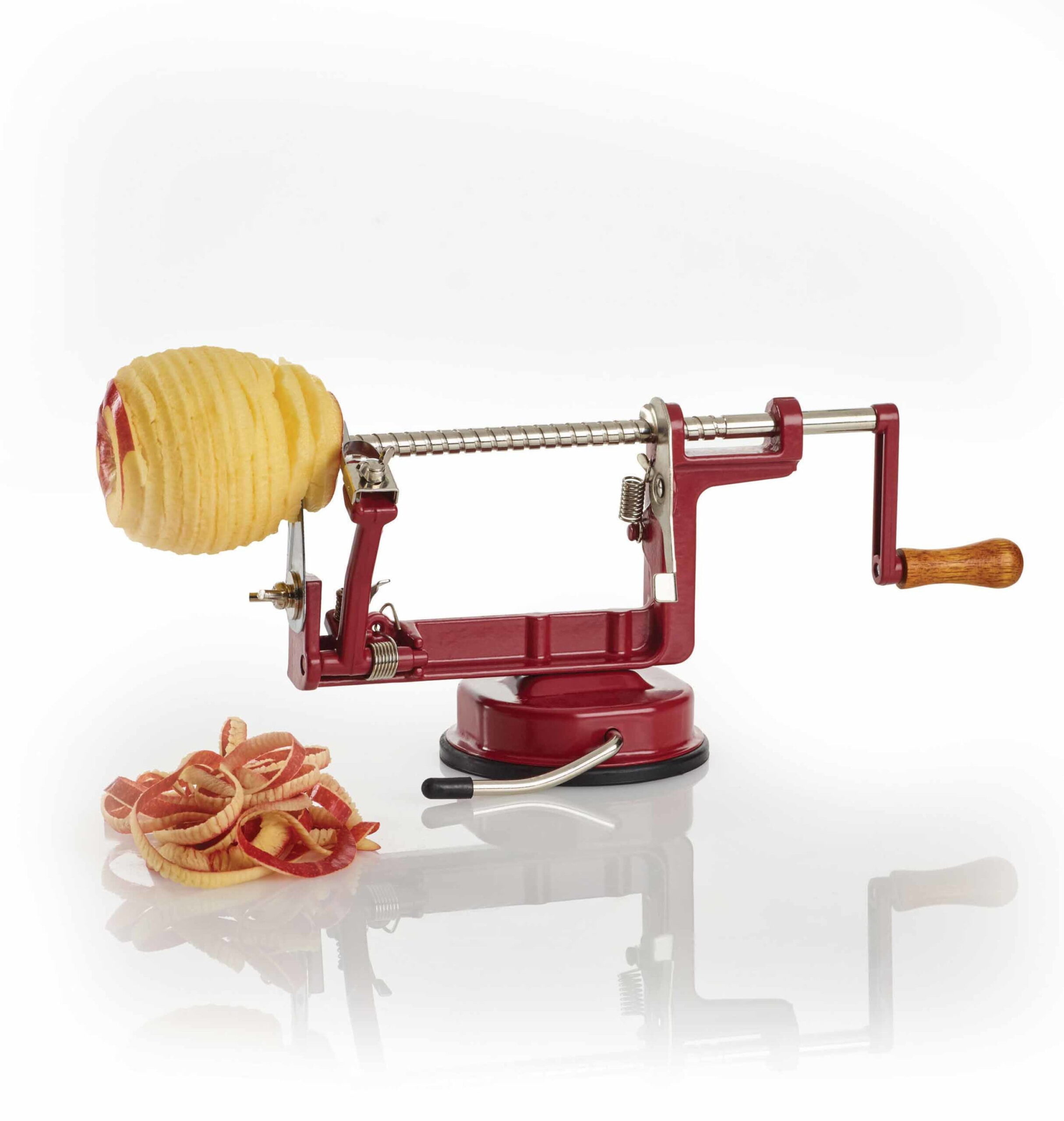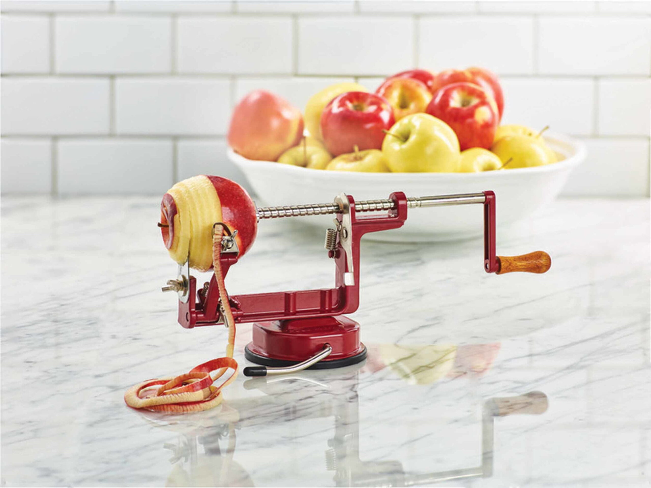 With classic style and function, makes easy work of coring, slicing, and peeling apples or potatoes Ideal for salads, pies, canning, drying, delicious treats, and everyday kitchen use Durably made of enamel-coated cast-iron with stainless-steel blades and a chrome shaft Suction cup base Hand wash only
