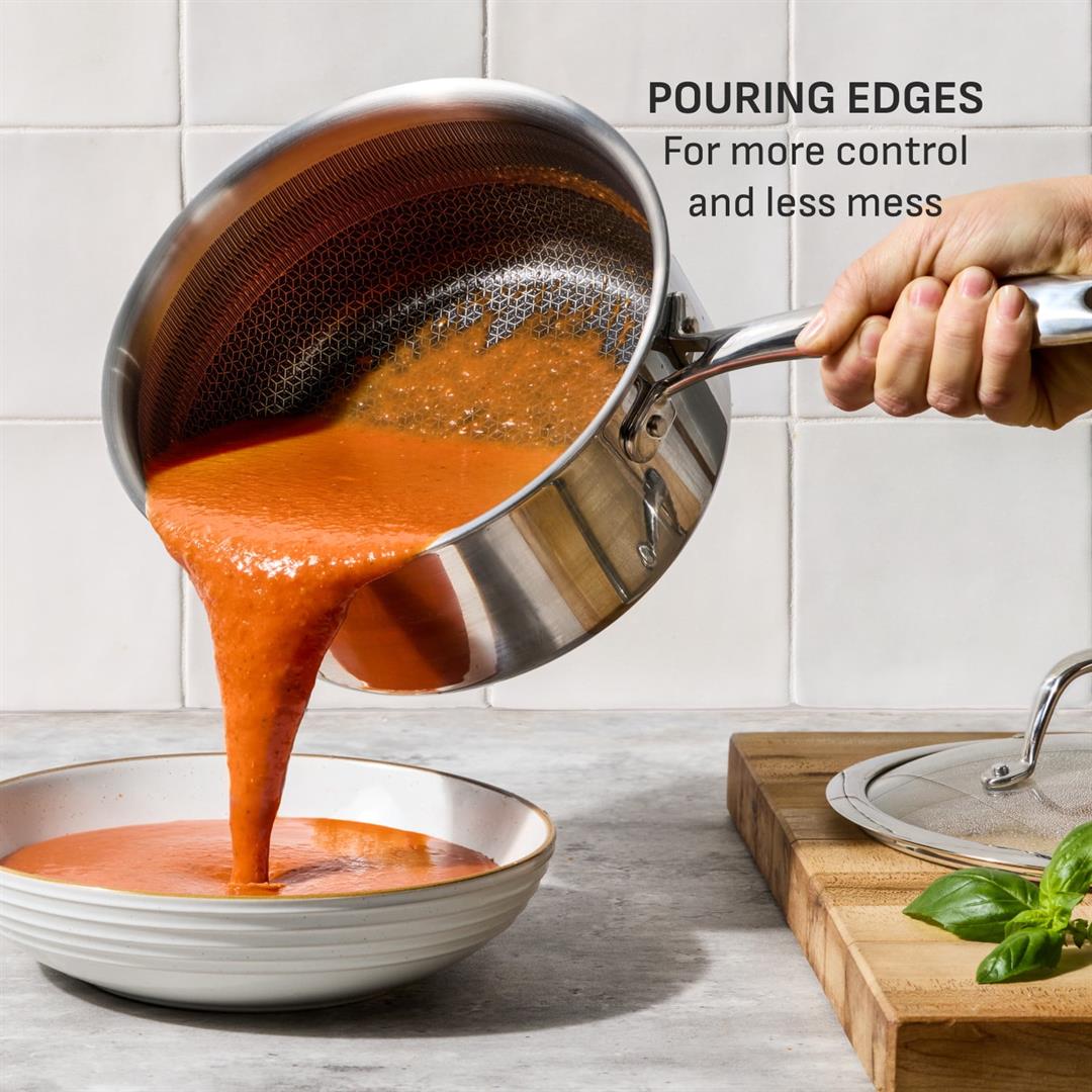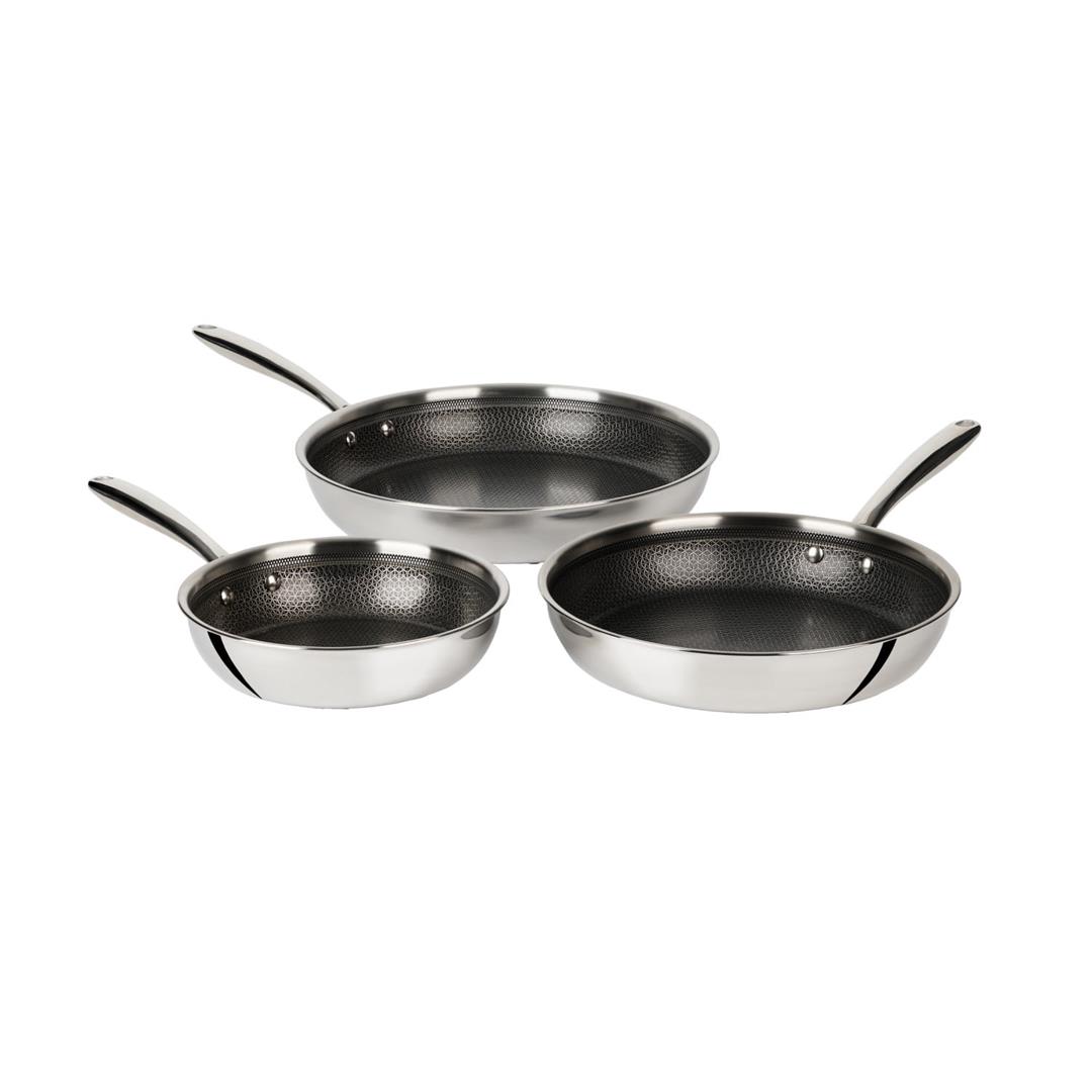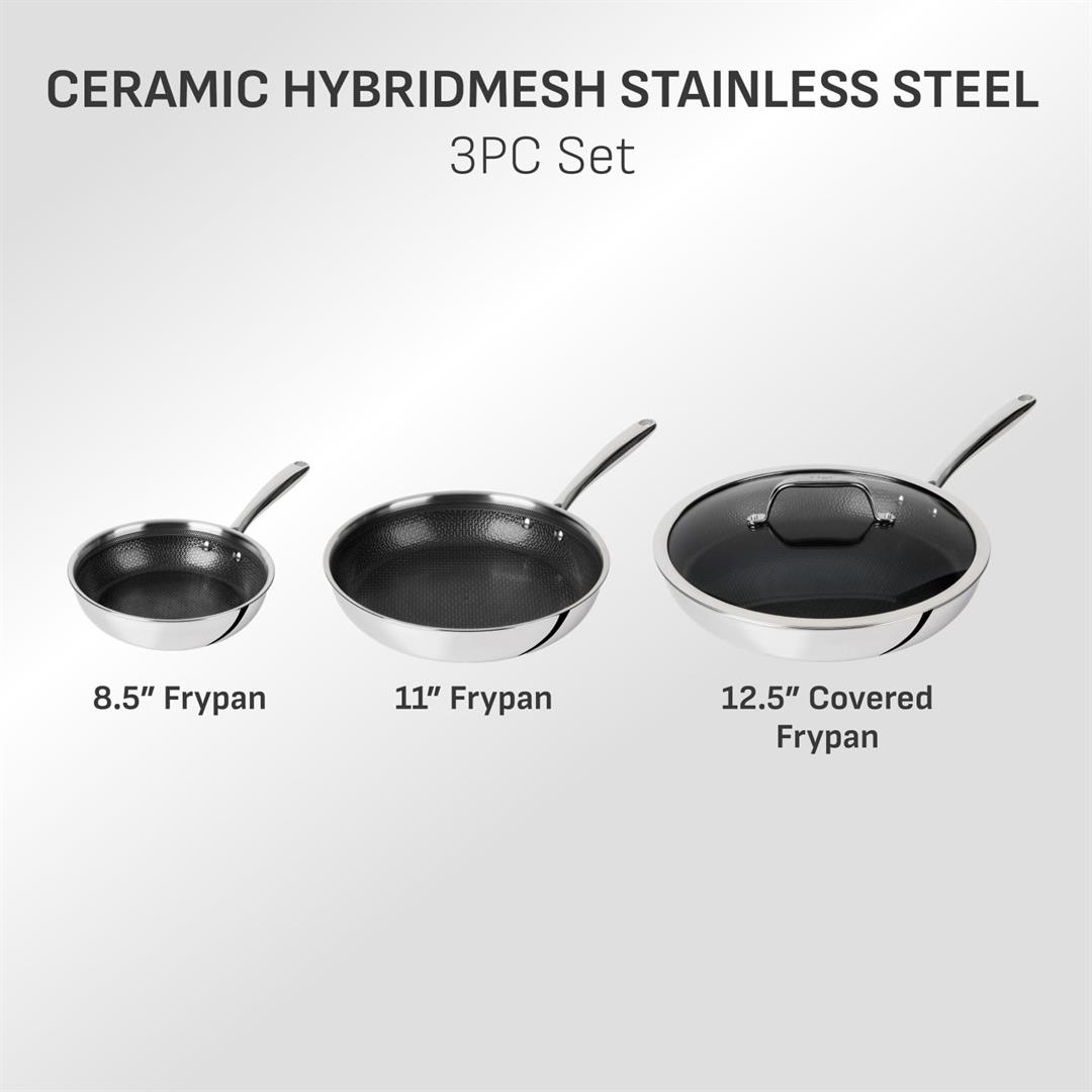 HybridMesh Technology vs Traditional Ceramic Non-Stick: Traditional ceramic non-stick coatings offer a smooth surface to prevent sticking. HybridMesh features an exposed stainless steel pattern for superior searing and cooking with little oil or butter The Perfect Addition to Your Kitchen: Our 3 Piece Frypan set includes 8.5 inch, 11 inch and 12.5 frypans, ideal for browning, searing, and pan-frying foods like vegetables, meats, and fish Sturdy Construction: The tri-ply stainless steel construction ensures even heat distribution, suitable for all cooktops, including induction. The cast riveted handle offers a secure grip, and the metal utensil-safe interior adds long-lasting convenience To prevent sticking: Preheat the pan over medium heat, then add oil or butter and reduce the heat to low, allowing it to warm before adding food. This helps ensure optimal searing and even cooking Ultimate Convenience: Oven safe up to 500F allowing you to prepare a variety of meals. Plus, the cookware is also dishwasher safe for effortless cleaning. Limited lifetime warranty