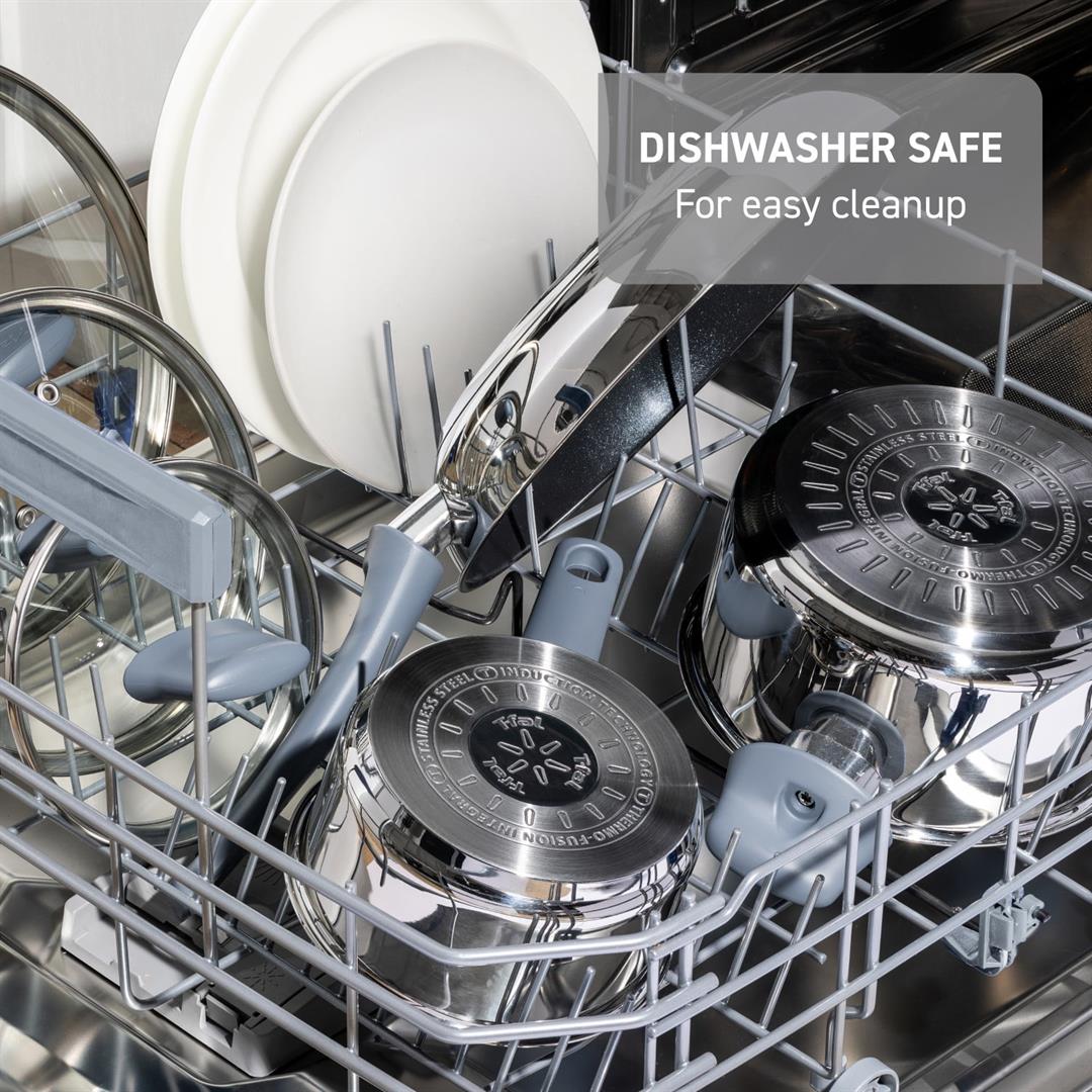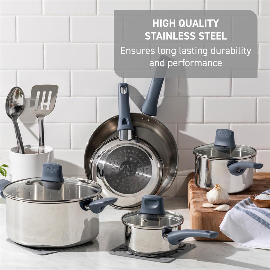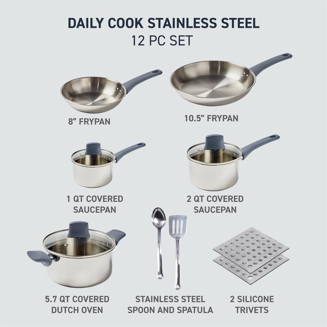 Experience unmatched quality and durability for an incredible value with T-fals Daily Cook Steel 12 piece pots and pans cookware set. Made from high-quality stainless steel to ensure durability and performance. Each piece features a sleek design with polished interior, high-shine mirror exterior, and ergonomic, eye-catching ocean blue handles. This cookware includes easy-to-read measuring marks and glass lids that allow you trap heat and moisture to enhance the flavors while maintaining visibility. The stainless-steel induction base makes this cookware compatible with all cooktops. Oven safe up to 350 F and dishwasher safe. Transform your everyday cooking into a vibrant culinary adventure.