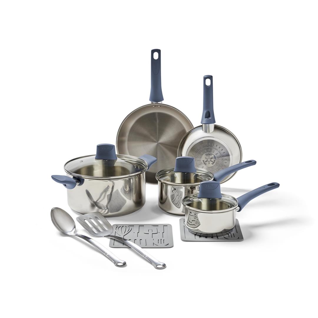 T-fal Daily Cook Stainless Steel, 12 Piece Pots and Pans Cookware Set, Ocean Blue Handles