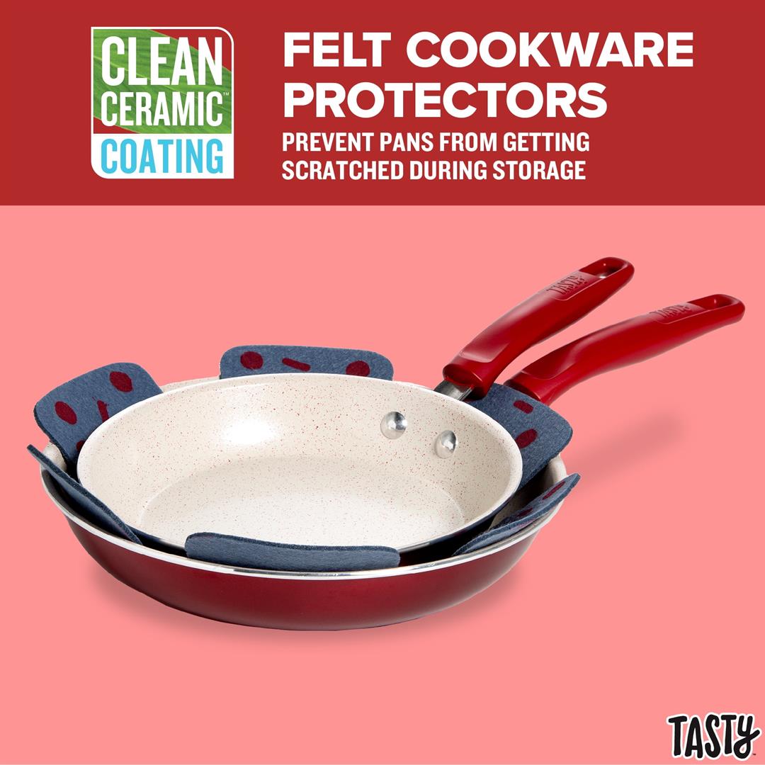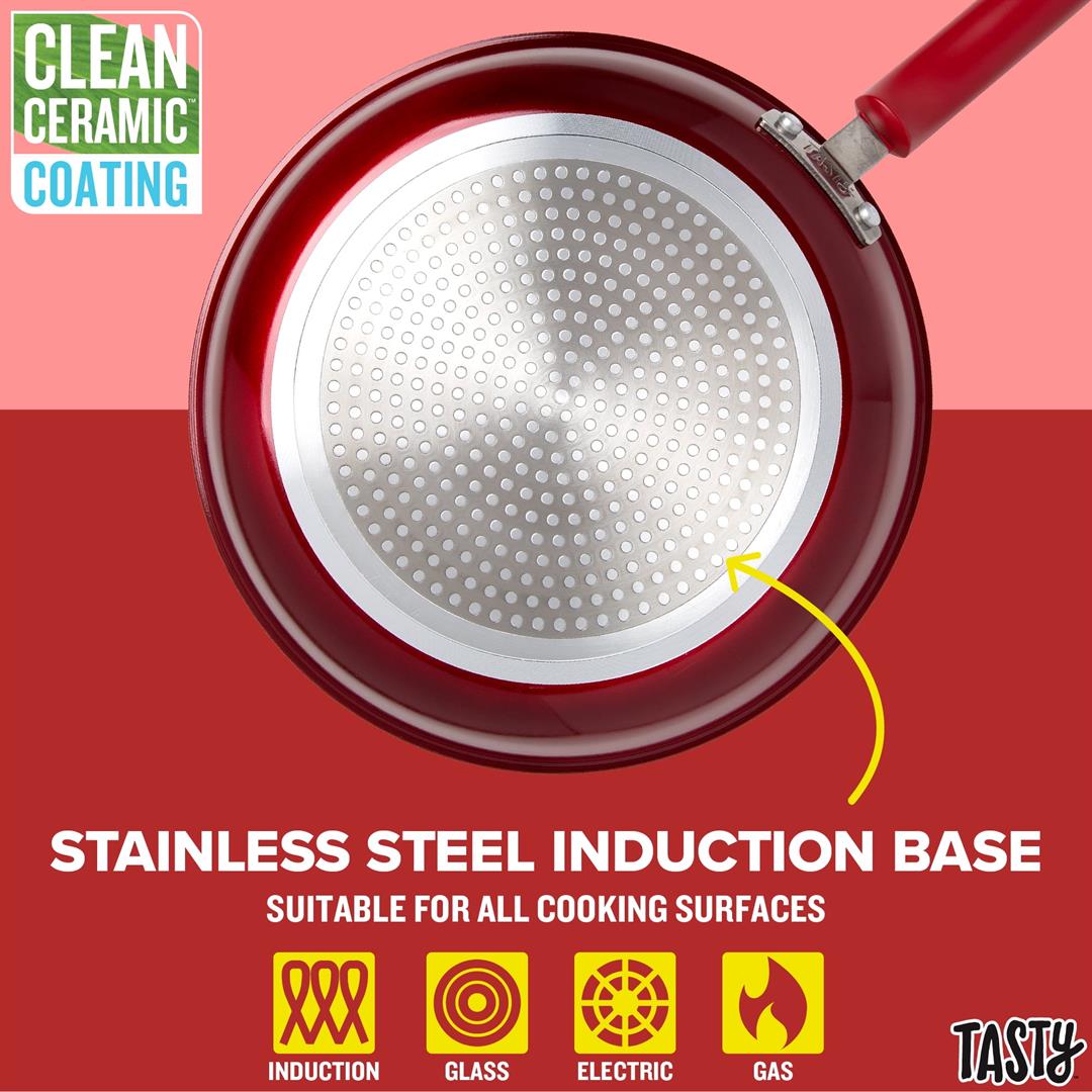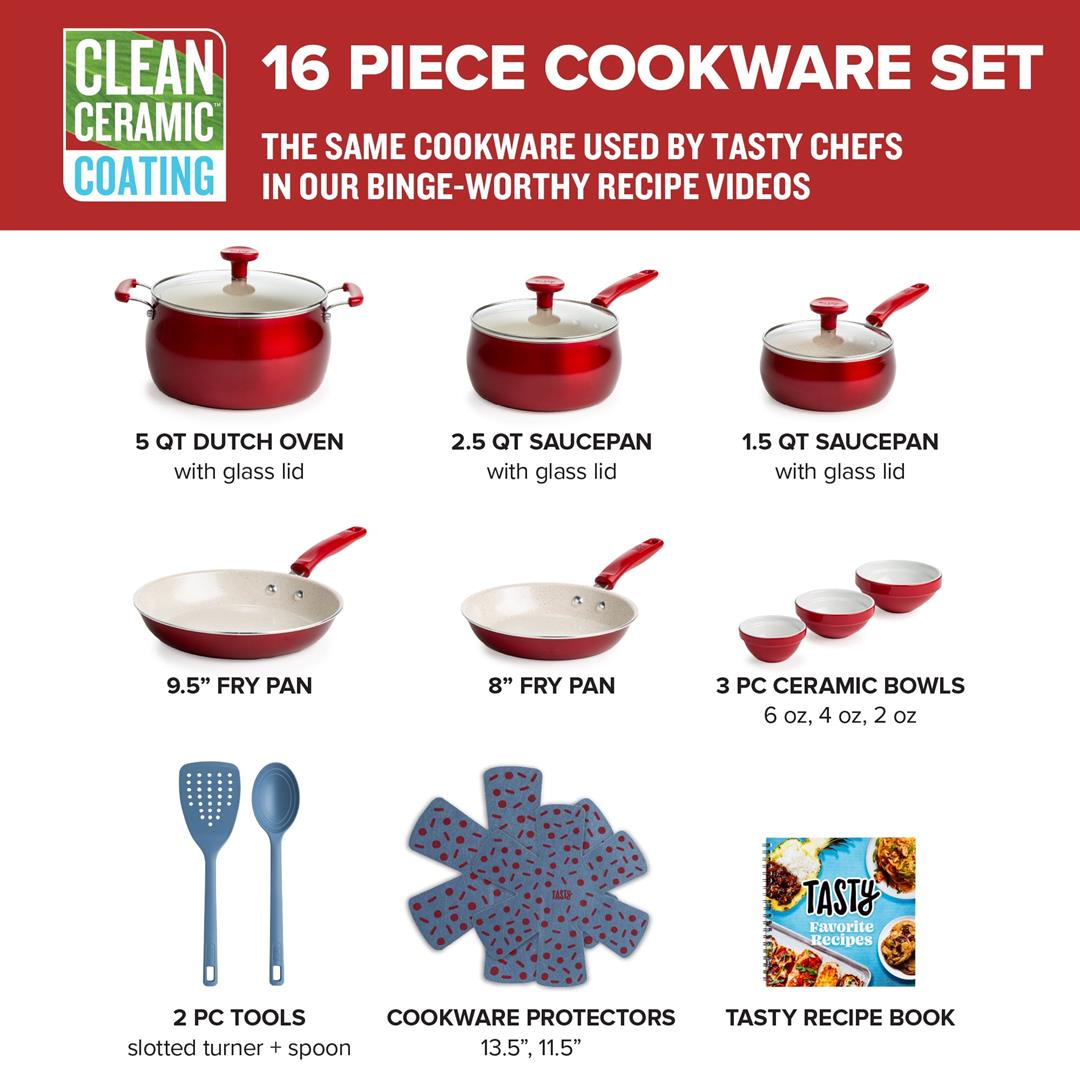 Everything you need for your kitchen in one box! Set your kitchen up for success with this Tasty Clean Ceramic non-stick 16 piece cookware set. The better, stronger, and longer-lasting reinforced Clean Ceramic non-stick coating allows food to easily slide out of the pan. When you’re looking to store these pots and pans, use the included pan protectors to sandwich in between two pieces of cookware to allow for stacking and storing without scratching. The cookware also features a stainless steel induction base, making this cookware suitable for all cooking surfaces, including induction, electric, gas and glass.