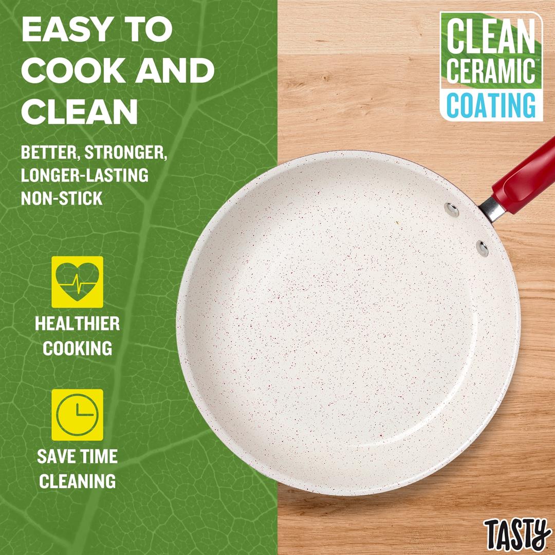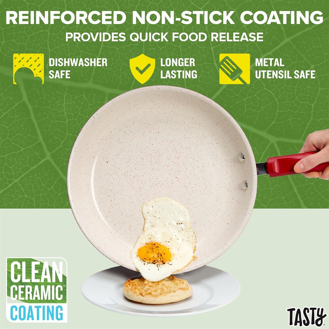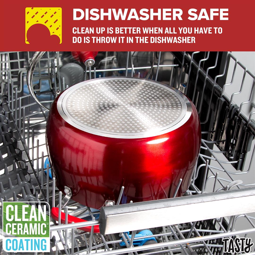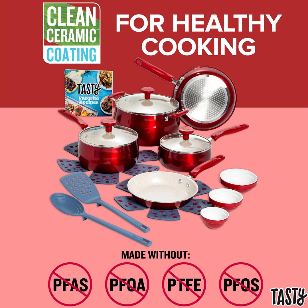 Better, Stronger, Longer-Lasting Non-Stick: This pots and pans set features a premium, reinforced Clean Ceramic non-stick coating that allows food to easily slide out of the pan Metal Utensil Safe: The durable non-stick is metal utensil safe, though we still recommend using silicone, wood or nylon tools when cooking A Pinch of This: Use the included ceramic bowls to pre-measure ingredients and make up sauces in advance to make cooking a breeze- comes in 6-ounce, 4 ounce and 2-ounce sizes Dishwasher Safe for Easy Cleaning: These pans are as easy to clean as they are to use and are dishwasher safe for fast and easy clean-up The Right Tools for the Job: The turner and spoon are heat resistant and safe to use on non-stick surfaces Awesome Quality: This cookware’s heavy duty construction heats quickly and evenly Stack and Protect: Included cookware protectors (11.5 inch and 13.5 inch) are perfect for stacking and storing cookware without worrying about scratches Suitable for All Cooking Surfaces: Use this cookware on induction, electric, gas and glass! Pots and pans feature a stainless-steel induction base Includes: 8-inch fry pan, 9.5-inch fry pan, 1.5-quart saucepan with glass lid, 2.5-quart saucepan with glass lid, 5-quart dutch oven with glass lid, 2-piece cookware protectors (11.5 inch and 13.5 inch), solid spoon, slotted turner, 3-piece ceramic prep bowls (6-ounce, 4 ounce and 2 ounce)