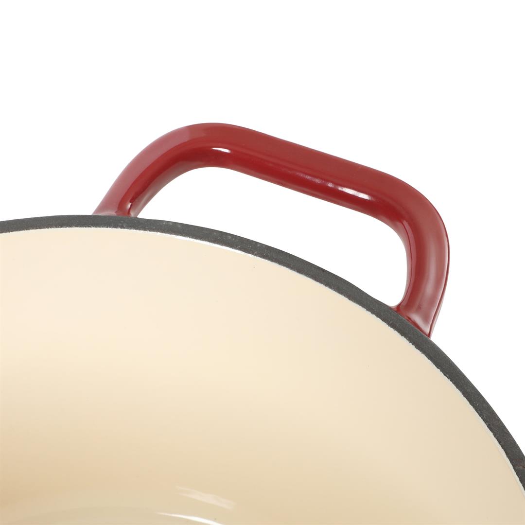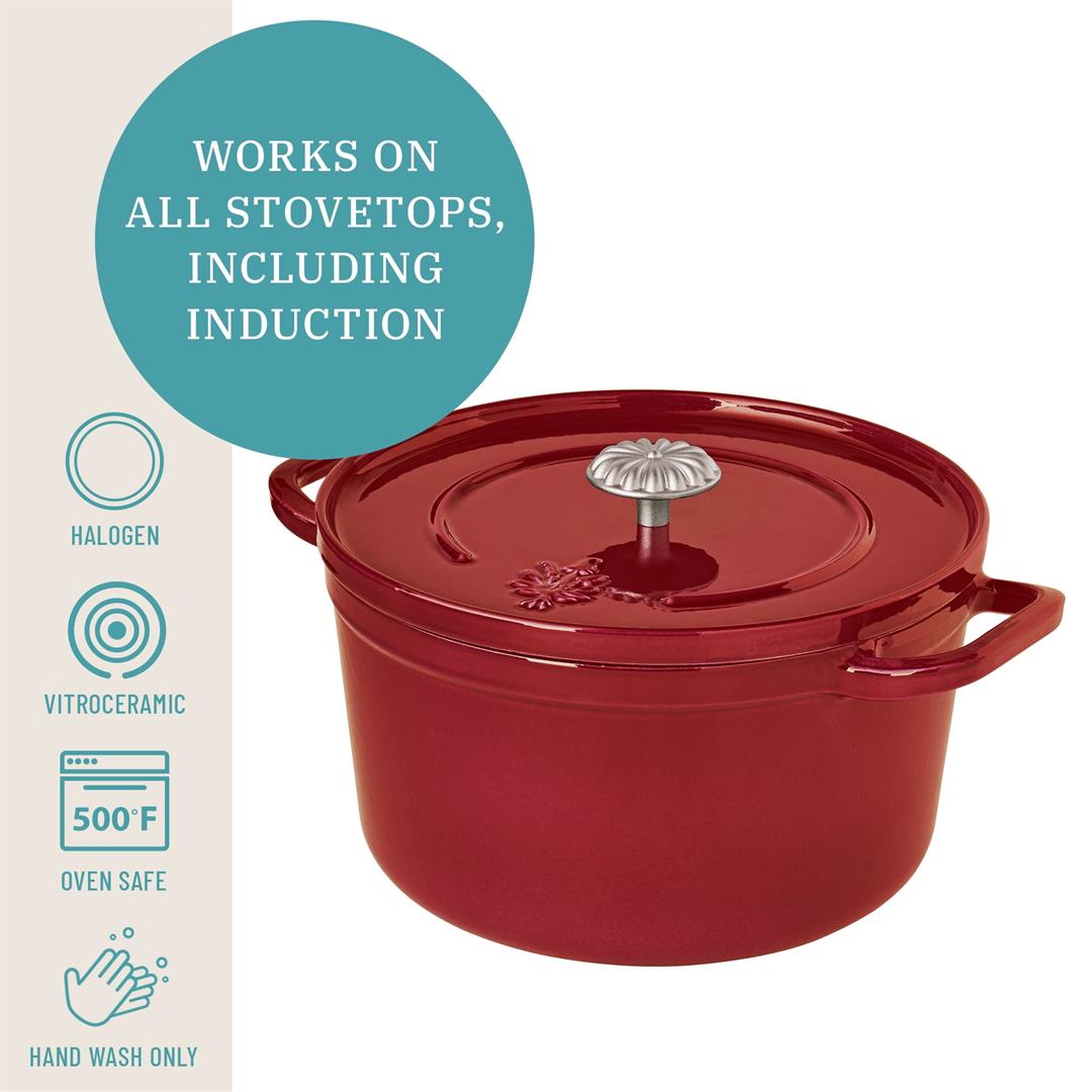 5-quart capacity ideal for slow-cooking, braising, baking, and more Made from durable cast iron with a vibrant red enamel finish Oven safe up to 500F for versatile cooking options Includes an extra interchangeable bakelite knob Great for stews, soups, casseroles, roasts, and side dishes Brings rustic elegance to your kitchen or table Mix and match with other pieces from The Pioneer Woman collection Hand wash only