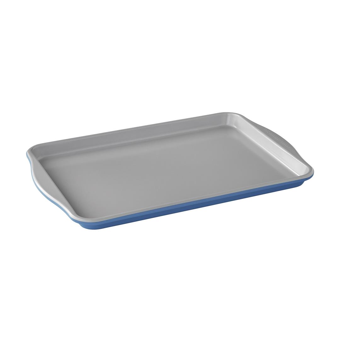 34-piece ceramic nonstick cookware and bakeware set in blue Includes saucepan, Dutch oven, saut pan, fry pan, griddle, ceramic baker, bakeware, knives, utensils, and more Nonstick ceramic coating allows healthier cooking and easy food release Silicone handles are oven safe up to 400F; glass lids up to 350F Tempered glass strainer lids make draining food simple Dual pour spouts on saucepan and Dutch oven for dripless pouring Works on electric, gas, vitroceramic, and halogen stovetops Hand wash recommended for cookware and wood items; most accessories are dishwasher safe
