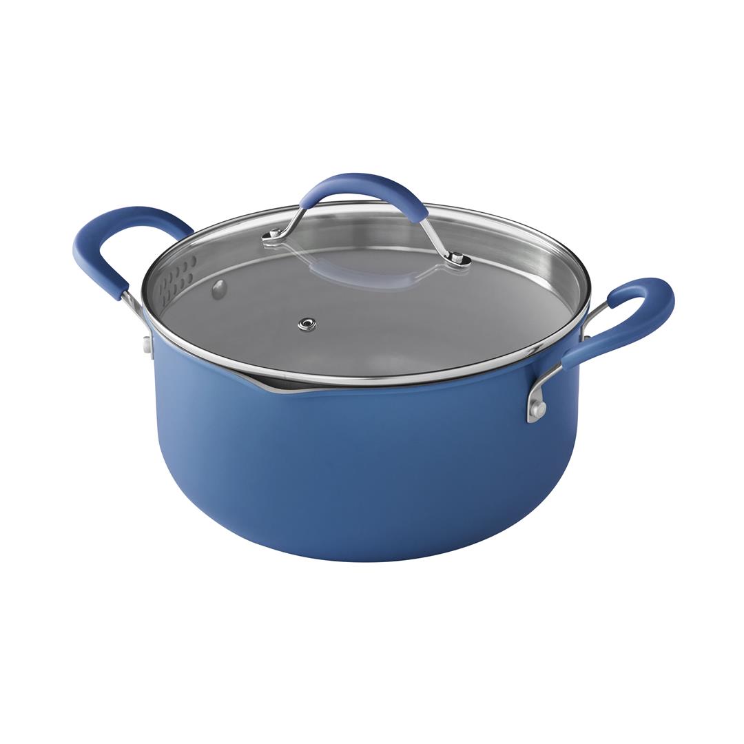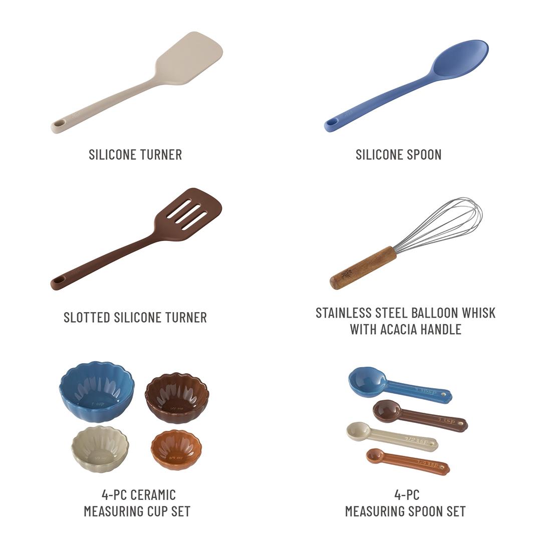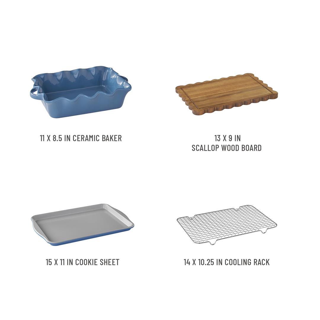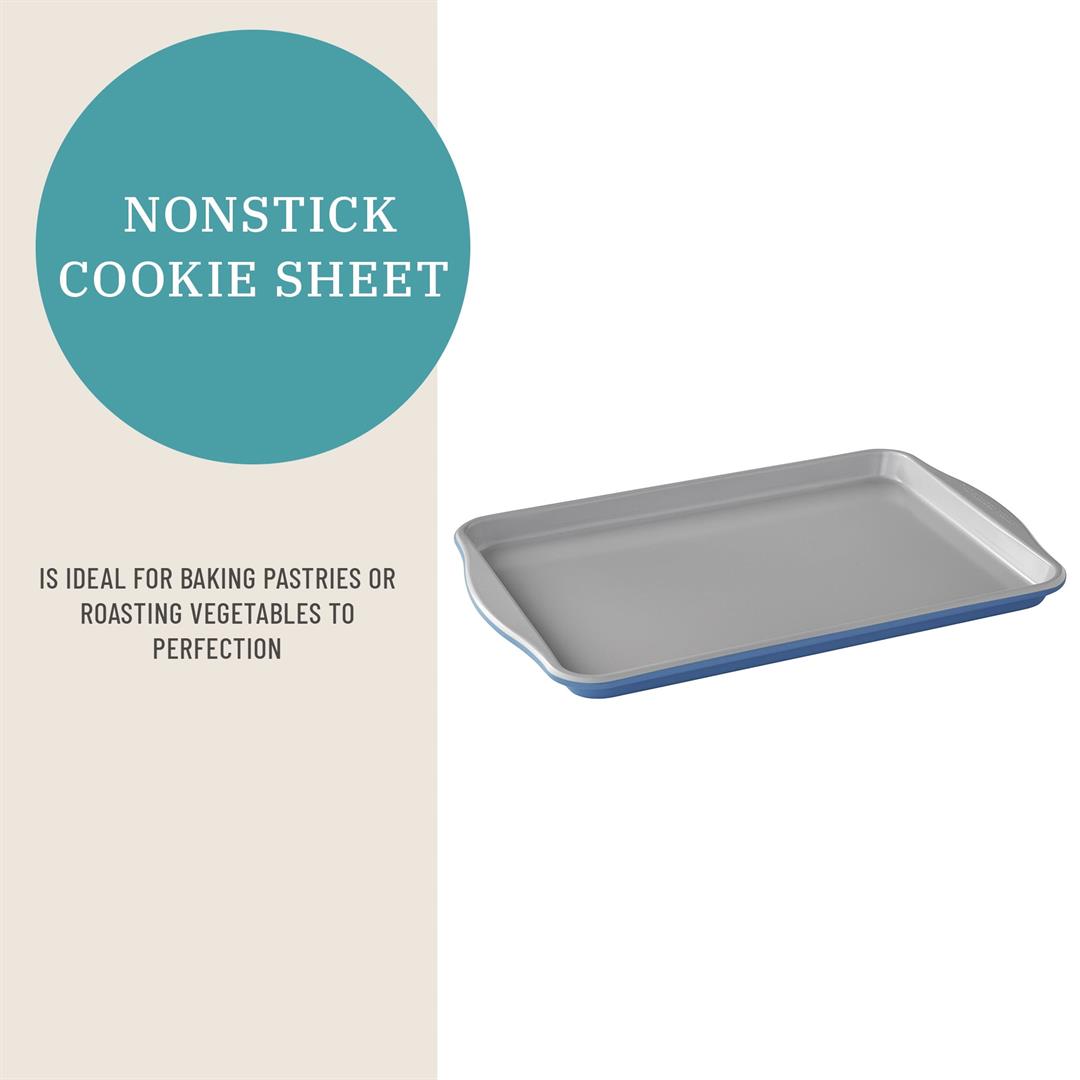 34-piece ceramic nonstick cookware and bakeware set in blue Includes saucepan, Dutch oven, saut pan, fry pan, griddle, ceramic baker, bakeware, knives, utensils, and more Nonstick ceramic coating allows healthier cooking and easy food release Silicone handles are oven safe up to 400F; glass lids up to 350F Tempered glass strainer lids make draining food simple Dual pour spouts on saucepan and Dutch oven for dripless pouring Works on electric, gas, vitroceramic, and halogen stovetops Hand wash recommended for cookware and wood items; most accessories are dishwasher safe