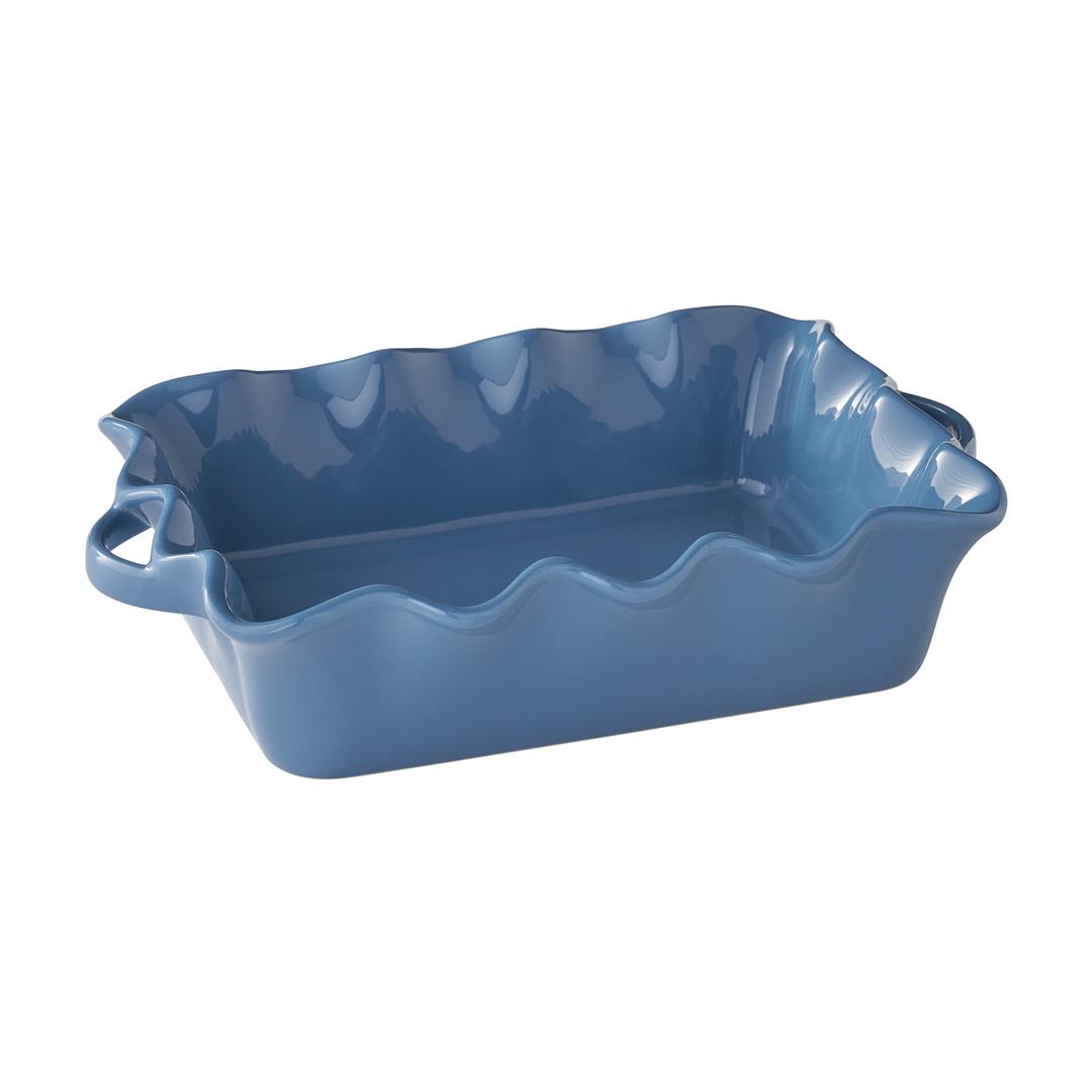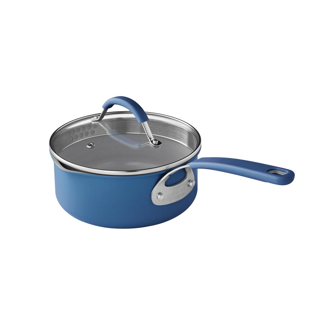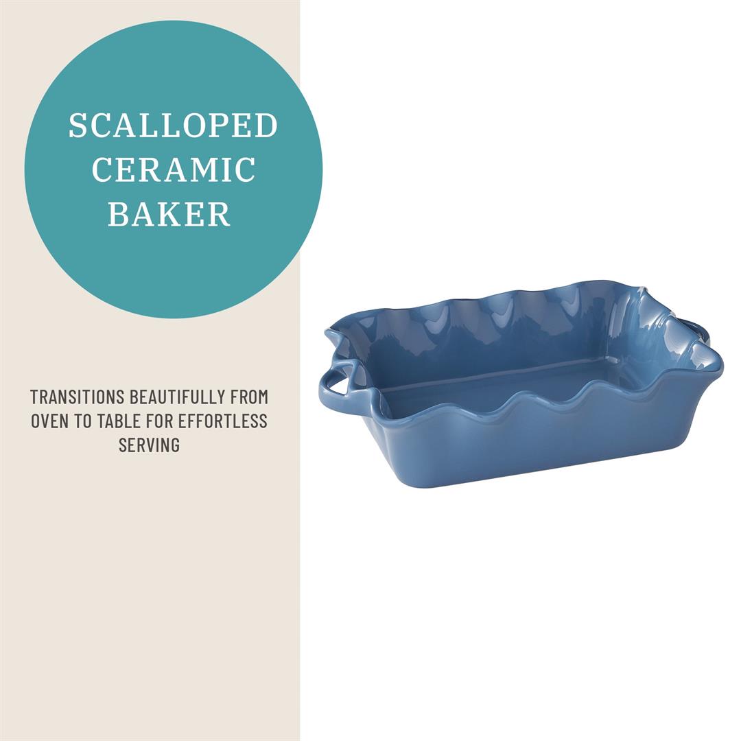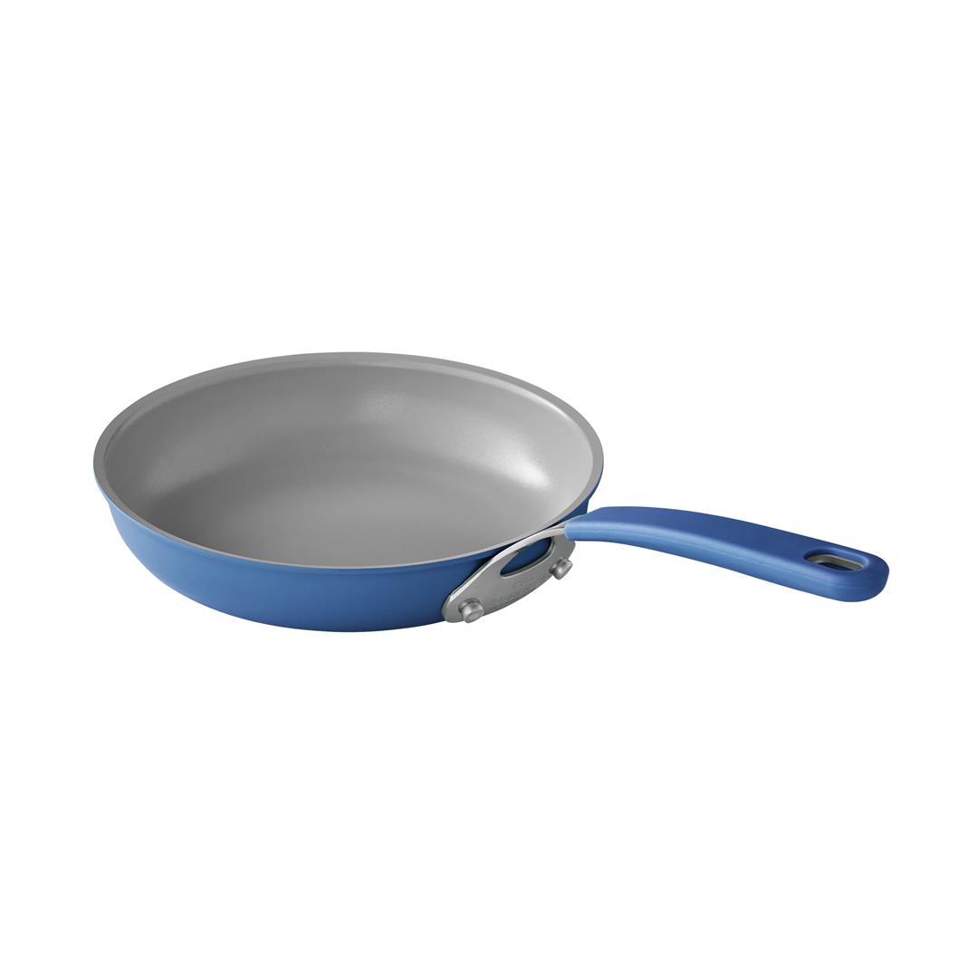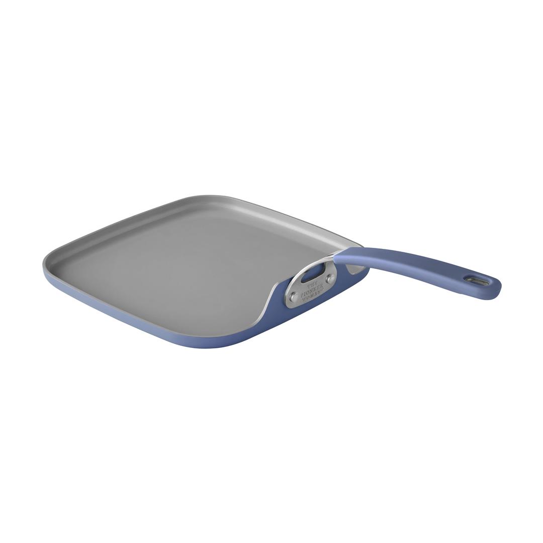 34-piece ceramic nonstick cookware and bakeware set in blue Includes saucepan, Dutch oven, saut pan, fry pan, griddle, ceramic baker, bakeware, knives, utensils, and more Nonstick ceramic coating allows healthier cooking and easy food release Silicone handles are oven safe up to 400F; glass lids up to 350F Tempered glass strainer lids make draining food simple Dual pour spouts on saucepan and Dutch oven for dripless pouring Works on electric, gas, vitroceramic, and halogen stovetops Hand wash recommended for cookware and wood items; most accessories are dishwasher safe