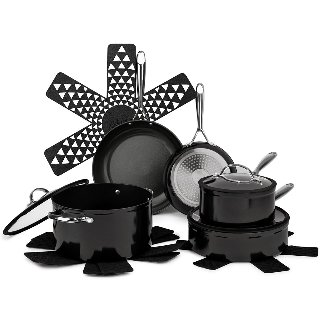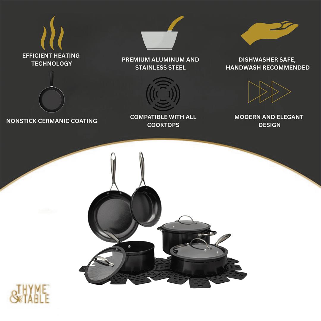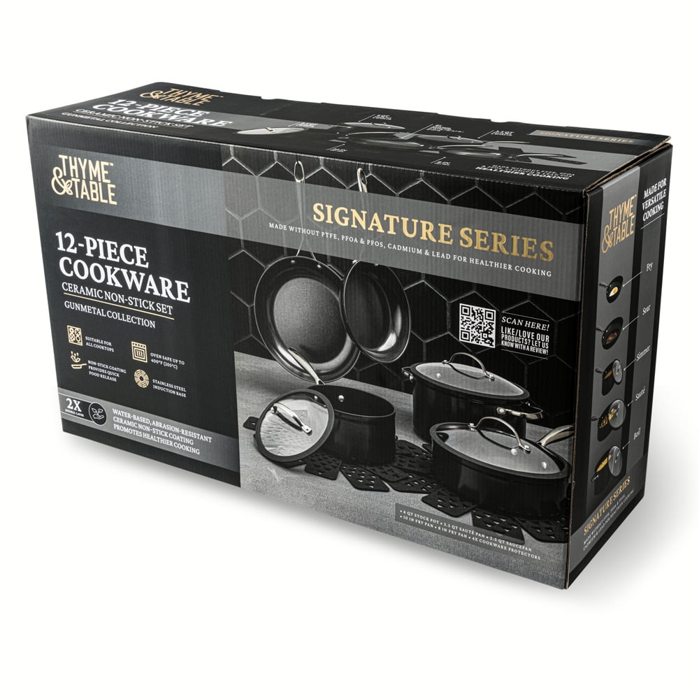 Meet your new Signature kitchen tool, Thyme & Table 12-Piece Ceramic Non-Stick Signature Cookware Set, elegantly designed in black with gunmetal handles. This set is the perfect blend of style and functionality, ensuring a top-notch cooking experience with every use. This set includes a generous 6-quart stock pot, a 2.5-quart saucepan, a 2-quart saut pan, a 10-inch fry pan, and an 8-inch fry pan, equipping you for any culinary challenge. Additionally, it comes with 4 cookware protectors to keep your investment in pristine condition for years to come. Ultimate Engineering: Each piece is crafted to perfection using heavy gauged aluminum, ensuring exceptional results with every dish. Because of its stainless-steel induction base our cookware is engineered for all cooktops, including gas, electric or induction, and oven safe up to 400 Fahrenheit. Healthier Cooking and Non-Stick: The ultimate feature is its non-stick coating, allowing for quick cleanup, and helps to promote healthier cooking with effortless cleanup. Optimal Handling: Designed for ease and precision, our cookware features ergonomic riveted handles that provide superior grip and balance, ensuring safe and effortless maneuvering in the kitchen. Revolutionize your Kitchen: Capable of handling everything from frying and searing to simmering, braising, and boiling, this comprehensive set is designed to revolutionize your cooking experience. Offering versatility and durability in one stylish package, it elevates your kitchen setup. Enhance your culinary creativity with confidence using the Thyme & Table 12-Piece Ceramic Non-Stick Signature Cookware Set, Black and Gunmetal. Use and Care Dishwasher Safe, Handwash Recommended