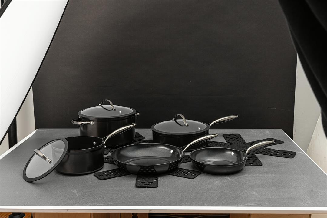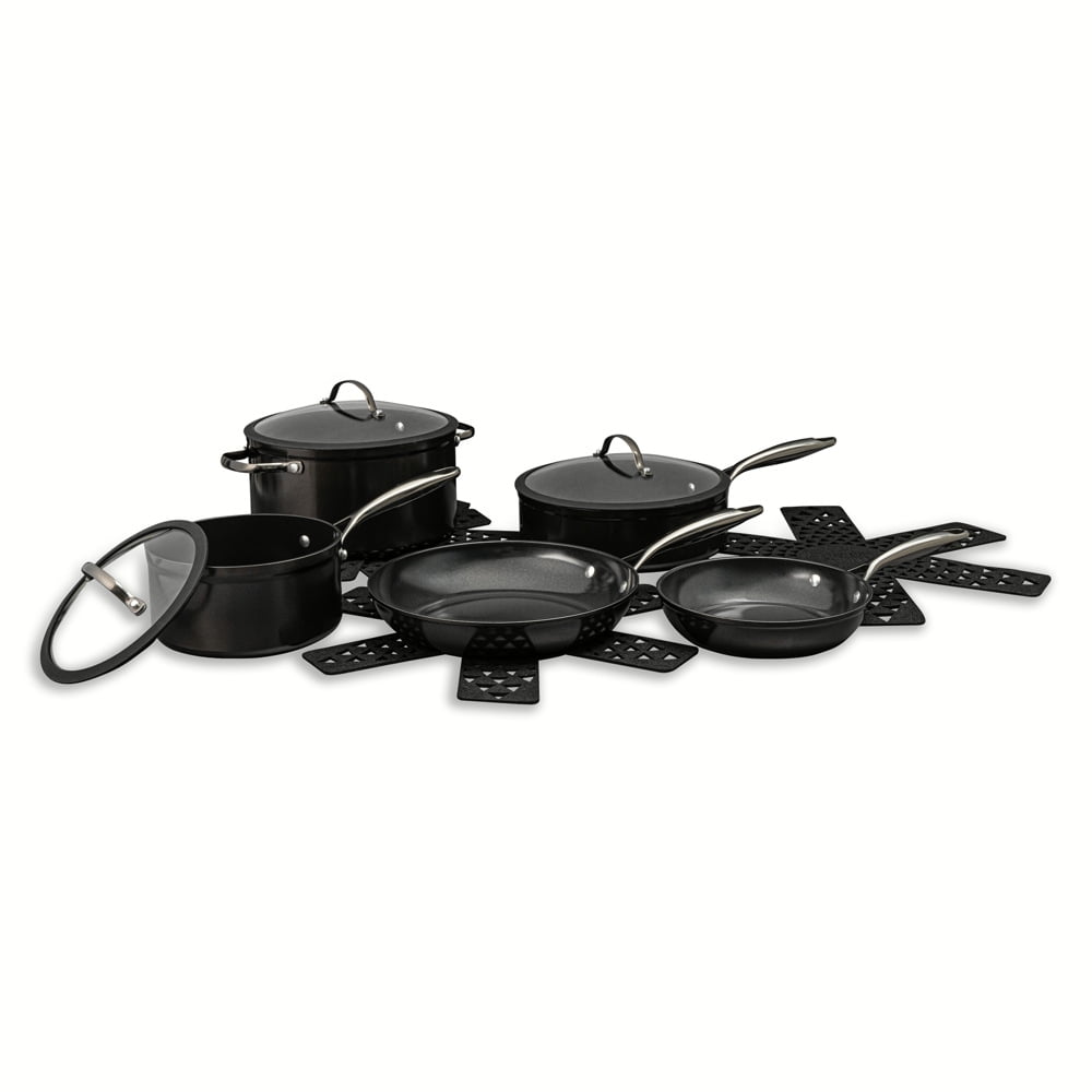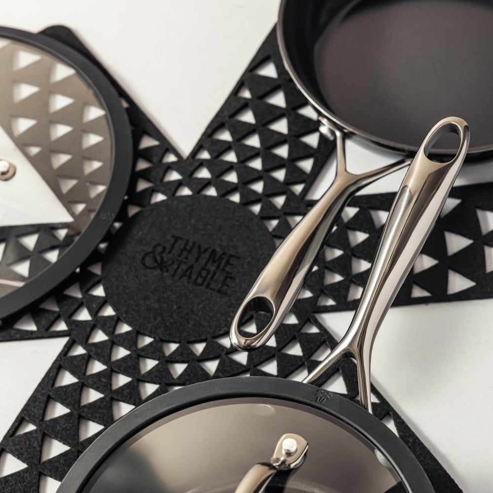 Thyme and Table 12 Piece Nonstick Aluminum Cookware Set, Gunmetal Suitable for all cooktops Handwash recommended Stainless steel induction base for enhanced durability Water-based, abrasion-resistant ceramic non-stick coating for healthier cooking Sleek gunmetal finish adds a touch of sophistication to your kitchen