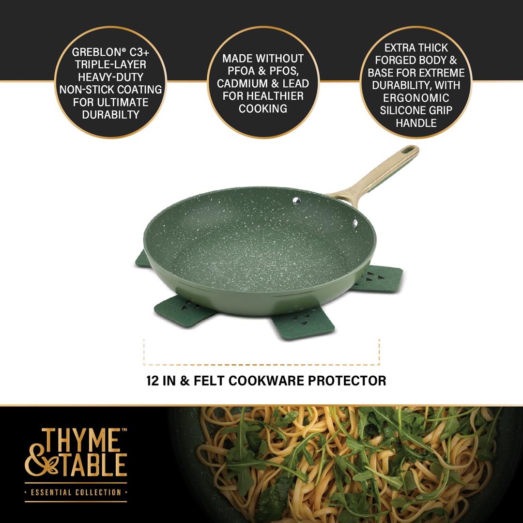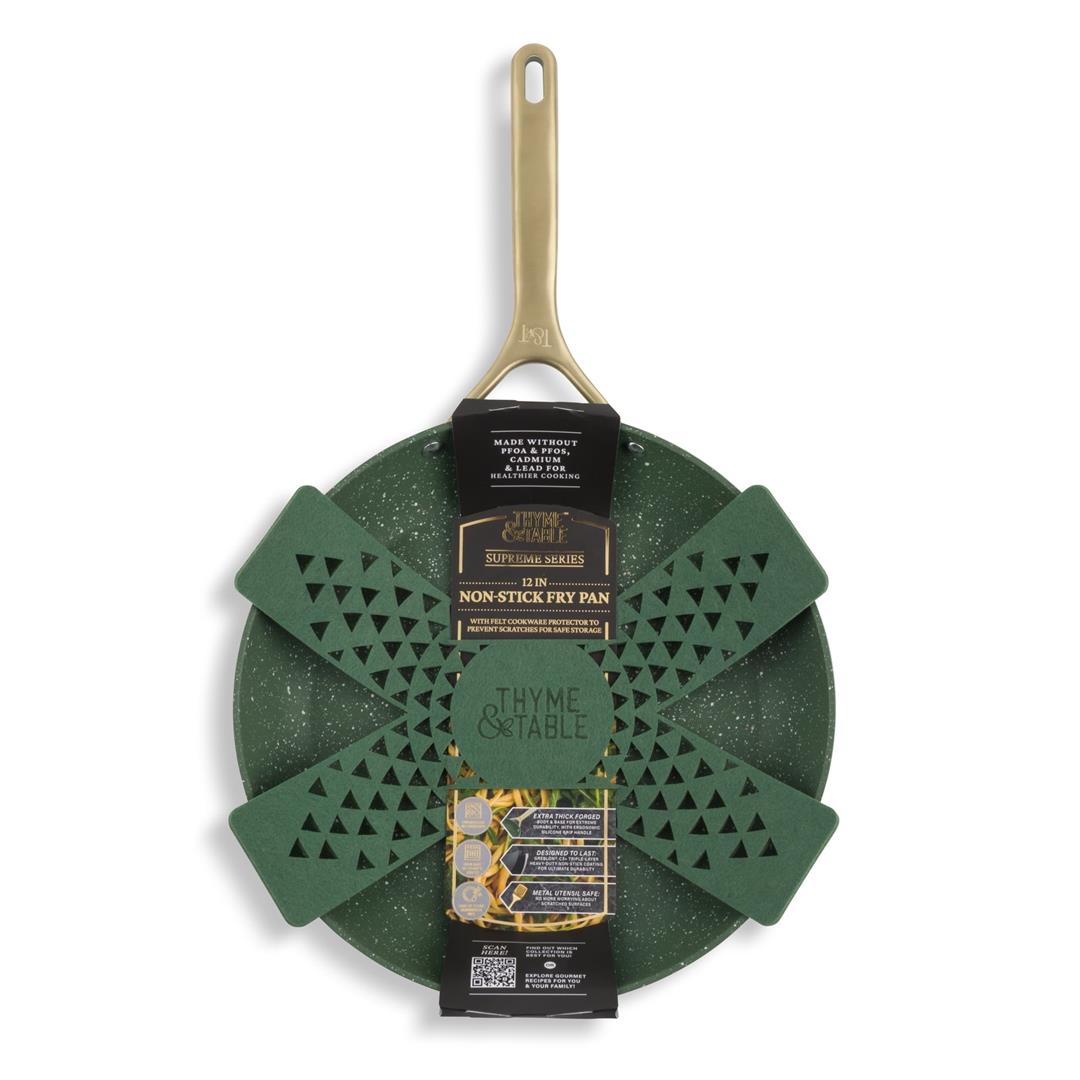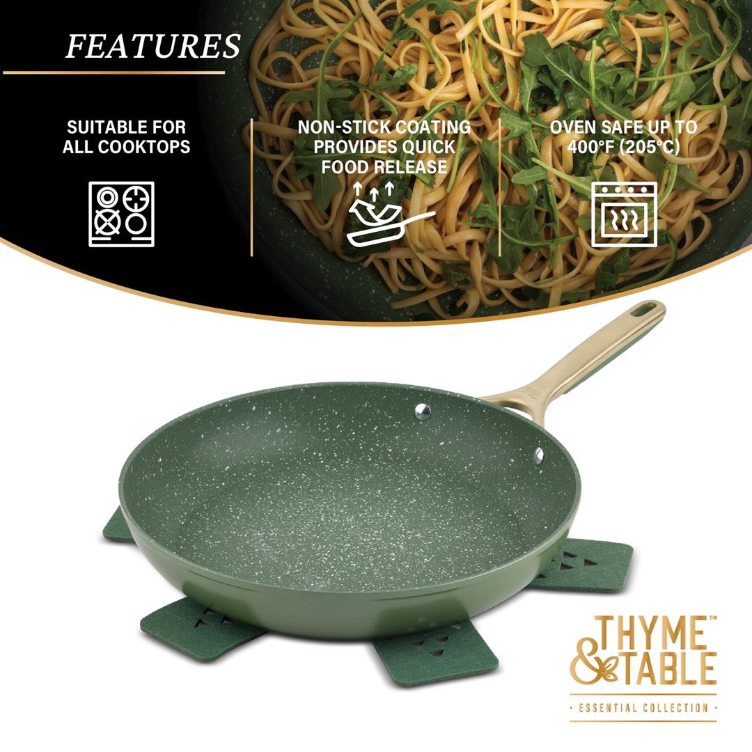 About the Thyme and Table 12 Supreme Fry Pan, Olive, this premier pan has an 12 extra-large diameter giving you the ability to cook anything. With its olive and gold handles, this fry pan adds a pop of color to your kitchen, transforming mundane meal prep into a culinary adventure. Its ability to endure rigorous daily cooking tasks ensures that it will last for years to come while elevating your kitchen.