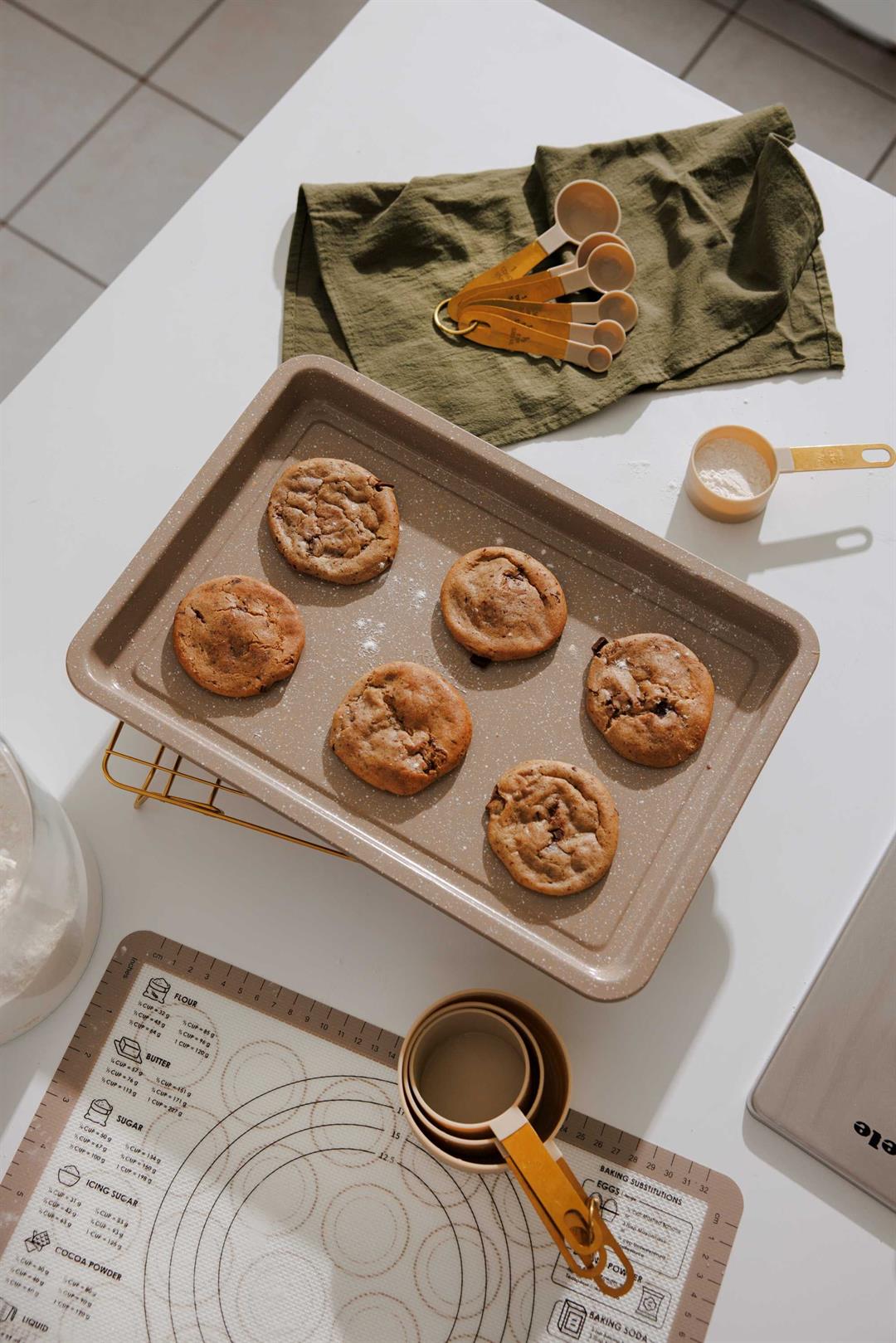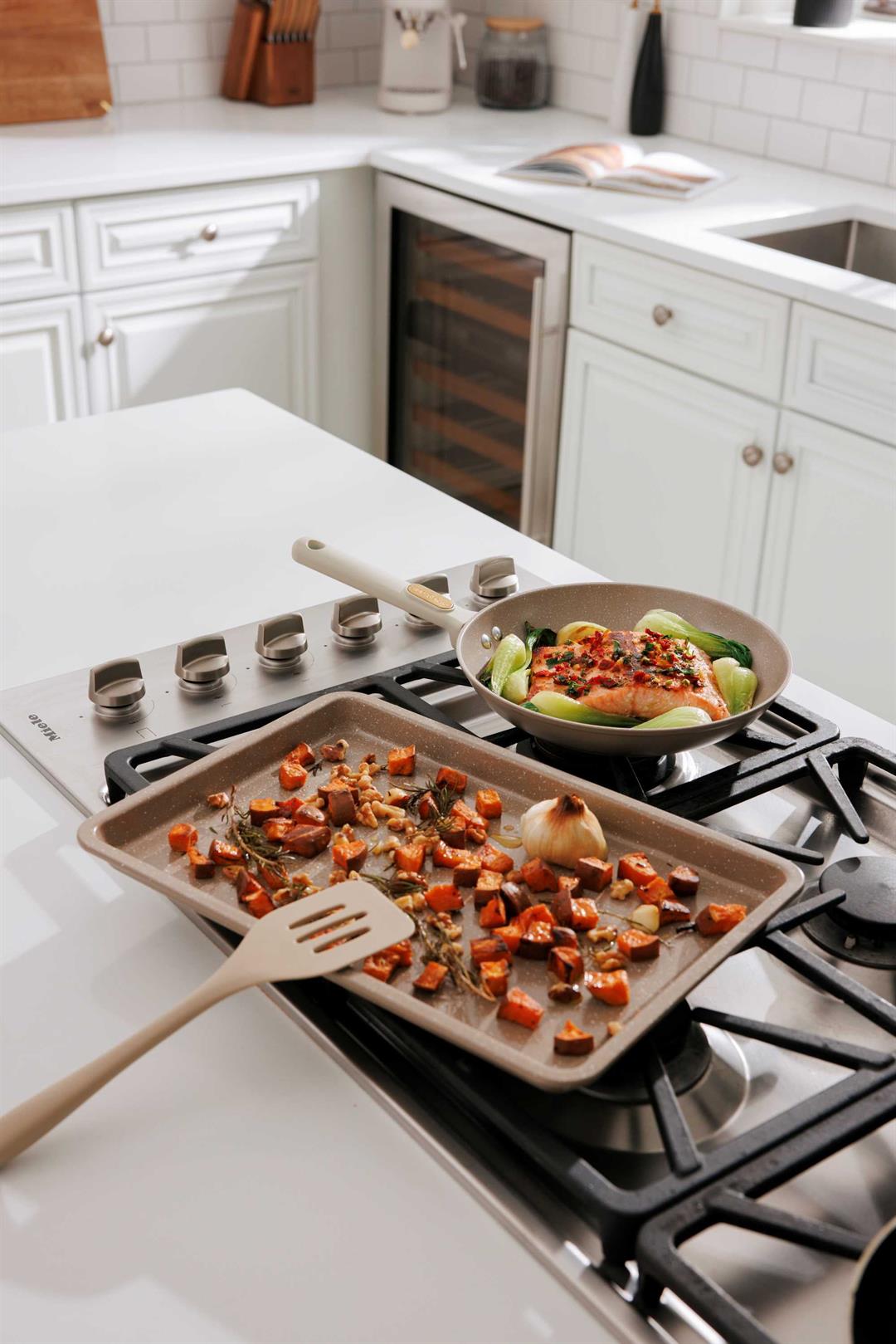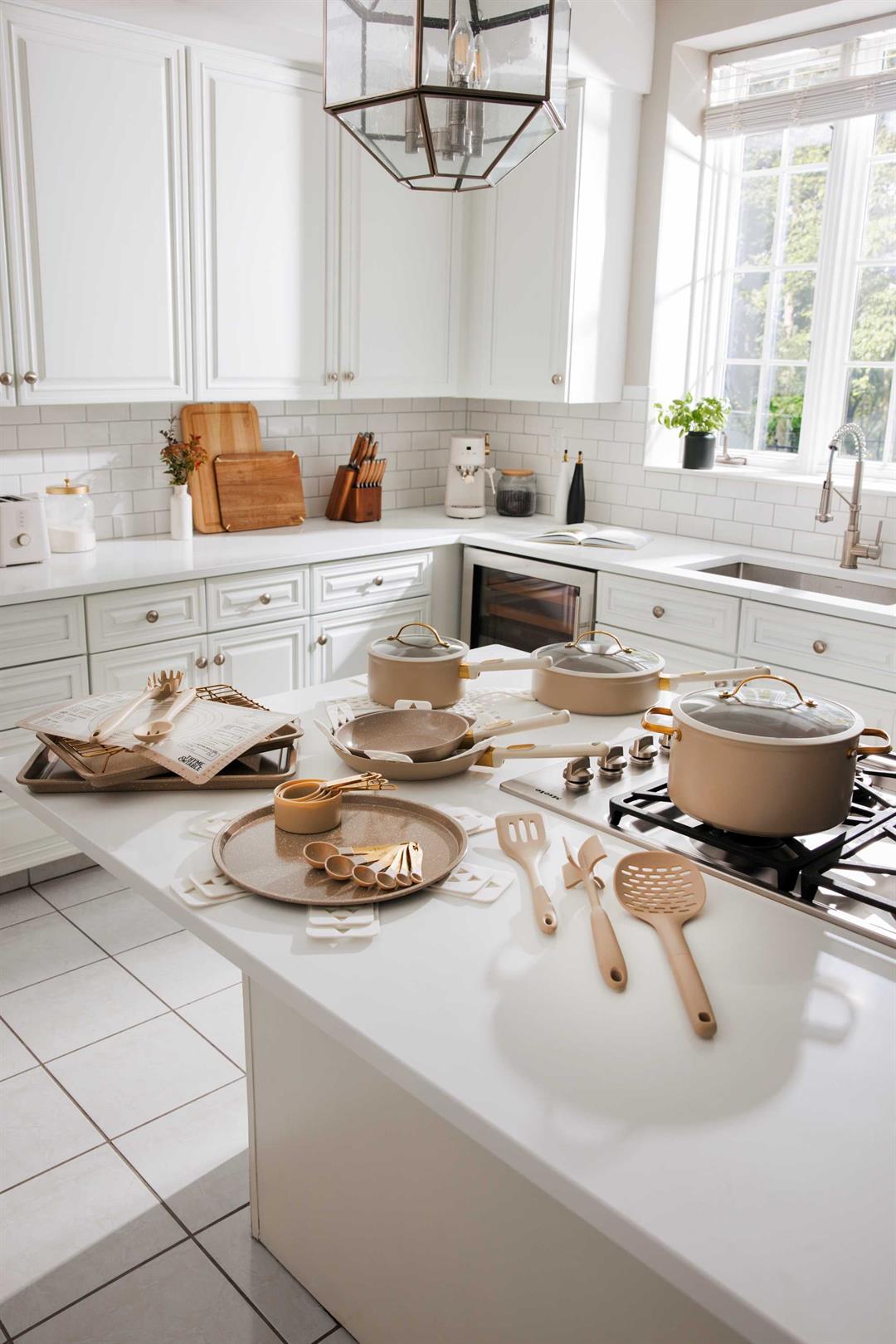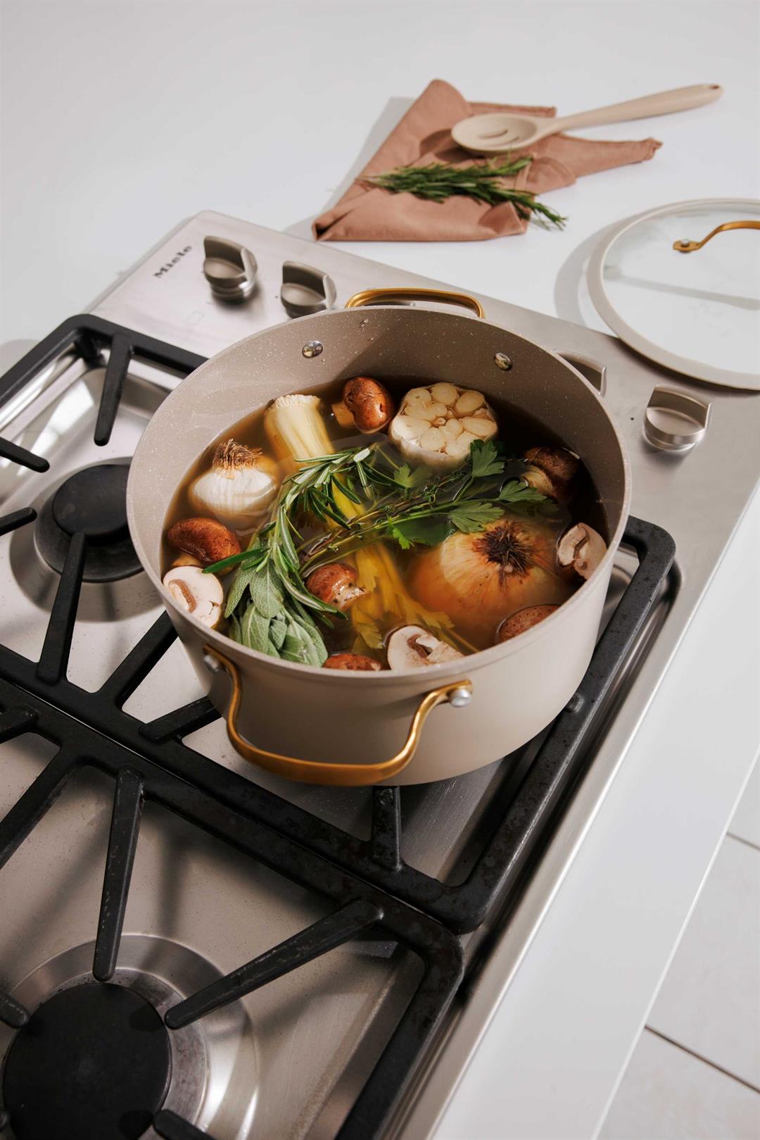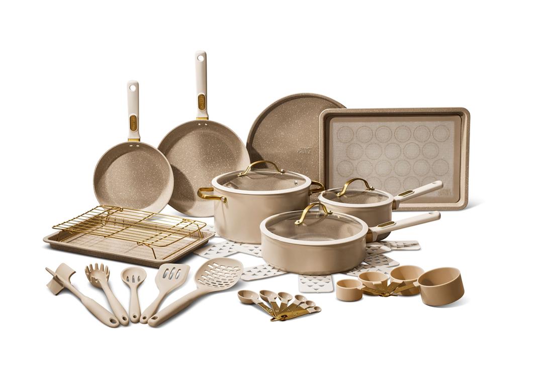 Nonstick Ceramic Coating Effortlessly cook and clean with toxin-free nonstick surfaces, ideal for healthy meals with less oil. Even Heat Distribution Durable aluminum construction ensures consistent cooking on all stovetops. Ergonomic Handles Soft-touch handles with gold hardware provide a comfortable, secure grip and chic style. Oven Safe & Dishwasher Friendly Bake with ease and clean up quickly (check individual item limits). Space-Saving Design Nestable pans and included protectors help keep your cabinets organized and scratch-free.