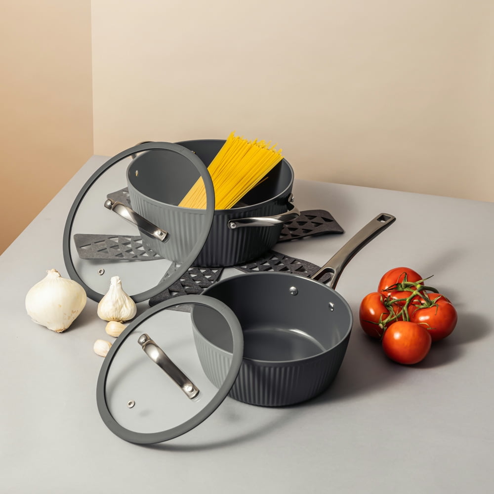 Meet your new Signature kitchen tool, Thyme & Table 12-Piece Ceramic Non-Stick Ribbed Cookware Set, elegantly designed in sleek grey. This set is the perfect blend of style and functionality, ensuring a top-notch cooking experience with every use. This set includes a generous 5.5-quart stock pot, a 2.5-quart saucepan, a 2-quart saut pan, a 10-inch fry pan, and an 8-inch fry pan, equipping you for any culinary challenge. Additionally, it comes with 4 cookware protectors to keep your investment in pristine condition for years to come.