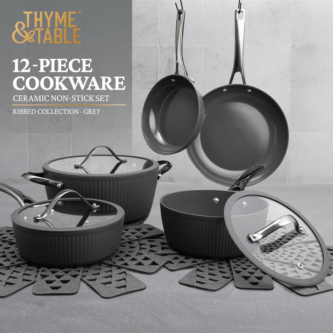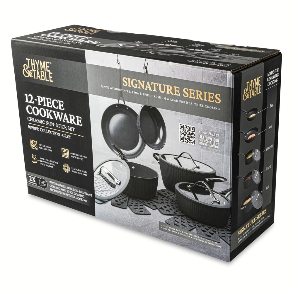 Ultimate Engineering: Each piece is crafted to perfection using heavy gauged aluminum, ensuring exceptional results with every dish. Because of its stainless-steel induction base our cookware is engineered for all cooktops, including gas, electric or induction, and oven safe up to 446 Fahrenheit. Healthier Cooking and Non-Stick: The ultimate feature is its water-based, abrasion-resistant ceramic non-stick coating, promoting healthier cooking and effortless cleanup. Ultimate Handling: Designed for ease and precision, our cookware features ergonomic riveted handles that provide superior grip and balance, ensuring safe and effortless maneuvering in the kitchen. Revolutionize your Kitchen: Capable of handling everything from frying and searing to simmering, braising, and boiling, this comprehensive set is designed to revolutionize your cooking experience. Offering versatility and durability in one stylish package, it elevates your kitchen setup. Enhance your culinary creativity with confidence using the Thyme & Table 12-Piece Ceramic Non-Stick Ribbed Cookware Set. Cleaning Care: Dishwasher Safe