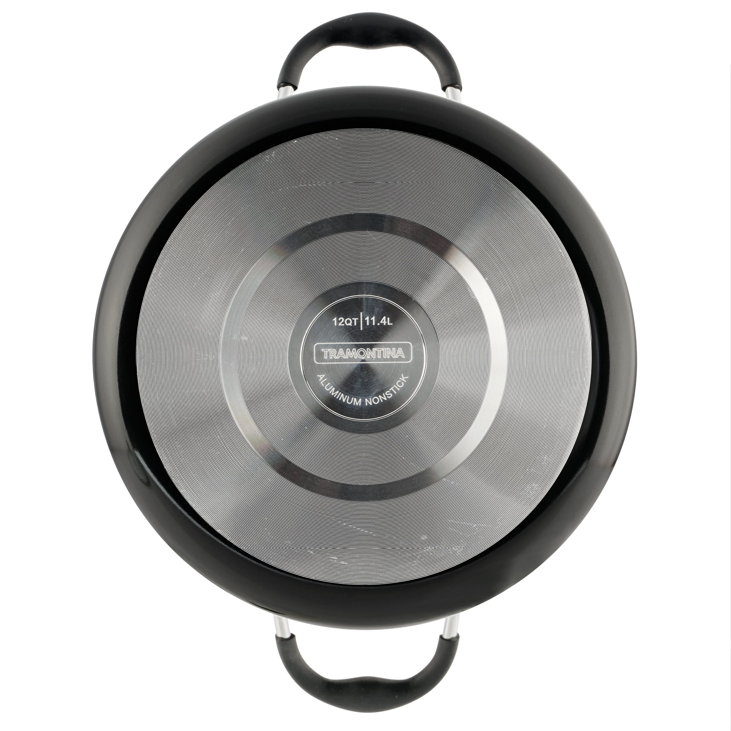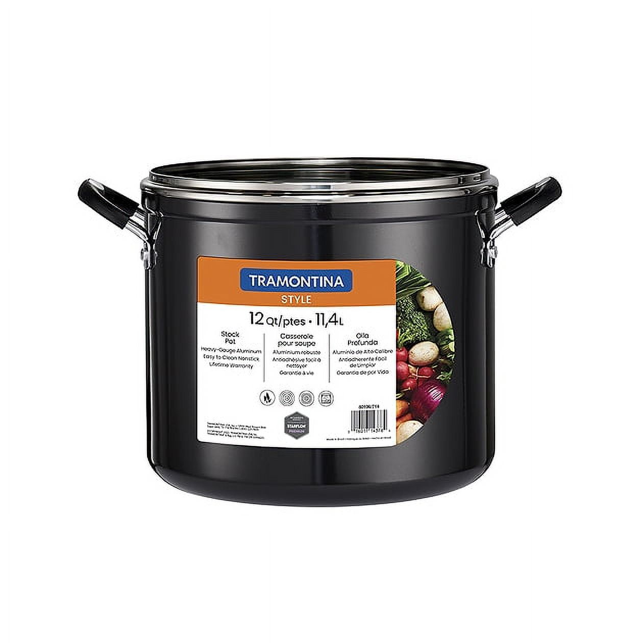 Tramontina’s Porcelain Enamel Aluminum 12 Quart Nonstick Covered Stock Pot is ideal for cooking pasta, preparing soup, boiling veggies or simmering chili. Cooks will be pleased by its heavy-gauge aluminum construction, quick heat distribution, and durable porcelain enamel exterior that is resistant to chips and scratches. Its high-performance nonstick interior provides effortless cooking and easy cleanup. The heat- and shatter-resistant tempered glass lid allows you to monitor your cooking progress, while the ergonomically designed handles provide added support when handling a filled pot. This dishwasher-safe cookware is compatible with gas, electric and ceramic glass cooktops, is oven-safe up to 350 F / 176 C, and offered under a Lifetime Warranty.