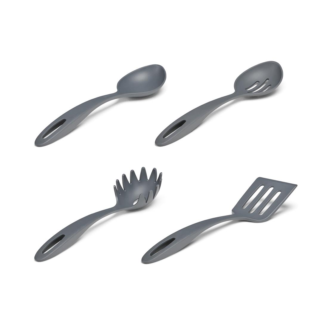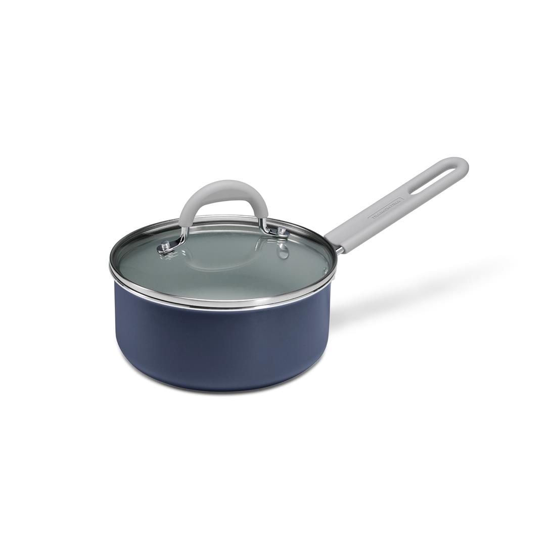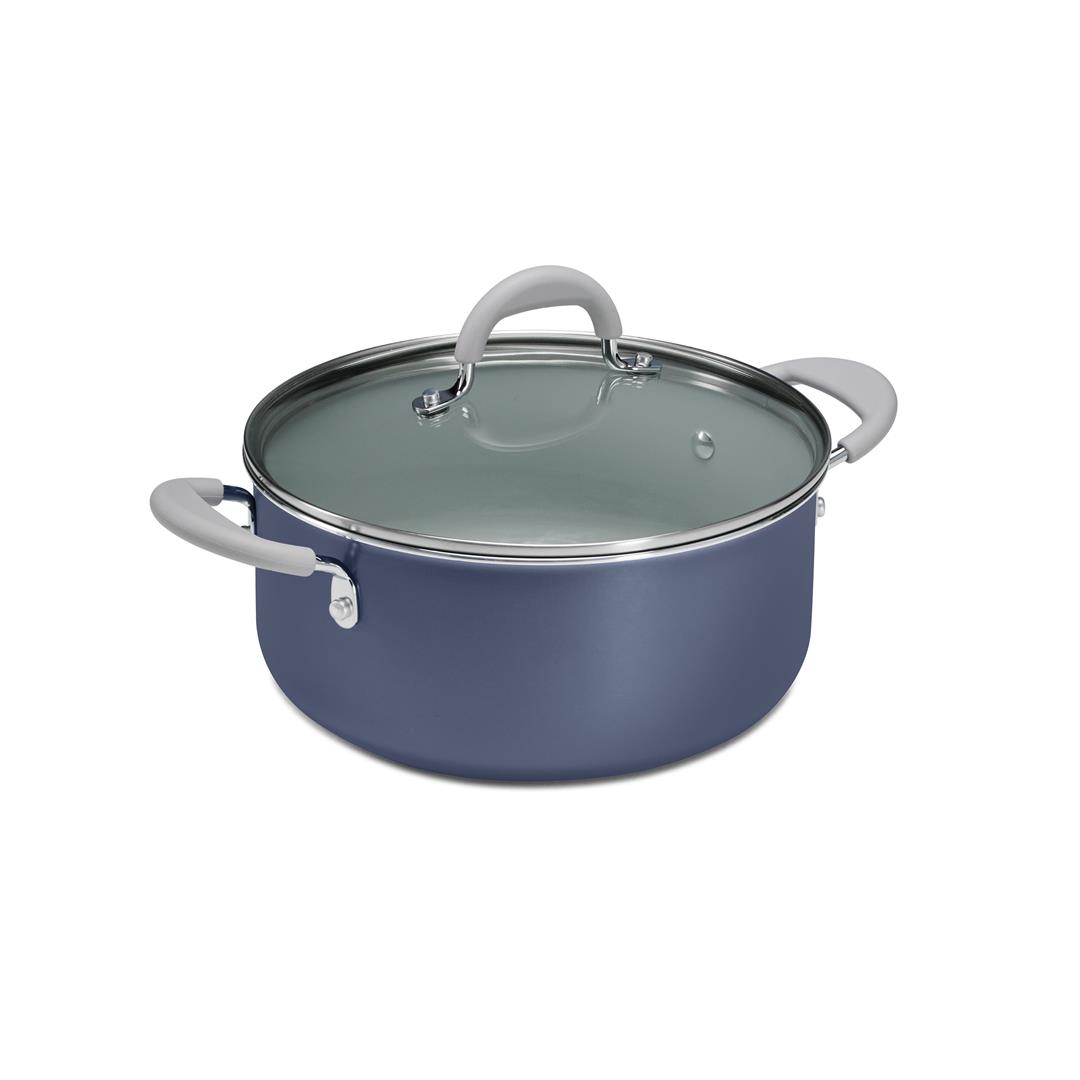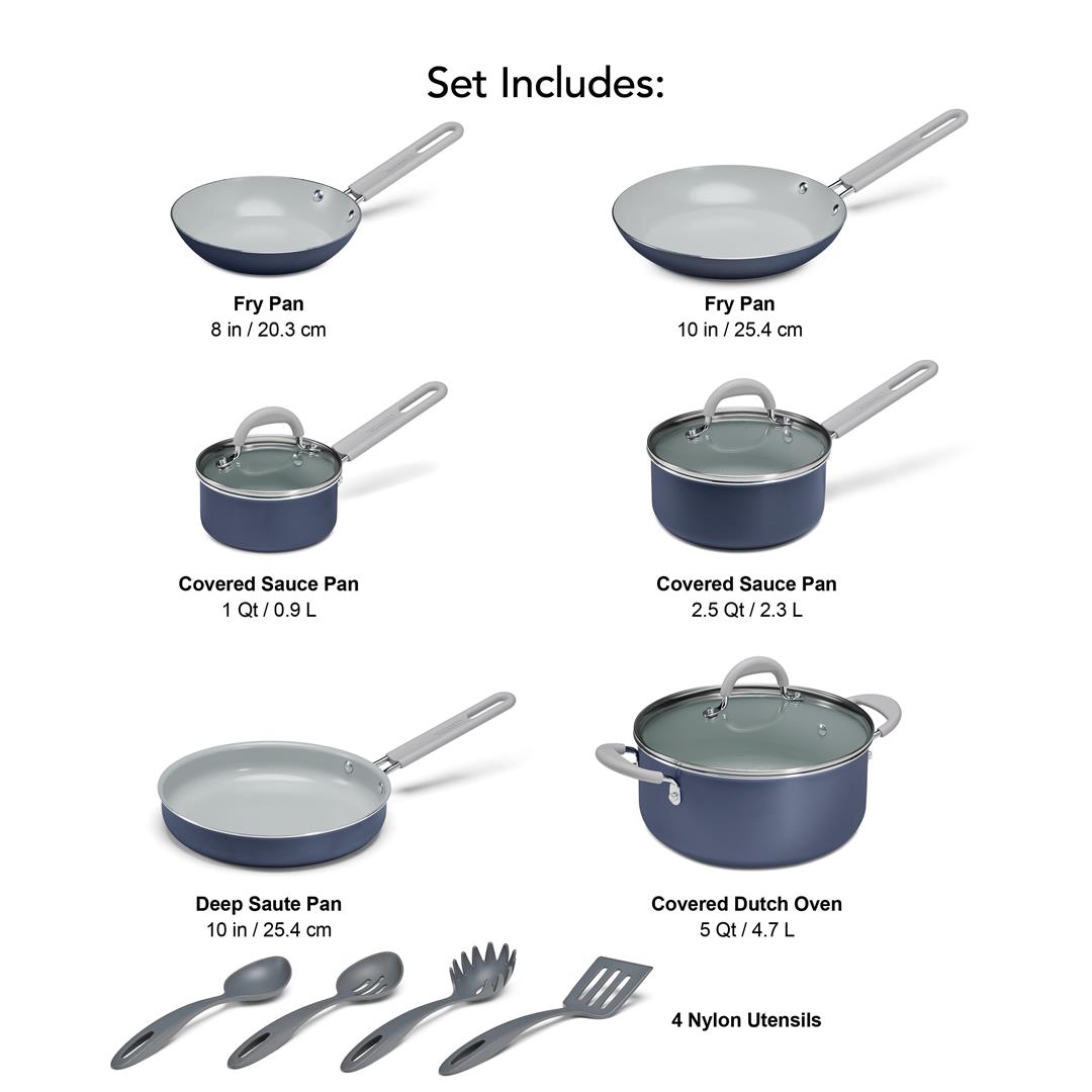 Complete 13-piece set includes an 8-inch and 10-inch saut pan, 10-inch deep saut pan, 1-quart and 2-quart covered saucepans, and a 5-quart covered Dutch oven. Ceramic nonstick interior made for easy food release and quick cleanup. Durable aluminum construction heats quickly and evenly for consistent cooking results. Versatile design works on gas, electric, and glass-top stoves. Oven-safe up to 350F for added cooking flexibility. Includes a 4-piece color-matched nylon utensil set with a solid spoon, slotted spoon, slotted turner, and pasta spoon. Interchangeable lid fits both the Dutch oven and 10-inch deep saut pan.