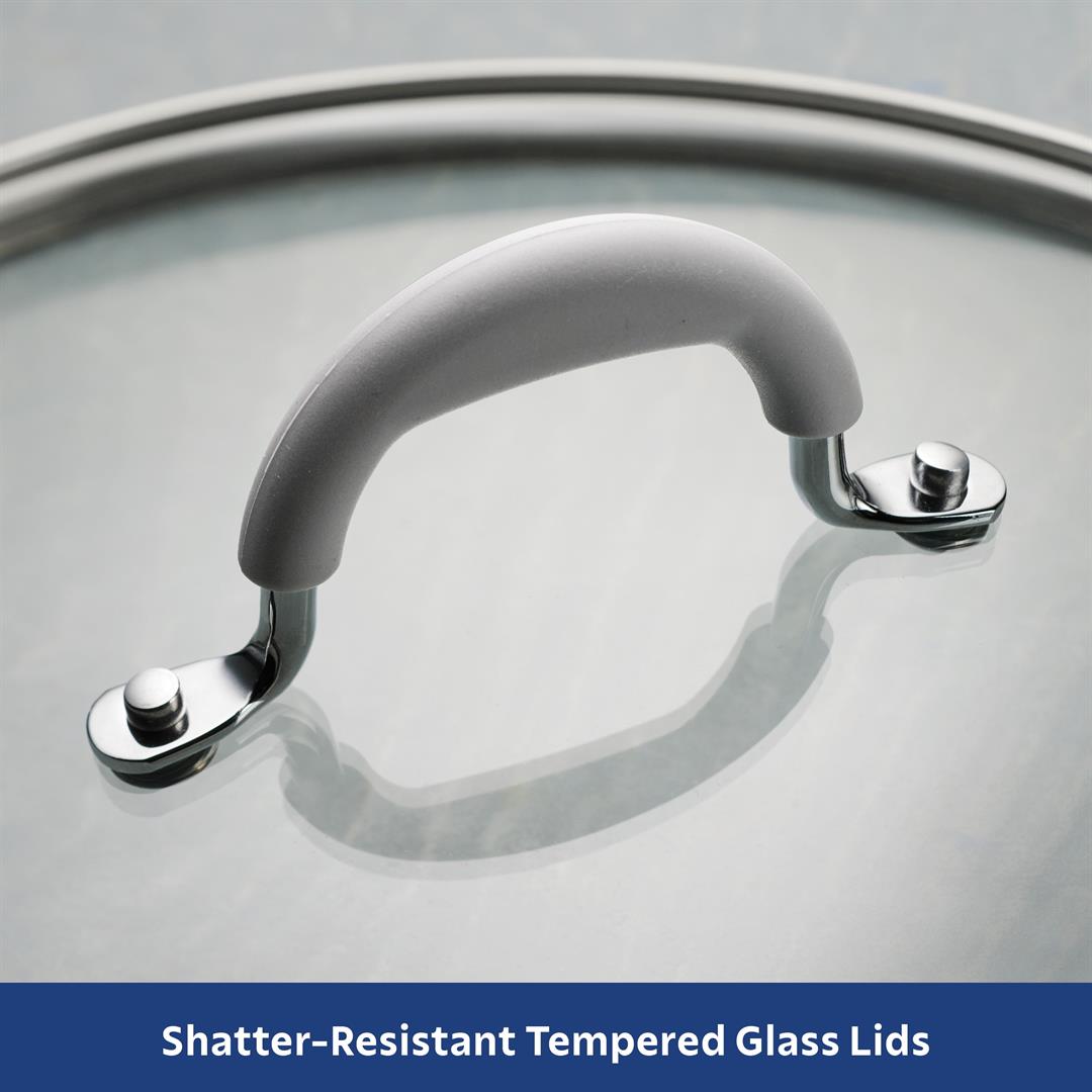 Complete 13-piece set includes an 8-inch and 10-inch saut pan, 10-inch deep saut pan, 1-quart and 2-quart covered saucepans, and a 5-quart covered Dutch oven. Ceramic nonstick interior made for easy food release and quick cleanup. Durable aluminum construction heats quickly and evenly for consistent cooking results. Versatile design works on gas, electric, and glass-top stoves. Oven-safe up to 350F for added cooking flexibility. Includes a 4-piece color-matched nylon utensil set with a solid spoon, slotted spoon, slotted turner, and pasta spoon. Interchangeable lid fits both the Dutch oven and 10-inch deep saut pan.