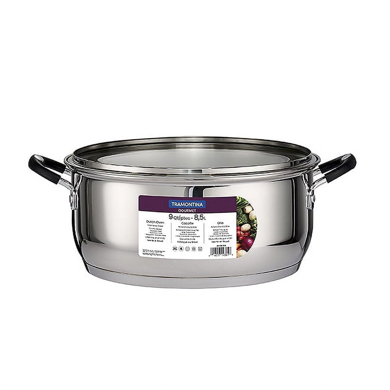 Tramontina’s Gourmet Stainless Steel 9 Qt. Covered Dutch Oven is a must have for making large batches of soups, stews and chili, boiling seafood, or slow-cooking large cuts of meat. The induction-ready tri-ply base distributes heat quickly and evenly, while the heat- and shatter-resistant glass lid allows you to monitor your cooking progress. Ergonomically designed, riveted, soft-grip silicone handles ensure a comfortable grip and provide added support when handling a filled pot. Dishwasher-safe Combine it with other Tramontina pots and pans (sold separately)